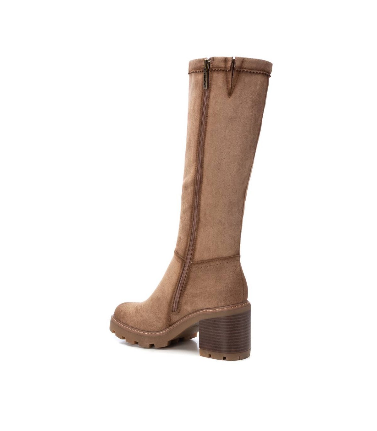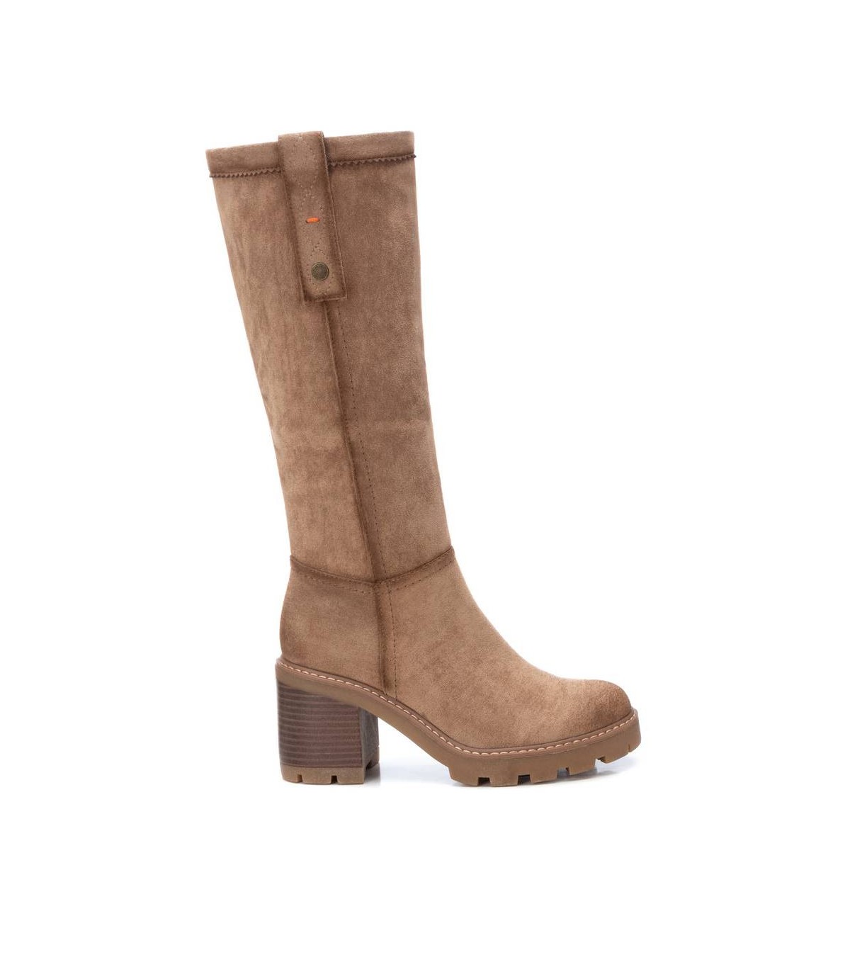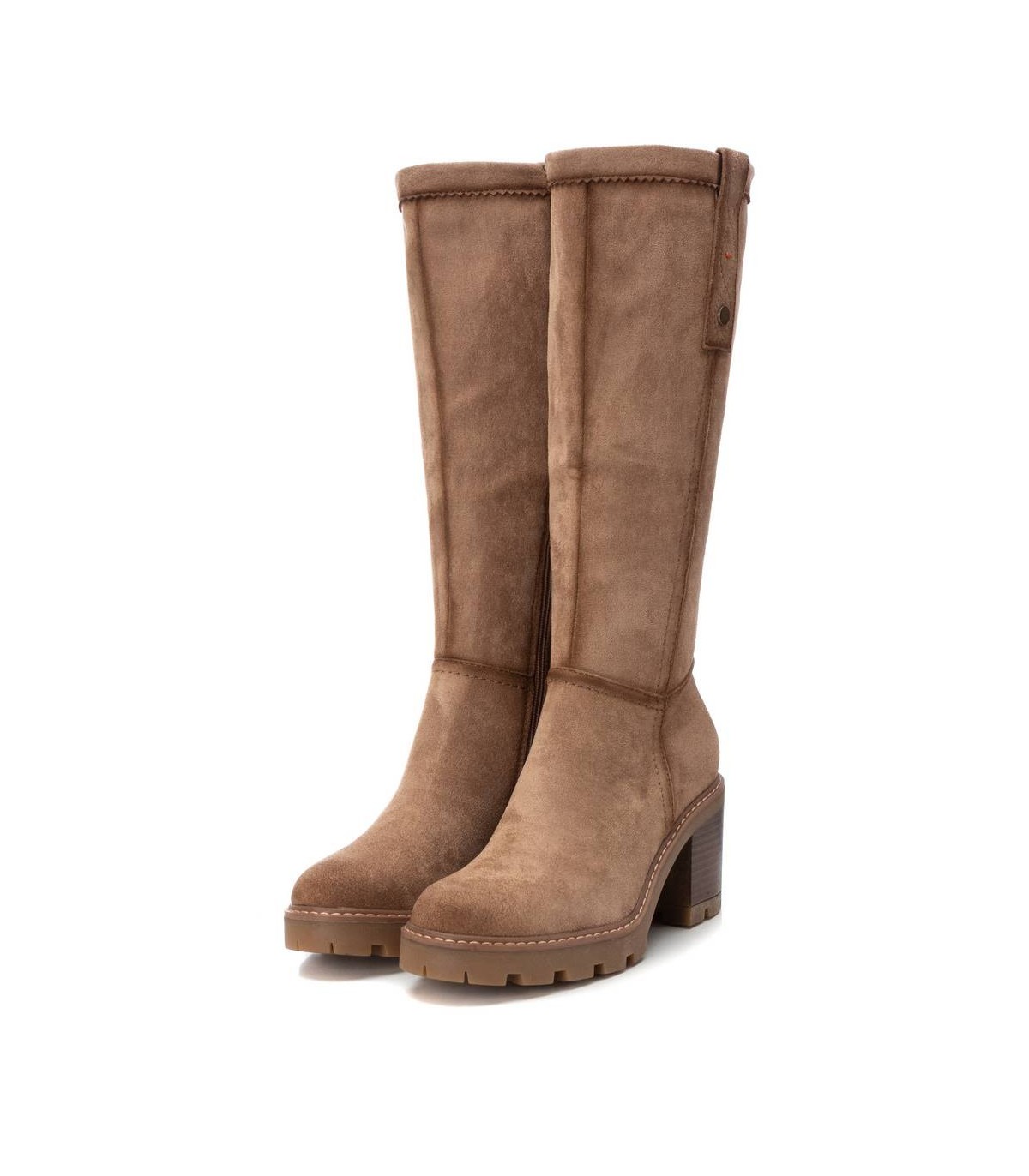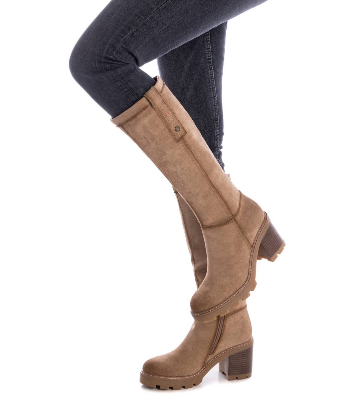 Bota de mujer, de la marca Refresh. Fabricado en una suave antelina. Caña 35 cm. Cierre mediante cremallera lateral. Suela track antideslizante con un tacón de 8 cm y plataforma para mayor comodidad. Este modelo ha obtenido el certificado vegano por la organización mundial PETA (Organización de los derechos de los animales).