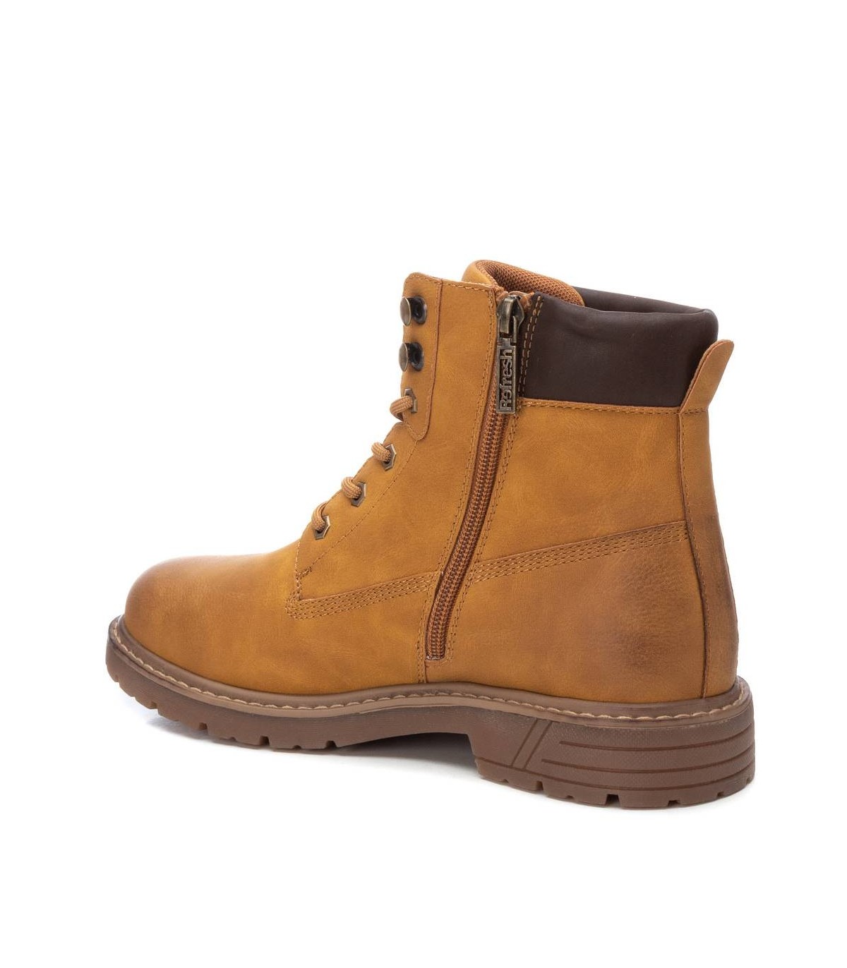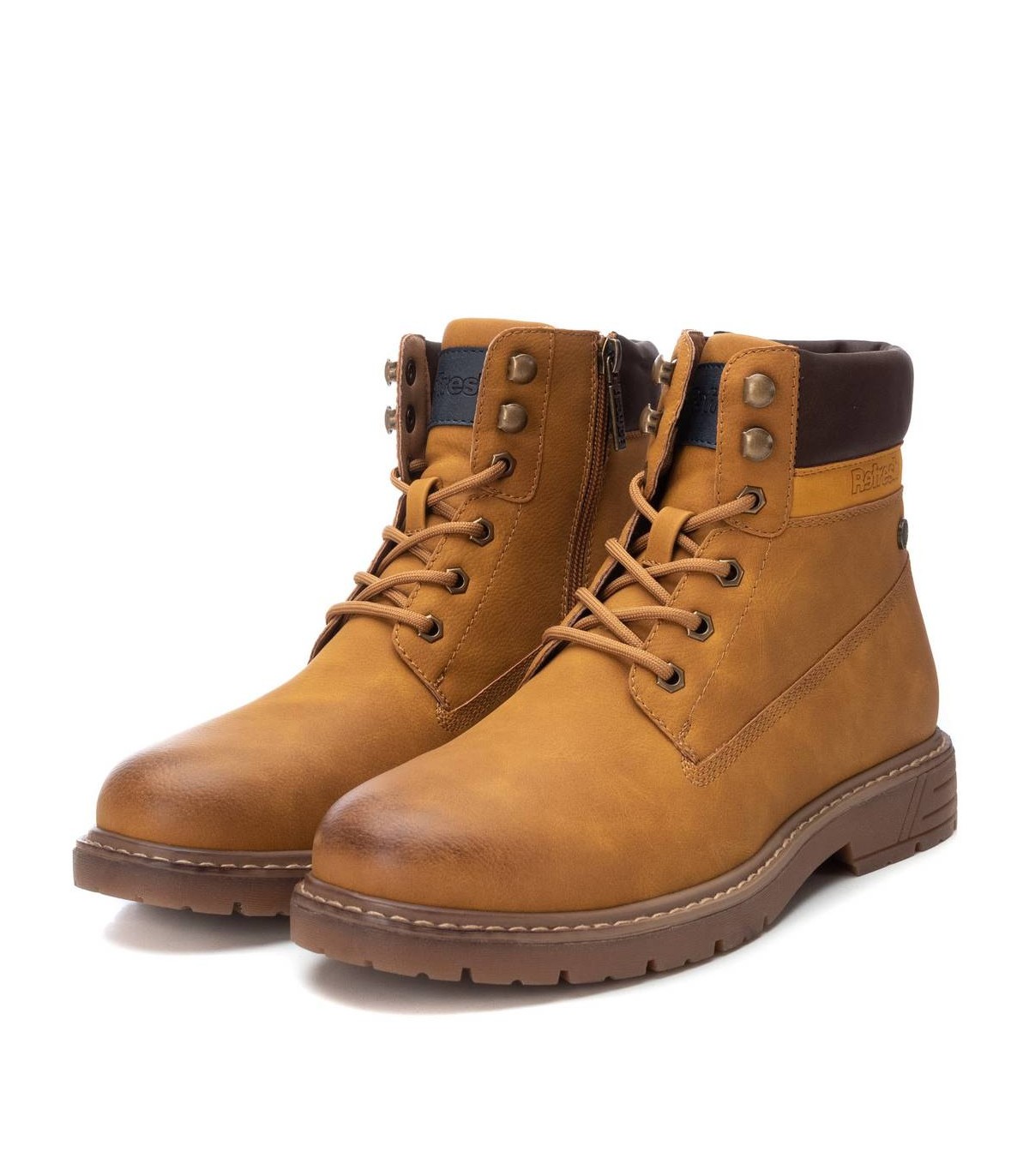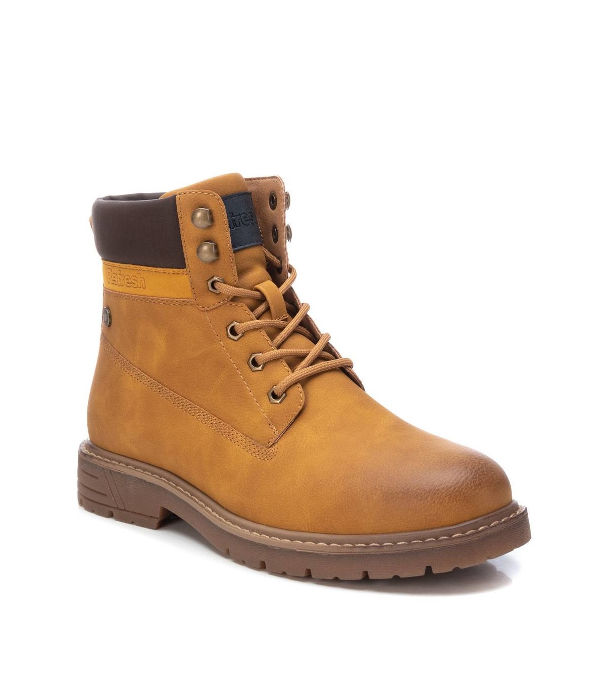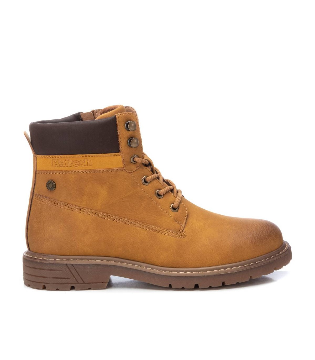 Botín de hombre, de la marca Refresh. Fabricado en un material que imita la piel. Cierre mediante cremallera lateral y cordones para un mayor ajuste. Modelo estilo montañero con cómoda suela de goma antideslizante. Este modelo ha obtenido el certificado vegano por la organización mundial PETA (Organización de los derechos de los animales).