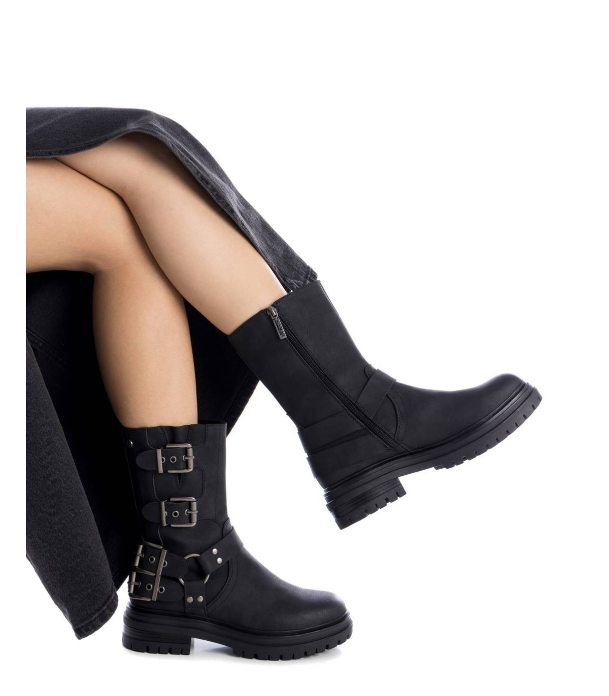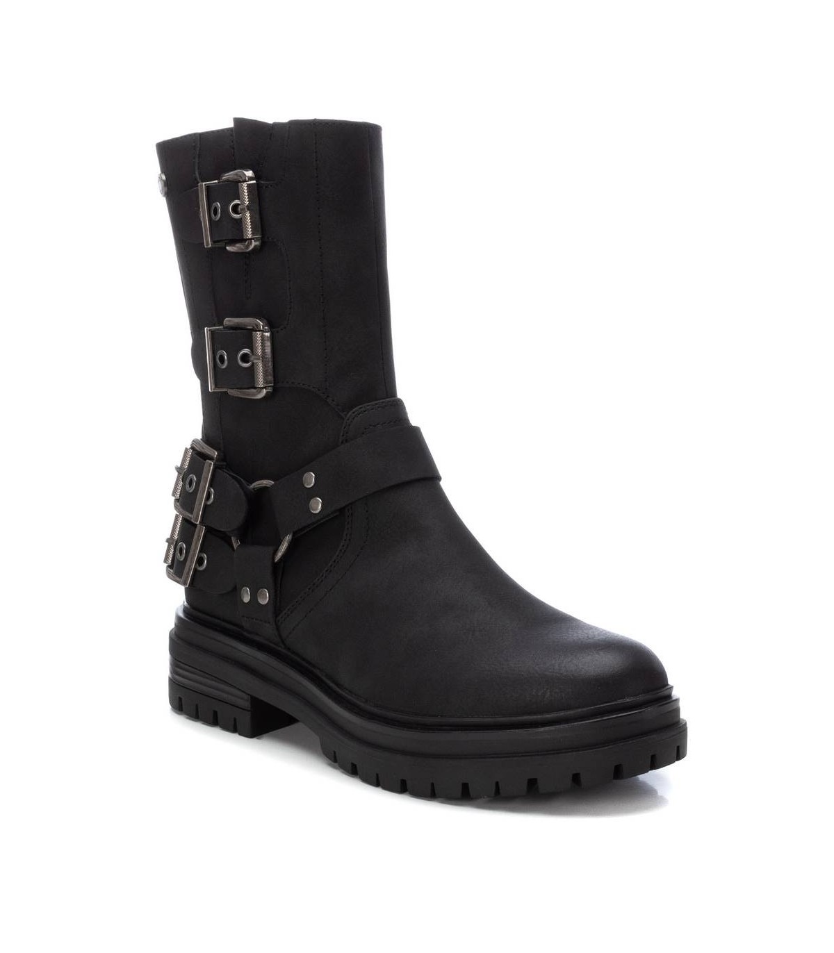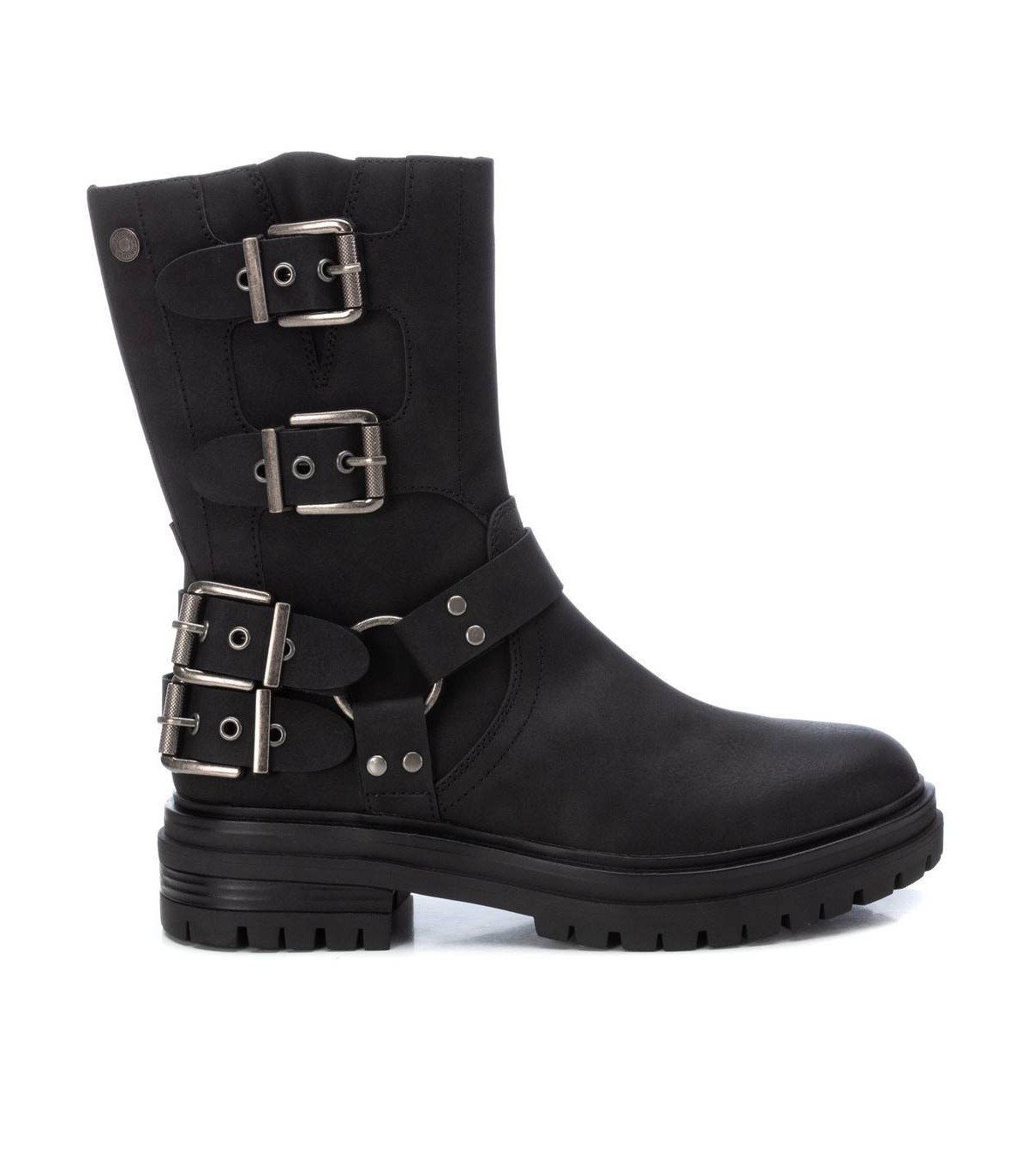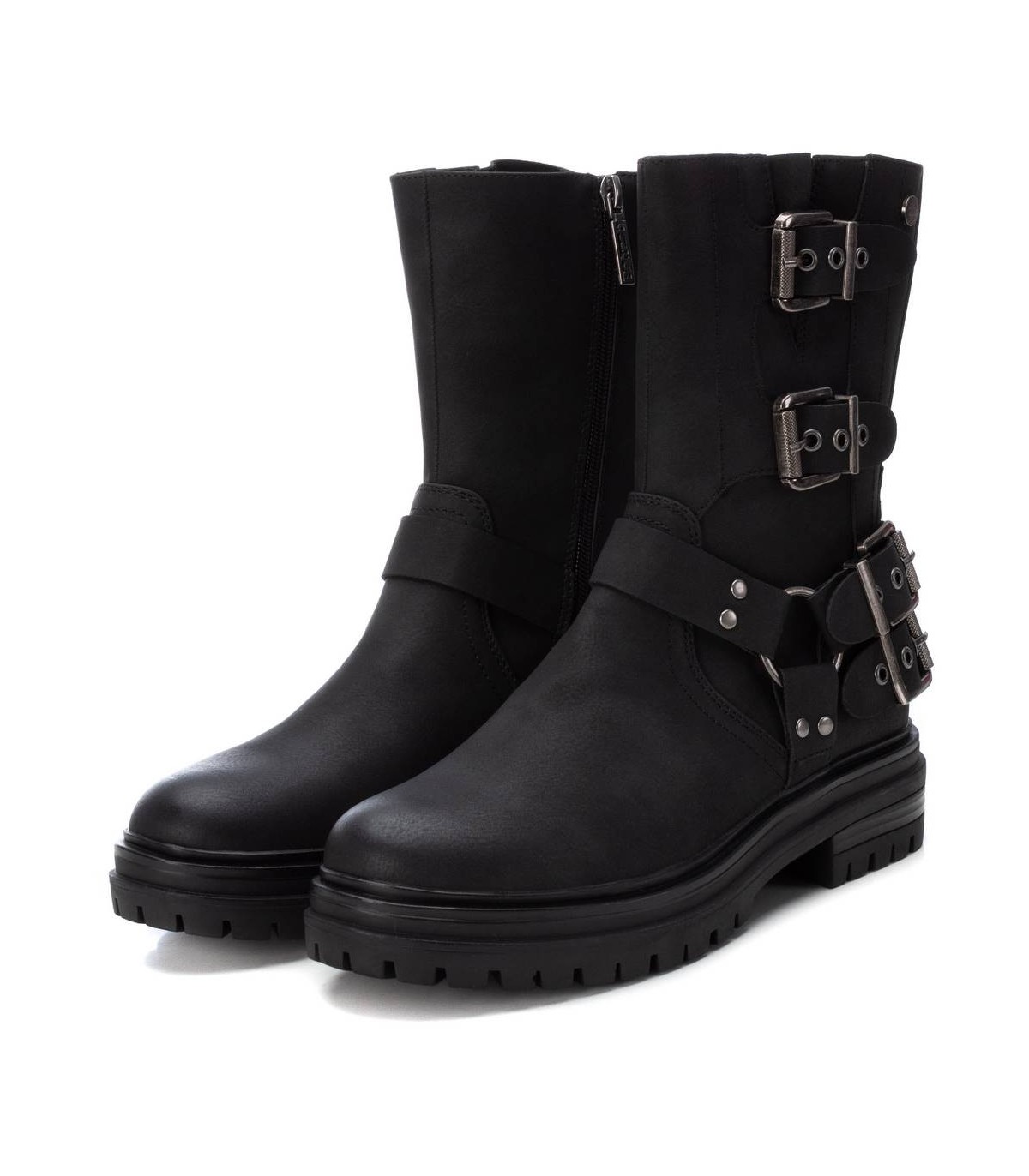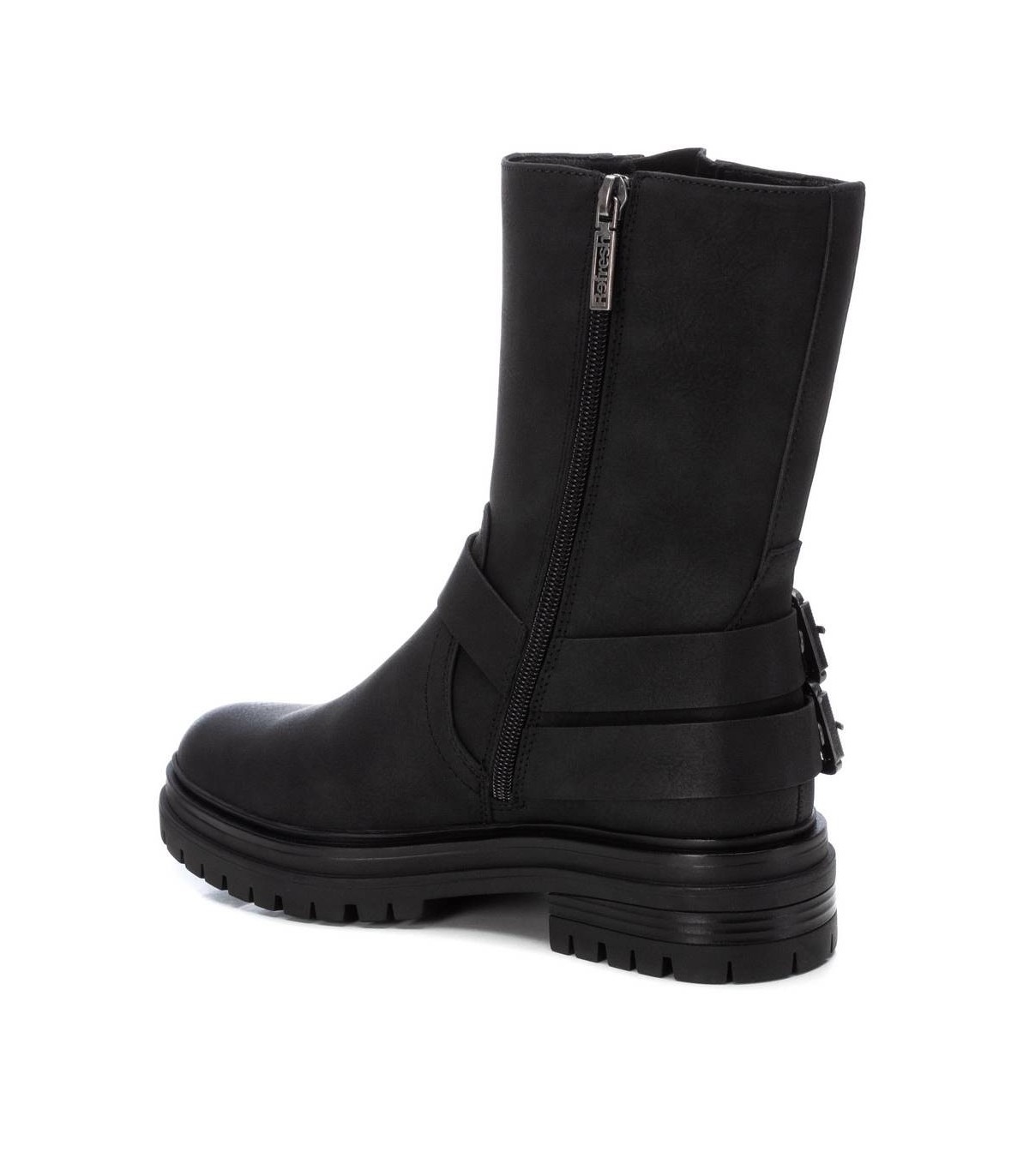 Botín de mujer, de la marca Refresh. Fabricado en un material que imita la piel. Modelo en tendencia para elevar tus looks de invierno. Correas decorativas con hebillas en metal. Suela gruesa y dentada antideslizante. Este modelo ha obtenido el certificado vegano por la organización mundial PETA (Organización de los derechos de los animales).
