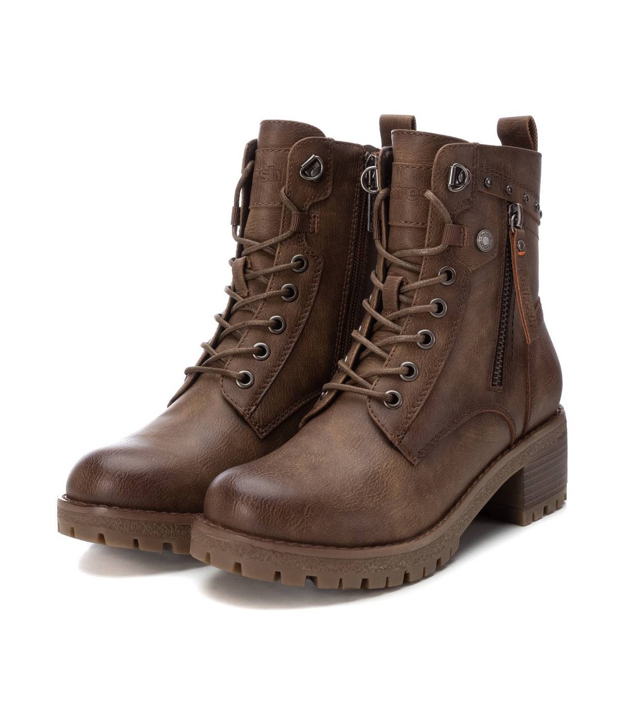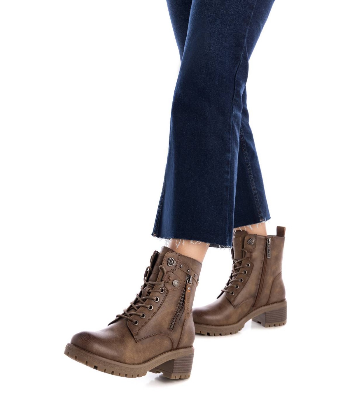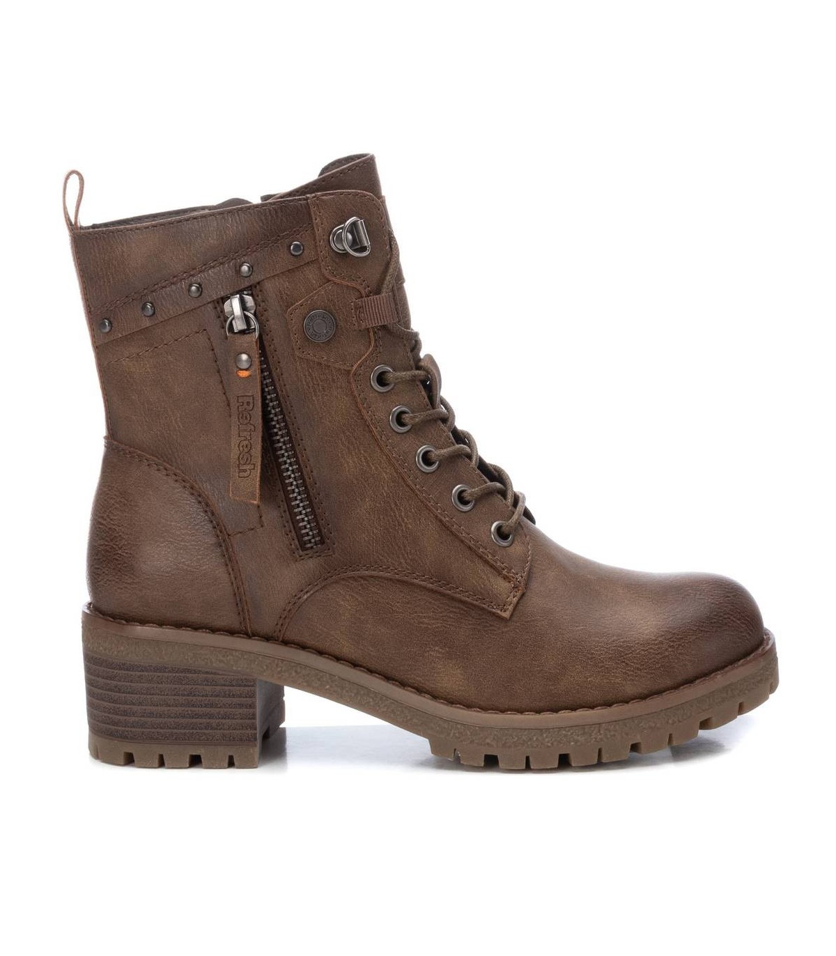 Botín de mujer, de la marca Refresh. Fabricado en un material que imita la piel. Cierre lateral mediante cremallera y cordones ajustables para mayor sujeción. Tirador trasero para facilitar la puesta. Suela de goma track antideslizante. Un modelo básico para tu armario de invierno. Este modelo ha obtenido el certificado vegano por la organización mundial PETA (Organización de los derechos de los animales).