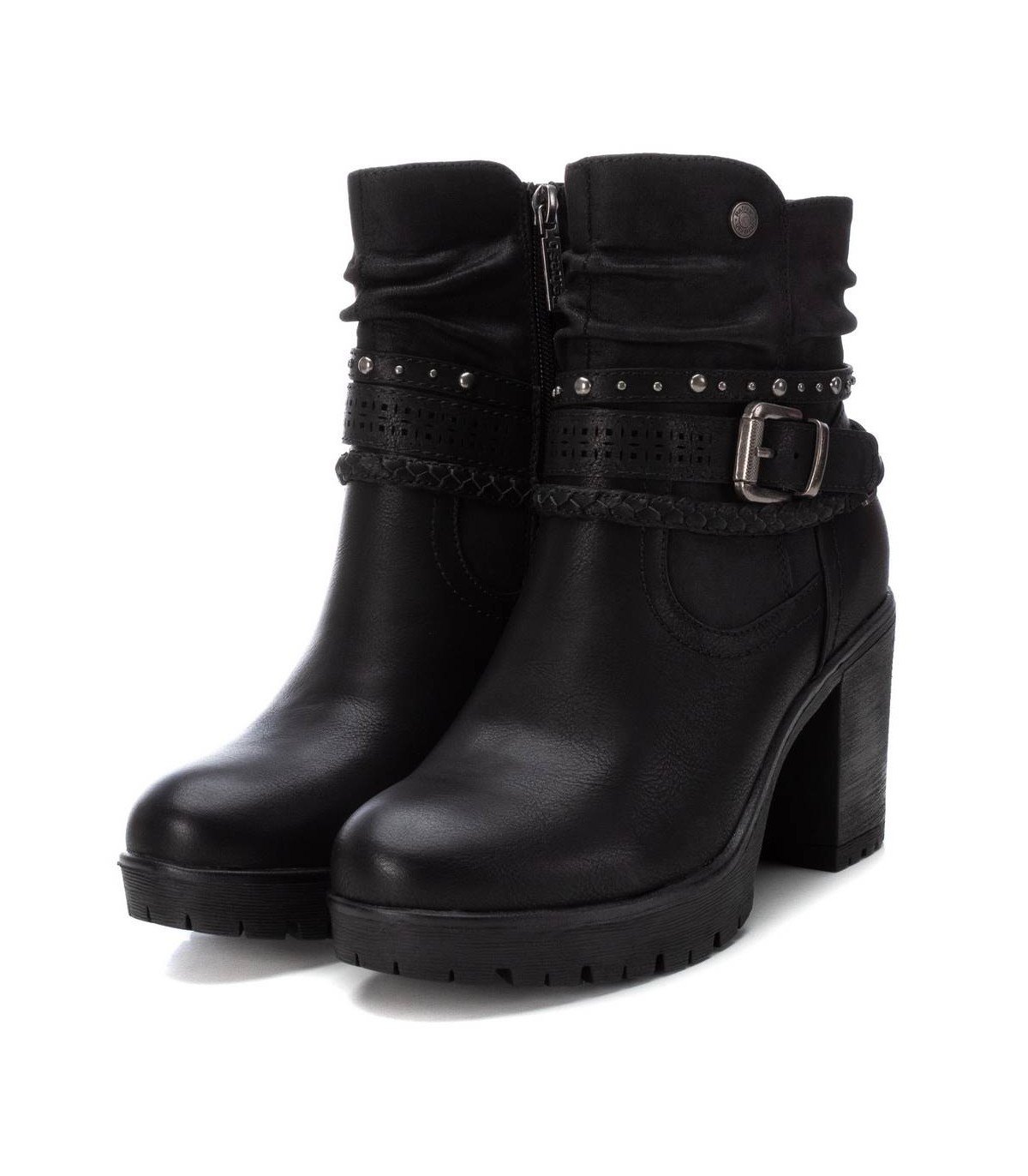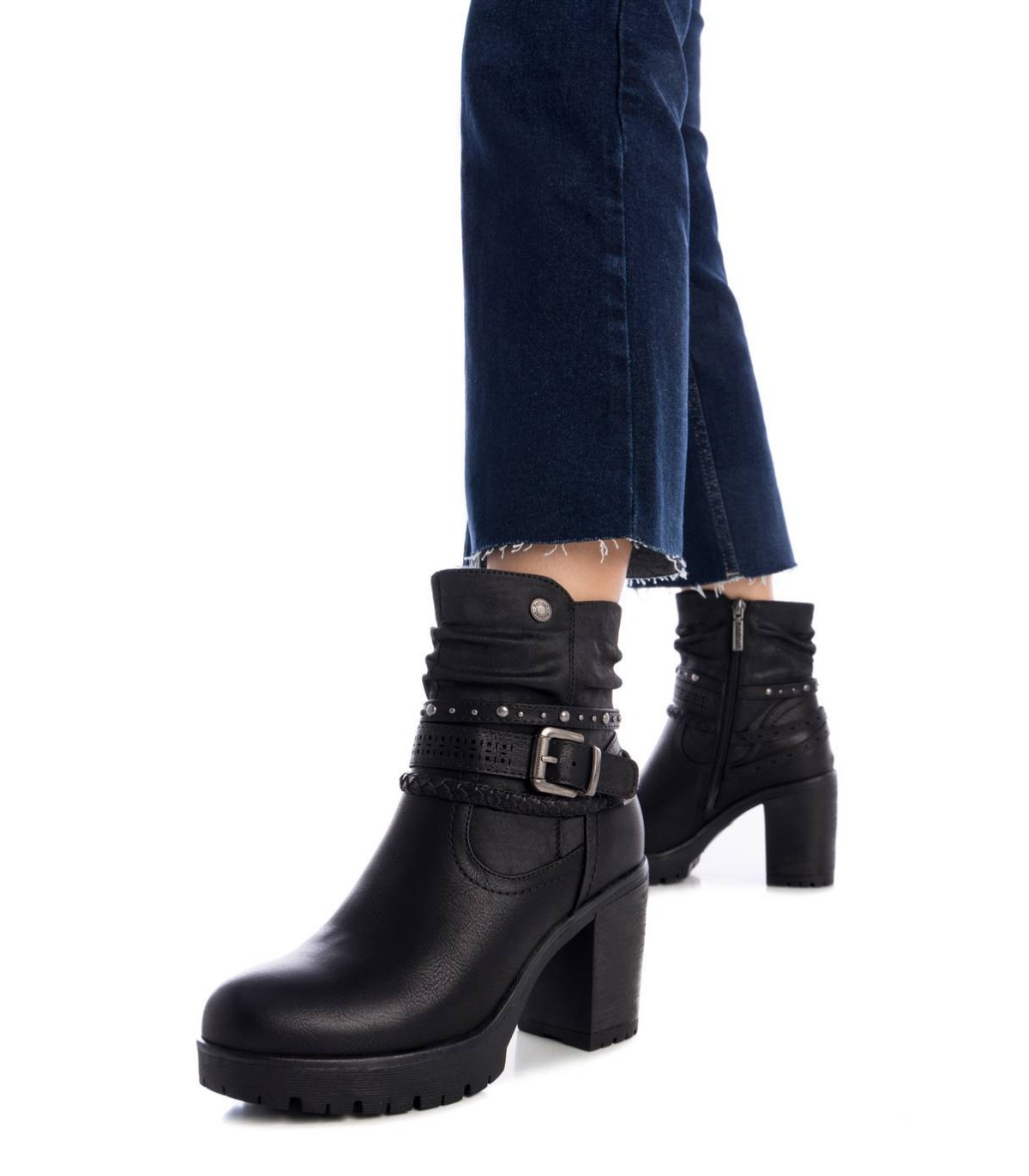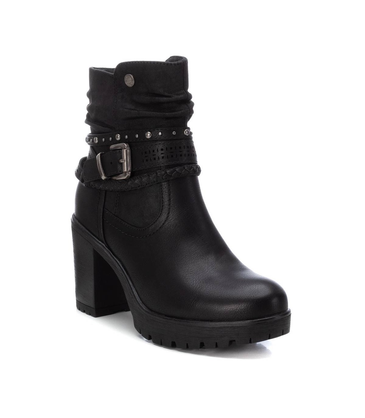 Botín de mujer, de la marca Refresh. Fabricado en un material que imita la piel. Cierre mediante cremallera lateral. Correas decorativas con detalles metálicos. Tacón de 9 cm con plataforma gruesa para mayor comodidad. Eleva tus looks de invierno con este modelo. Este modelo ha obtenido el certificado vegano por la organización mundial PETA (Organización de los derechos de los animales).