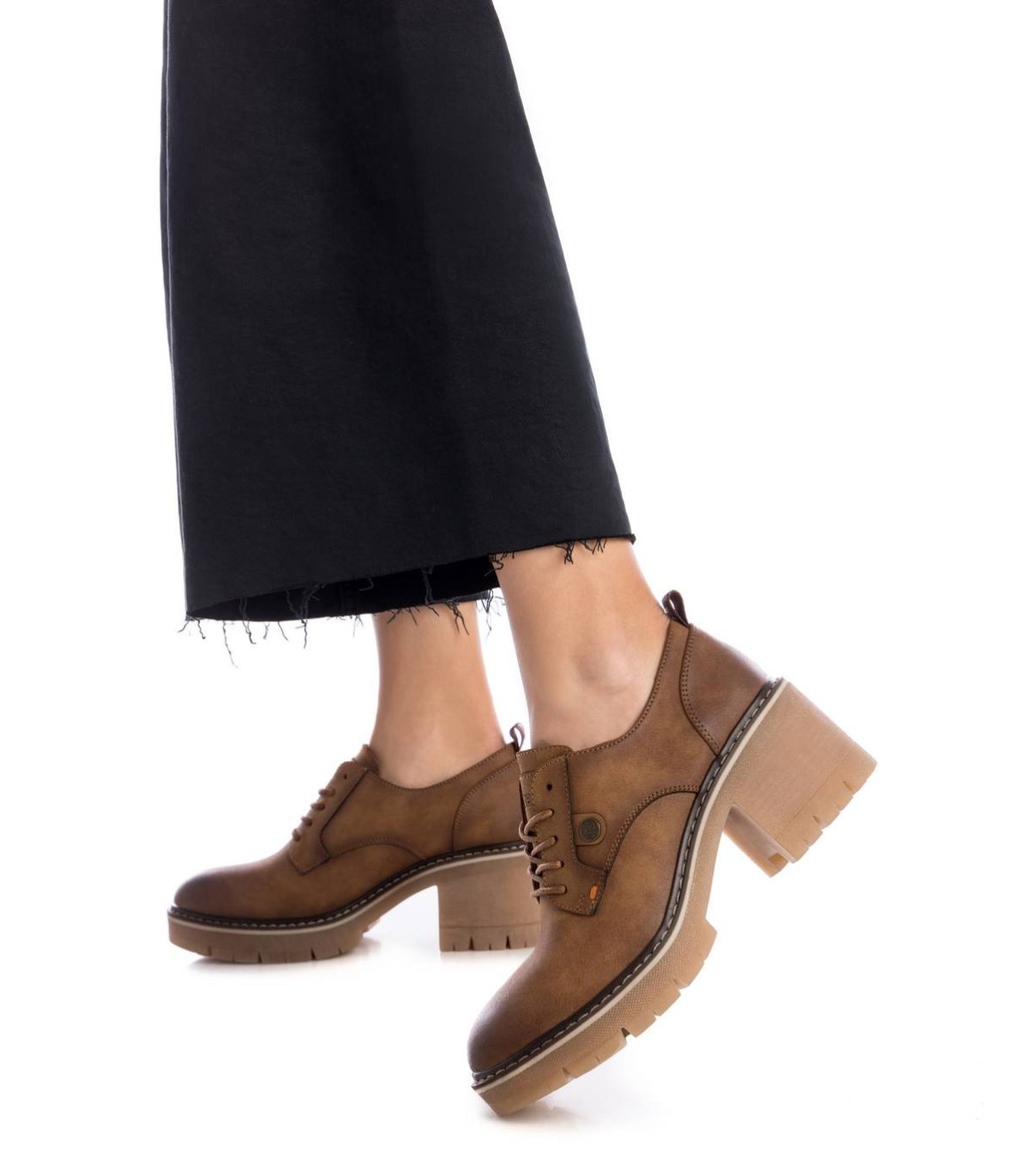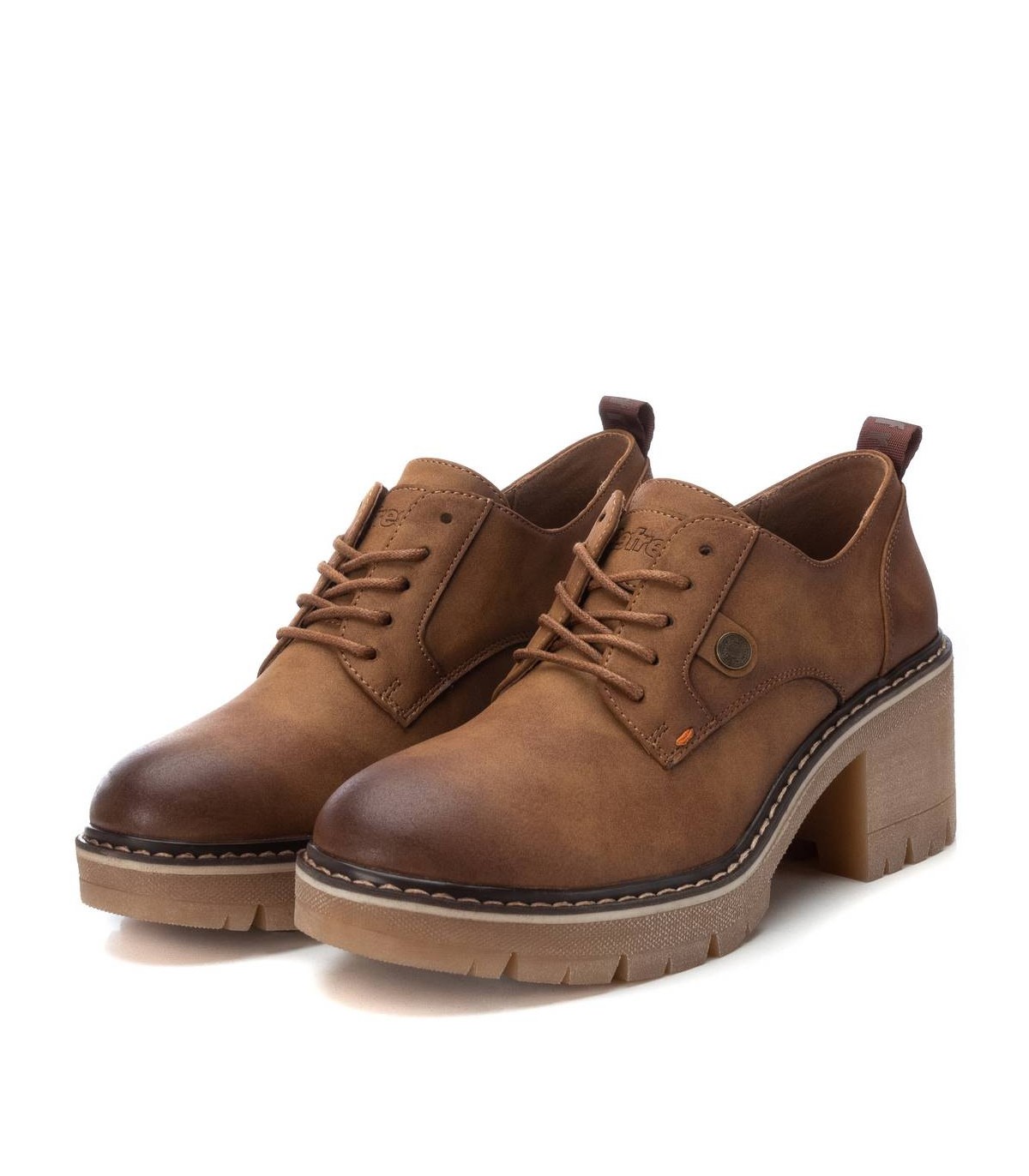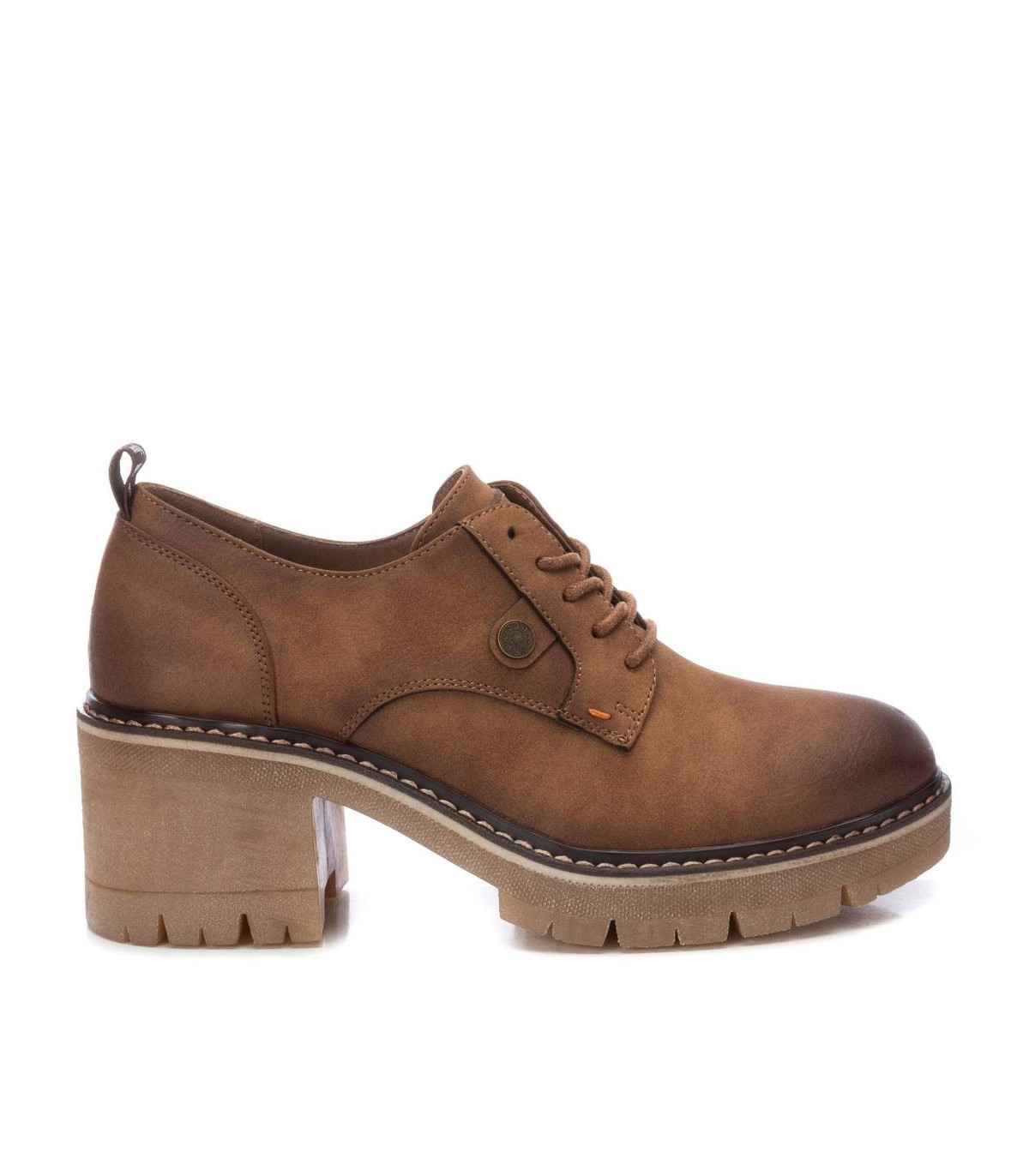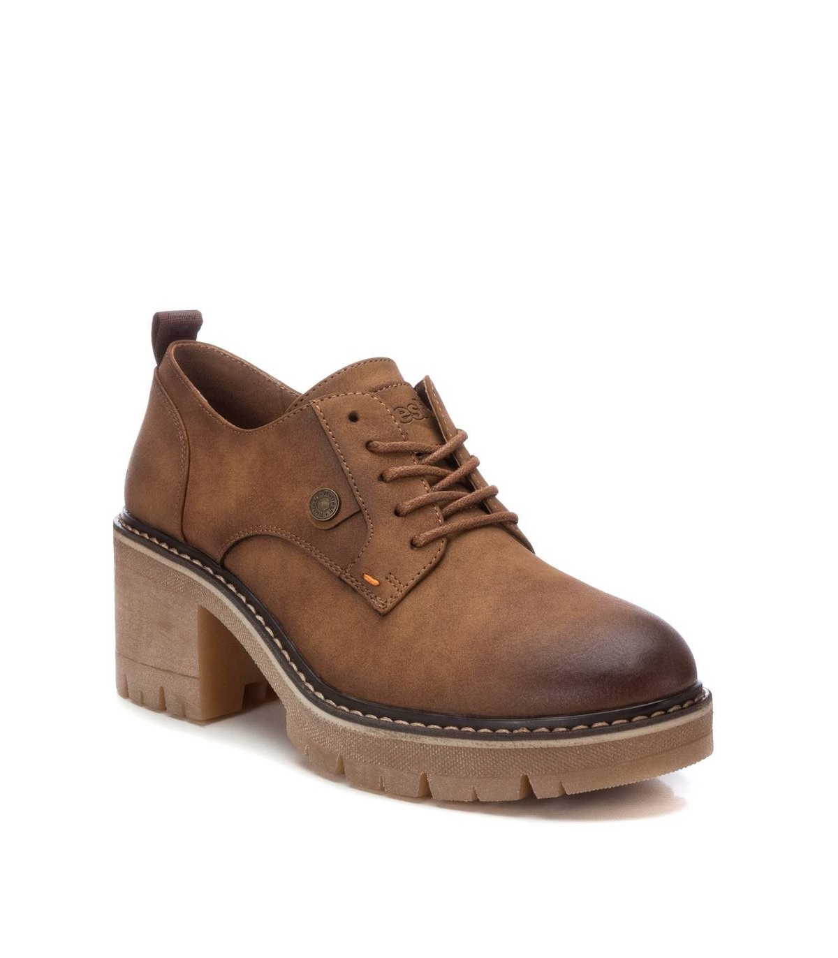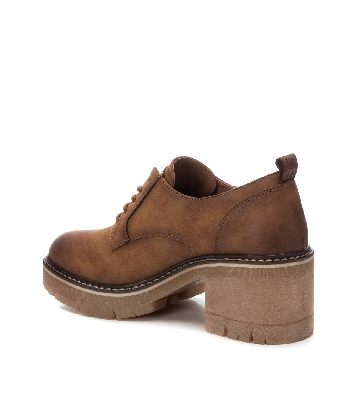 Mocasín de mujer, de la marca Refresh. Fabricado en un material que imita la piel. Cierre mediante cordones. Tirador trasero para facilitar la puesta. Suela track antideslizante y tacón grueso con plataforma para mayor comodidad. Este modelo ha obtenido el certificado vegano por la organización mundial PETA (Organización de los derechos de los animales).