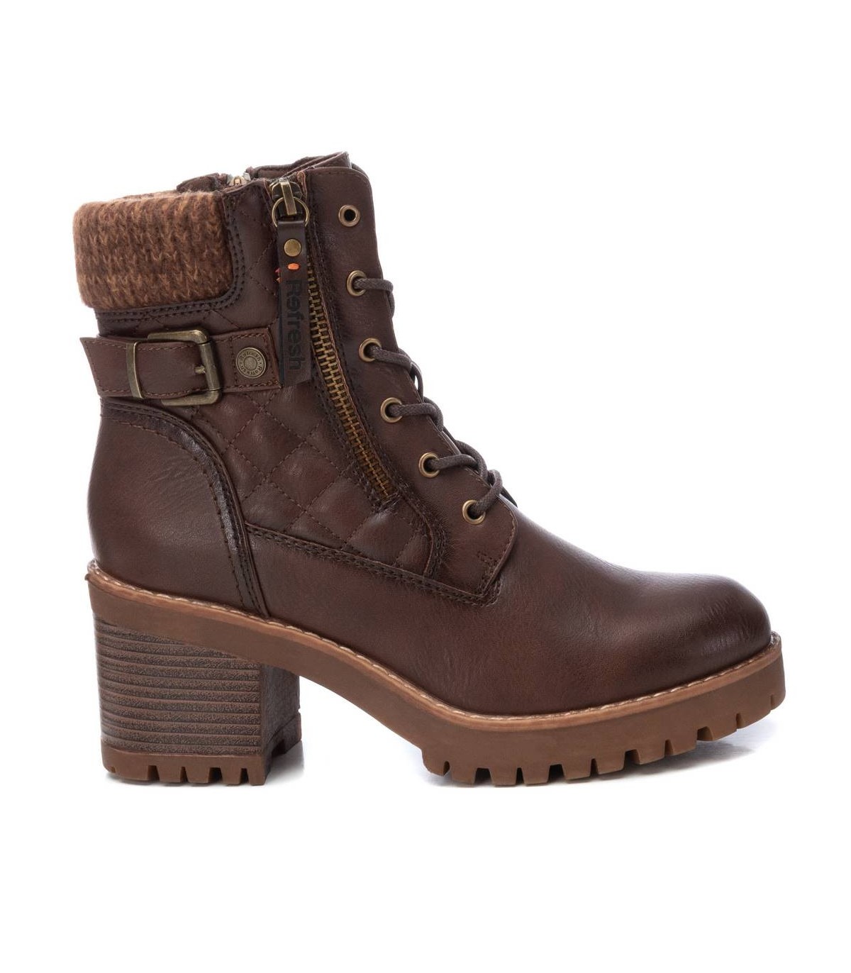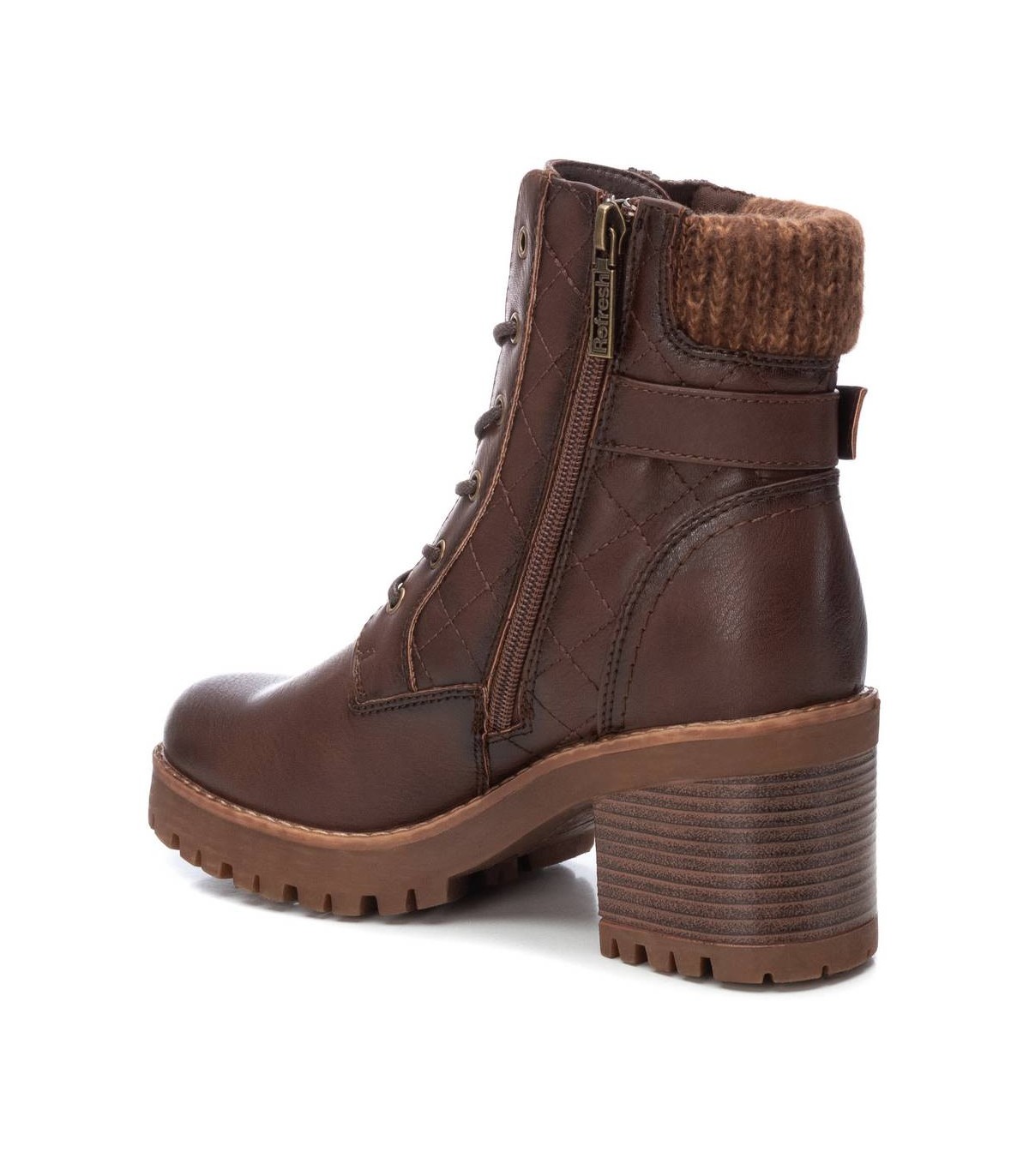 Botín de mujer, de la marca Refresh. Fabricado en material que imita la piel. Cierre mediante cremallera lateral y cordones para mayor ajuste y comodidad. Correa con hebilla decorativa. Collarín de pelito, para dar un toque montañero. Piso track con 8 cm y plataforma delantera para mayor comodidad. Este modelo ha obtenido el certificado vegano por la organización mundial PETA (Organización de los derechos de los animales).