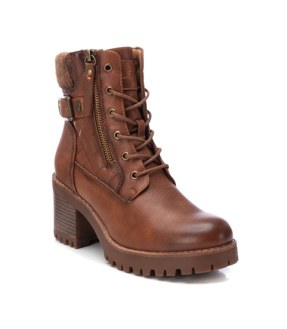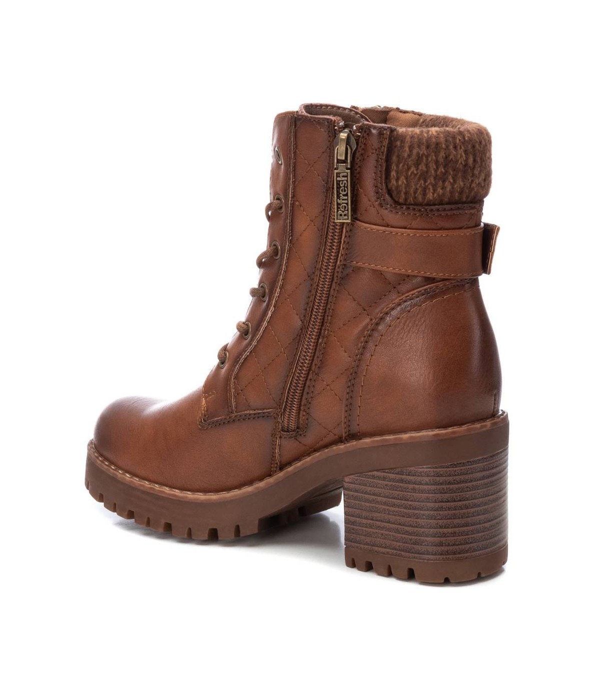 Botín de mujer, de la marca Refresh. Fabricado en material que imita la piel. Cierre mediante cremallera lateral y cordones para mayor ajuste y comodidad. Correa con hebilla decorativa. Collarín de pelito, para dar un toque montañero. Piso track con 8 cm y plataforma delantera para mayor comodidad. Este modelo ha obtenido el certificado vegano por la organización mundial PETA (Organización de los derechos de los animales).