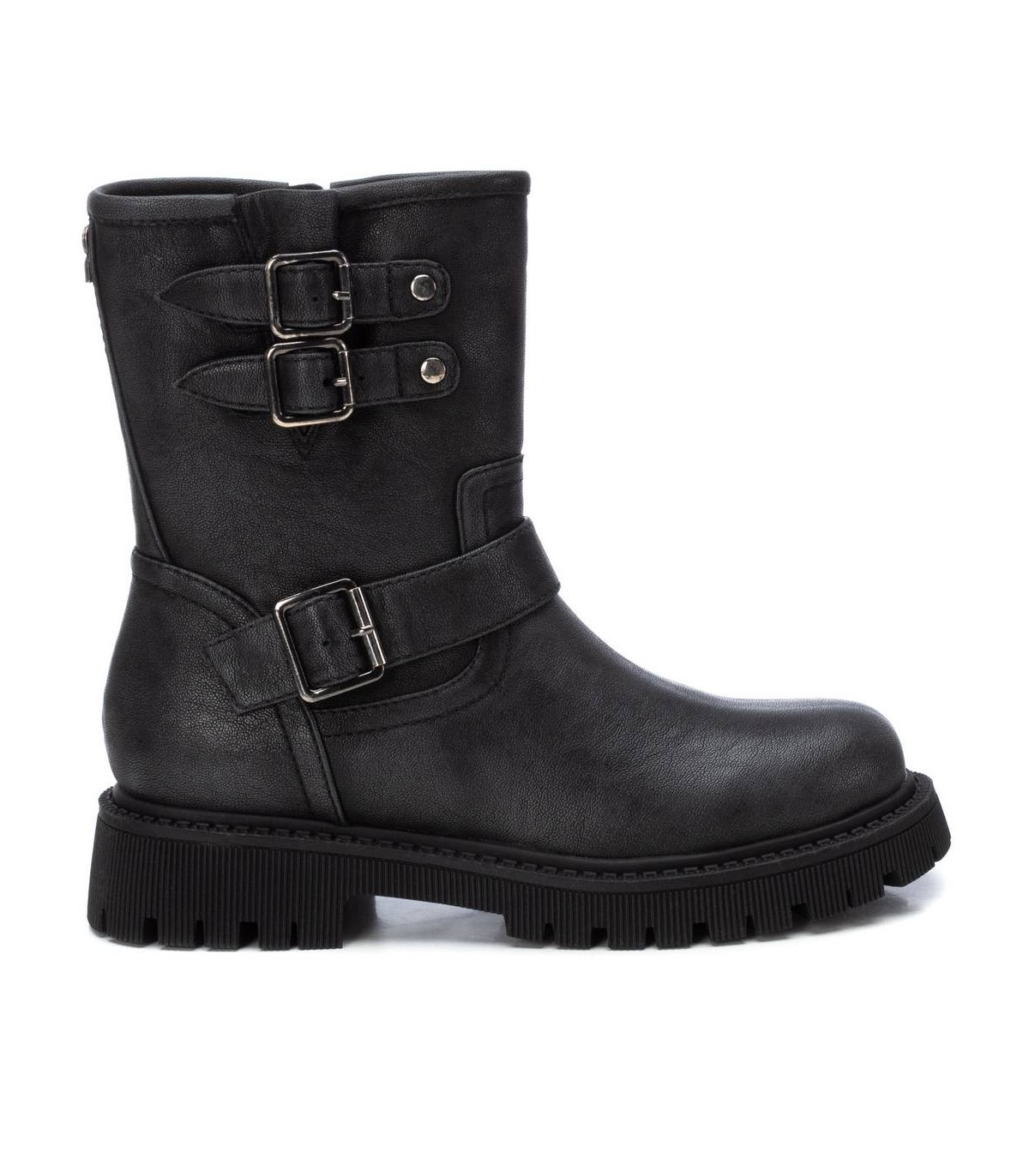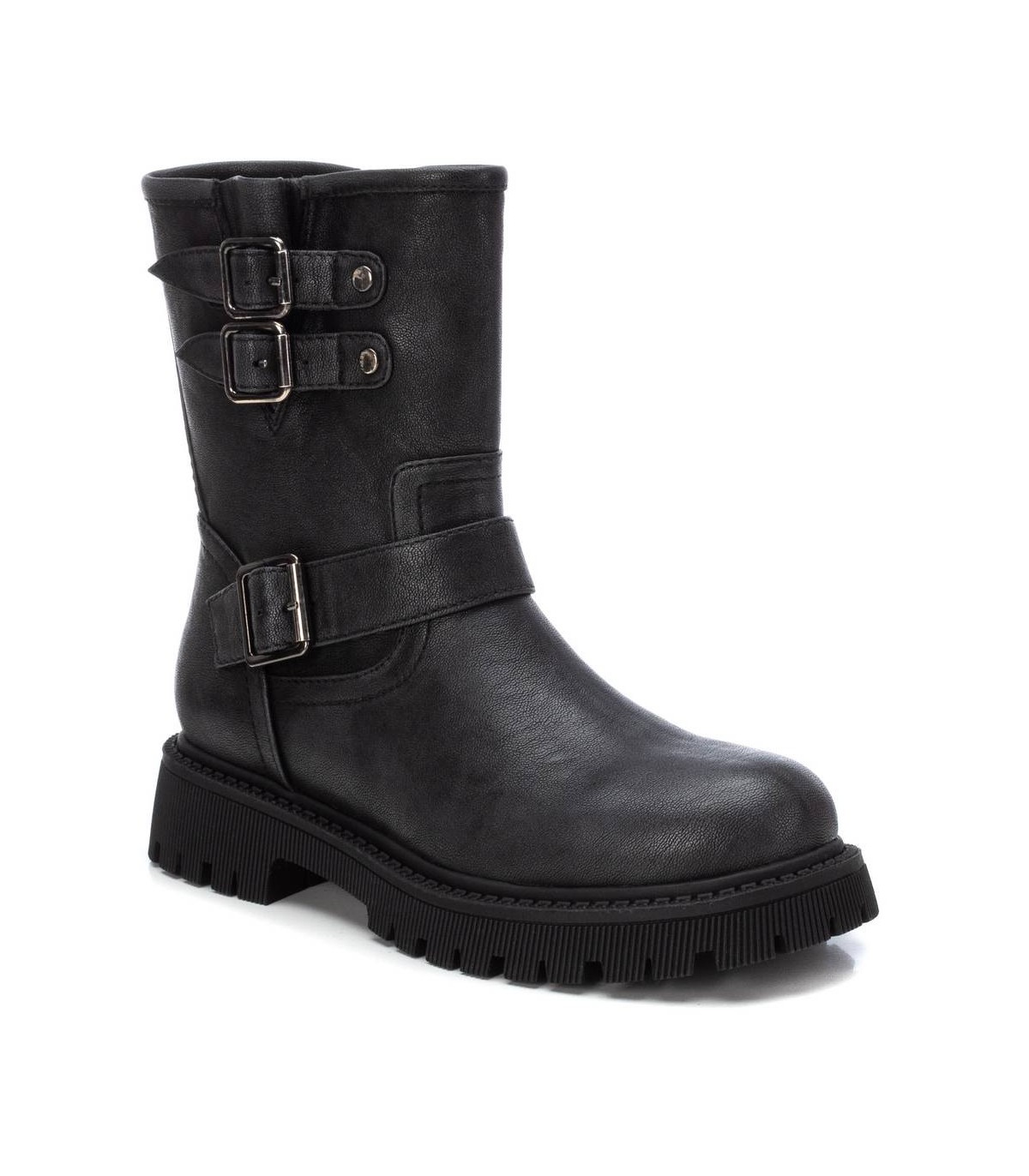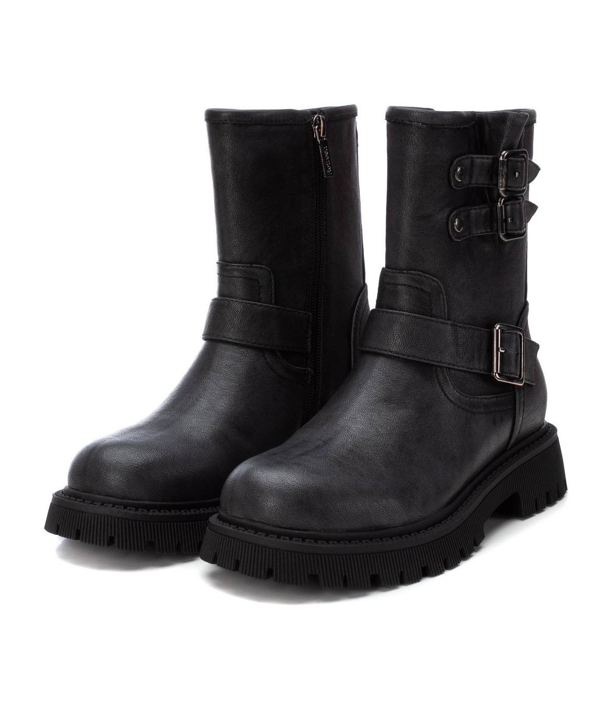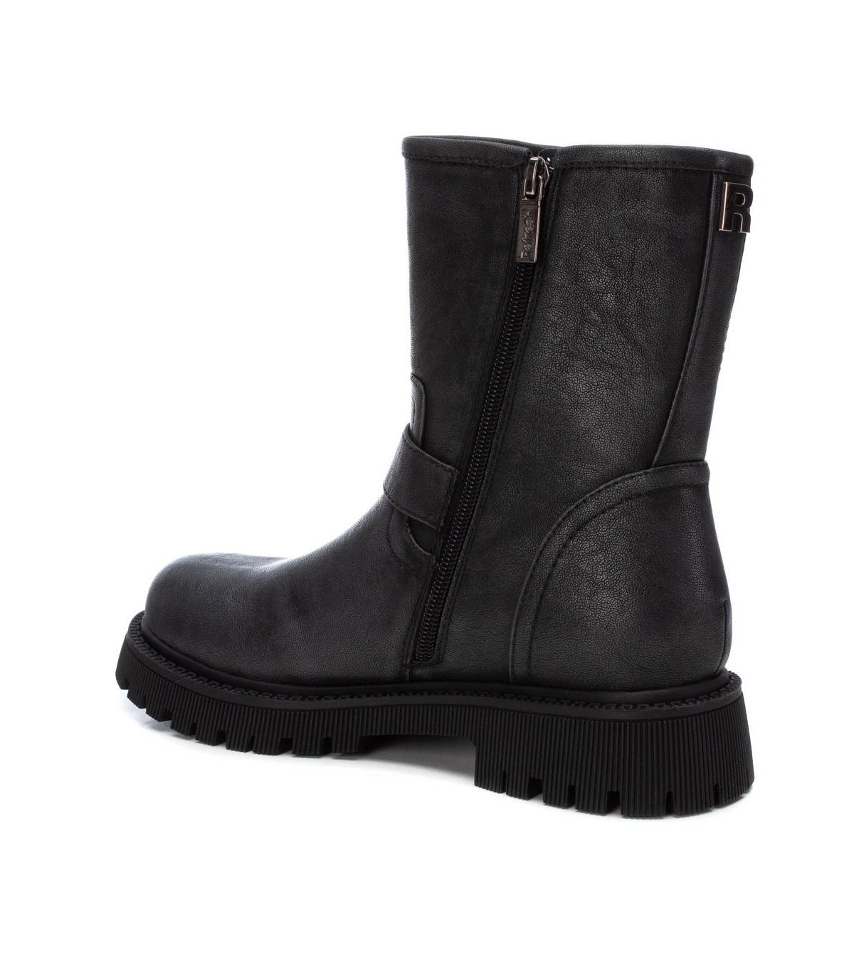 Botín de mujer, de la marca Refresh. Fabricado en un material que imita la piel. Cierre mediante cremallera lateral. Correas con hebillas decorativas. Suela de goma antideslizante. Este modelo ha obtenido el certificado vegano por la organización mundial PETA (Organización de los derechos de los animales).