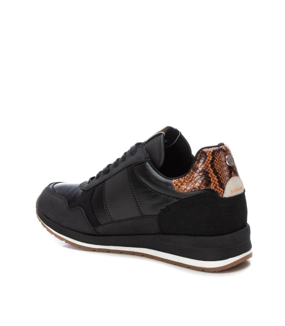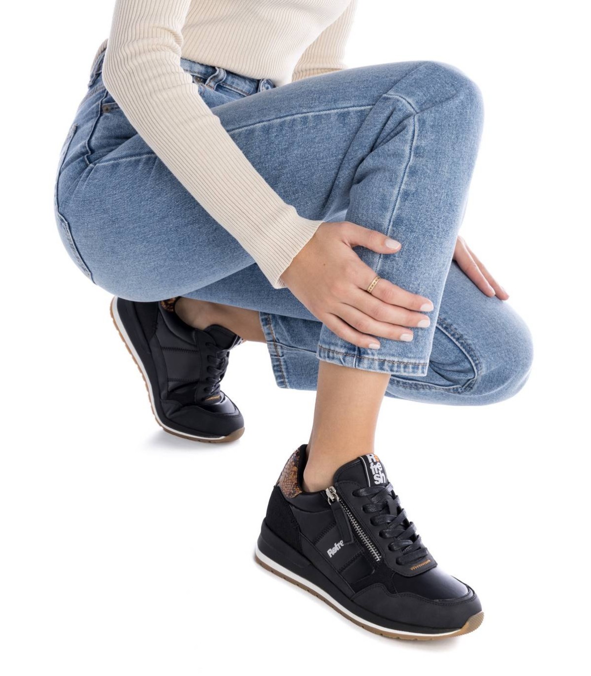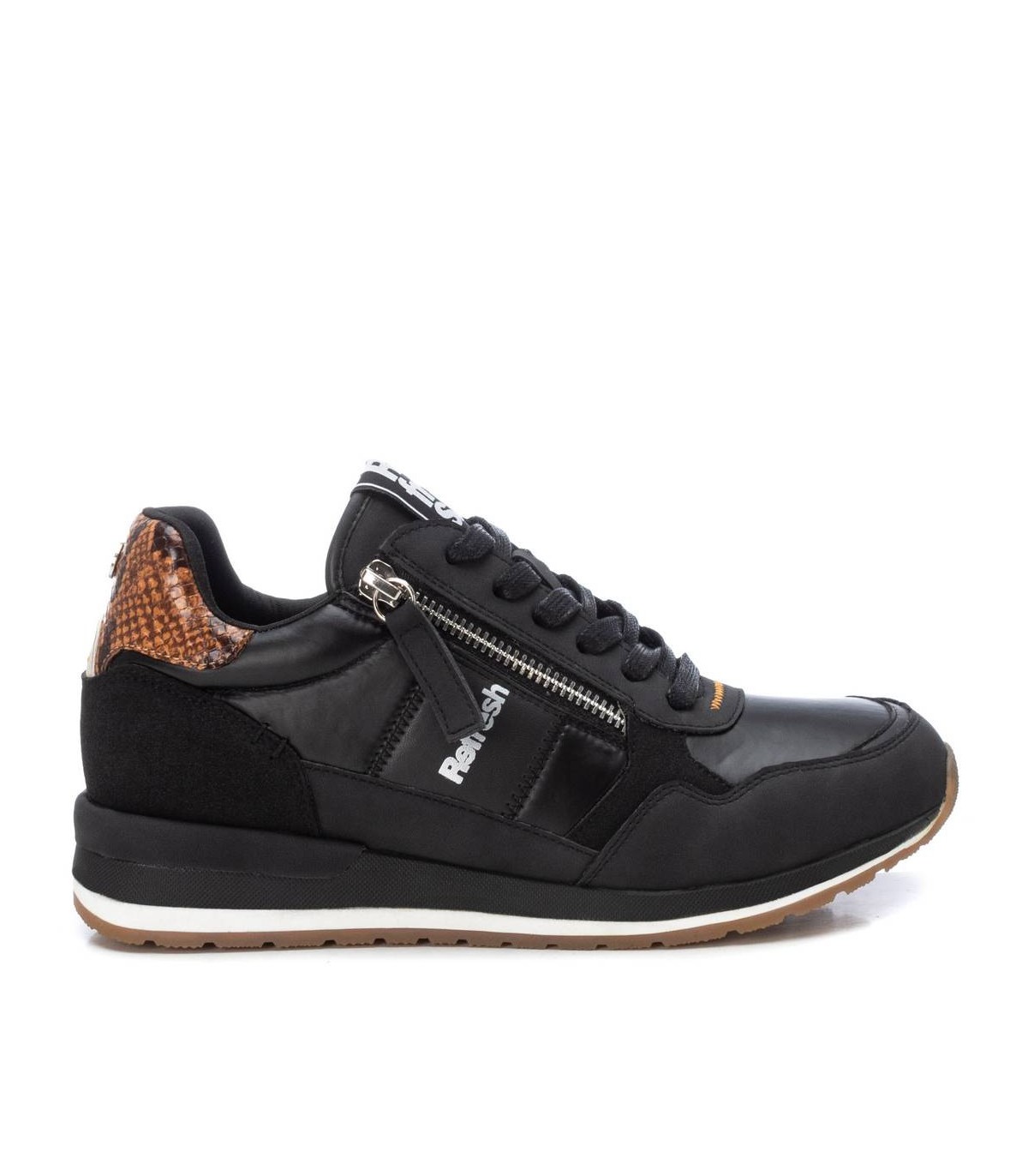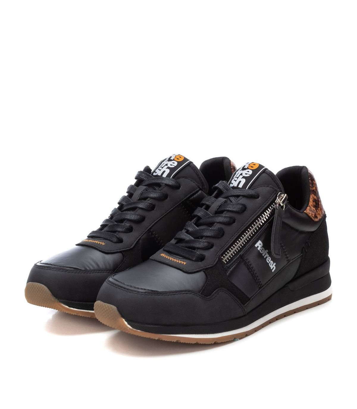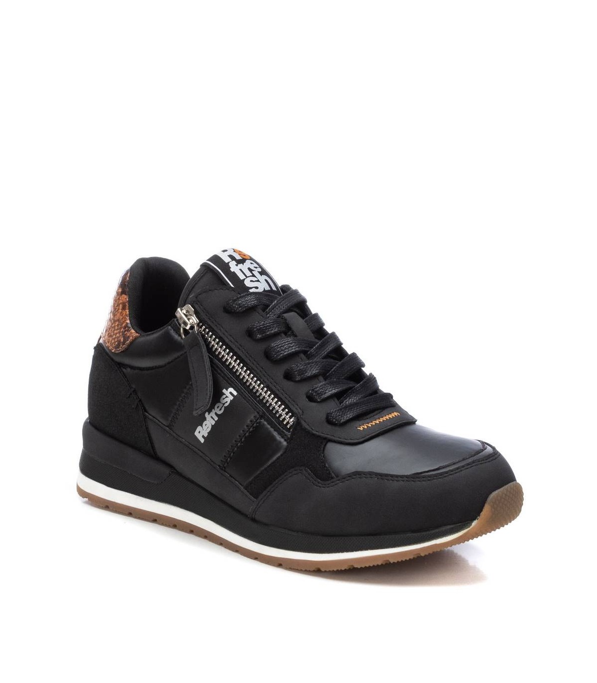 Zapatilla de mujer de la marca Refresh. Fabricada combinando nylon y antelina, con detalle animal print. Cremallera lateral funcional para facilitar la puesta. Con plantilla extraíble. Cordones regulables. Este modelo ha obtenido el certificado vegano por la organización mundial PETA (Organización de los derechos de los animales).