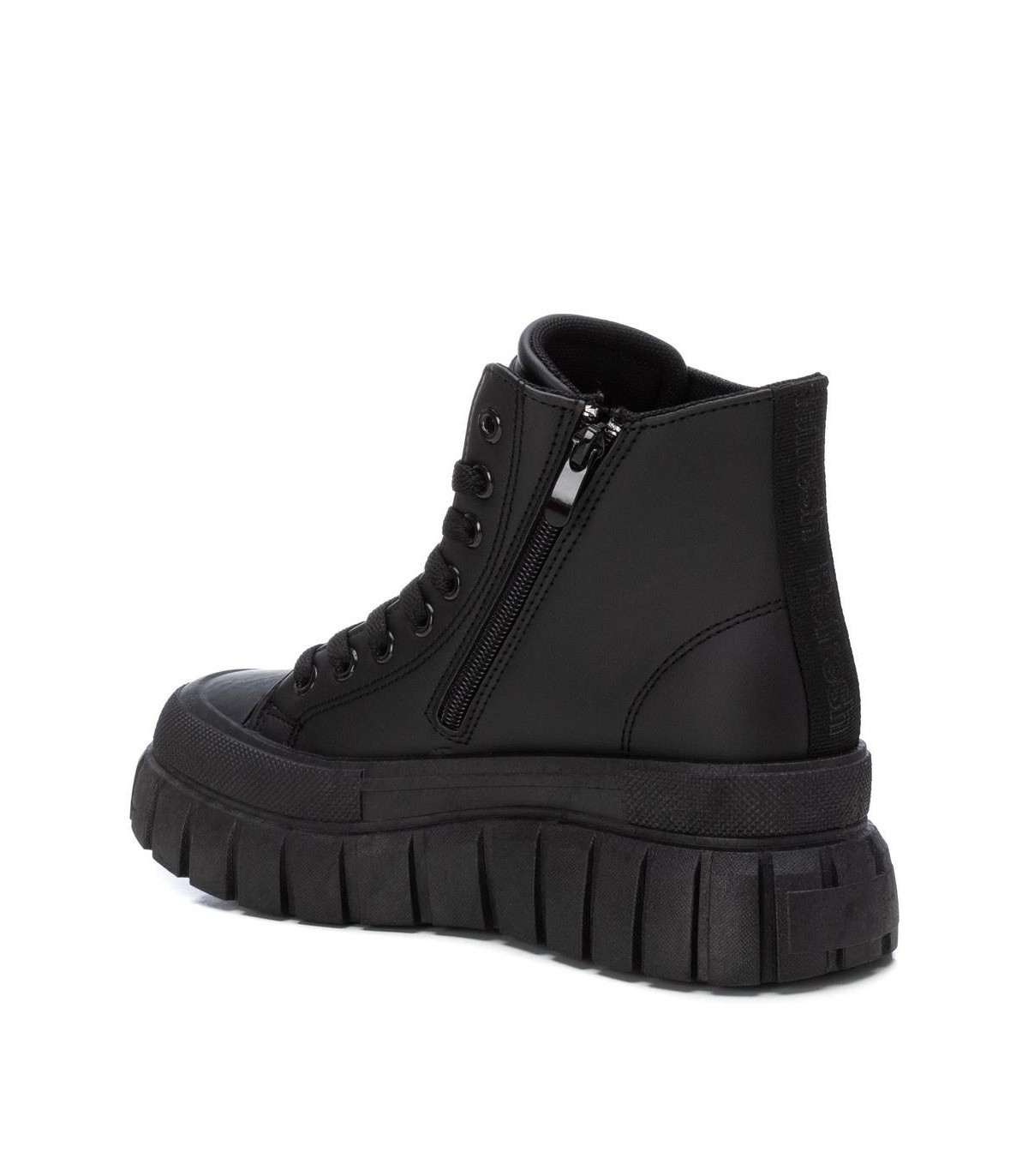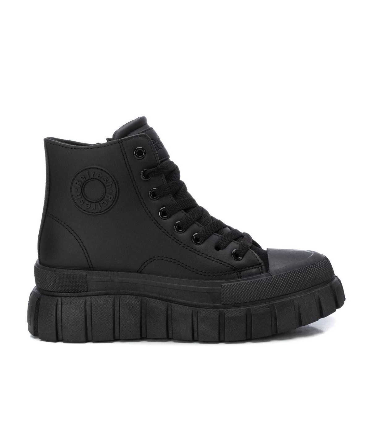 Botín de mujer, de la marca Refresh. Fabricado en material que imita la piel. Cierre lateral mediante cremallera y cordones ajustables. Suela con volumen de goma antideslizante. Modelo ideal para dar unos cm a tu look. Con plantilla extraíble. Este modelo ha obtenido el certificado vegano por la organización mundial PETA (Organización de los derechos de los animales).