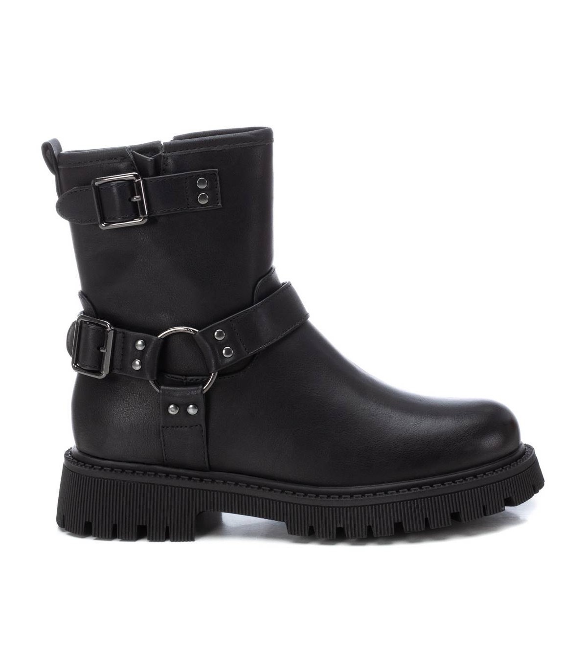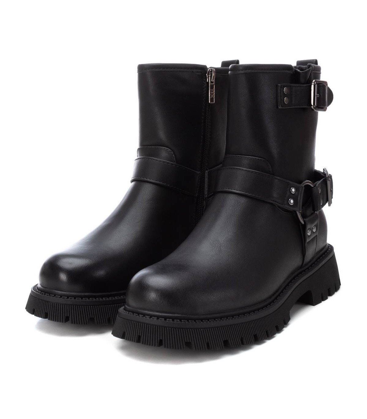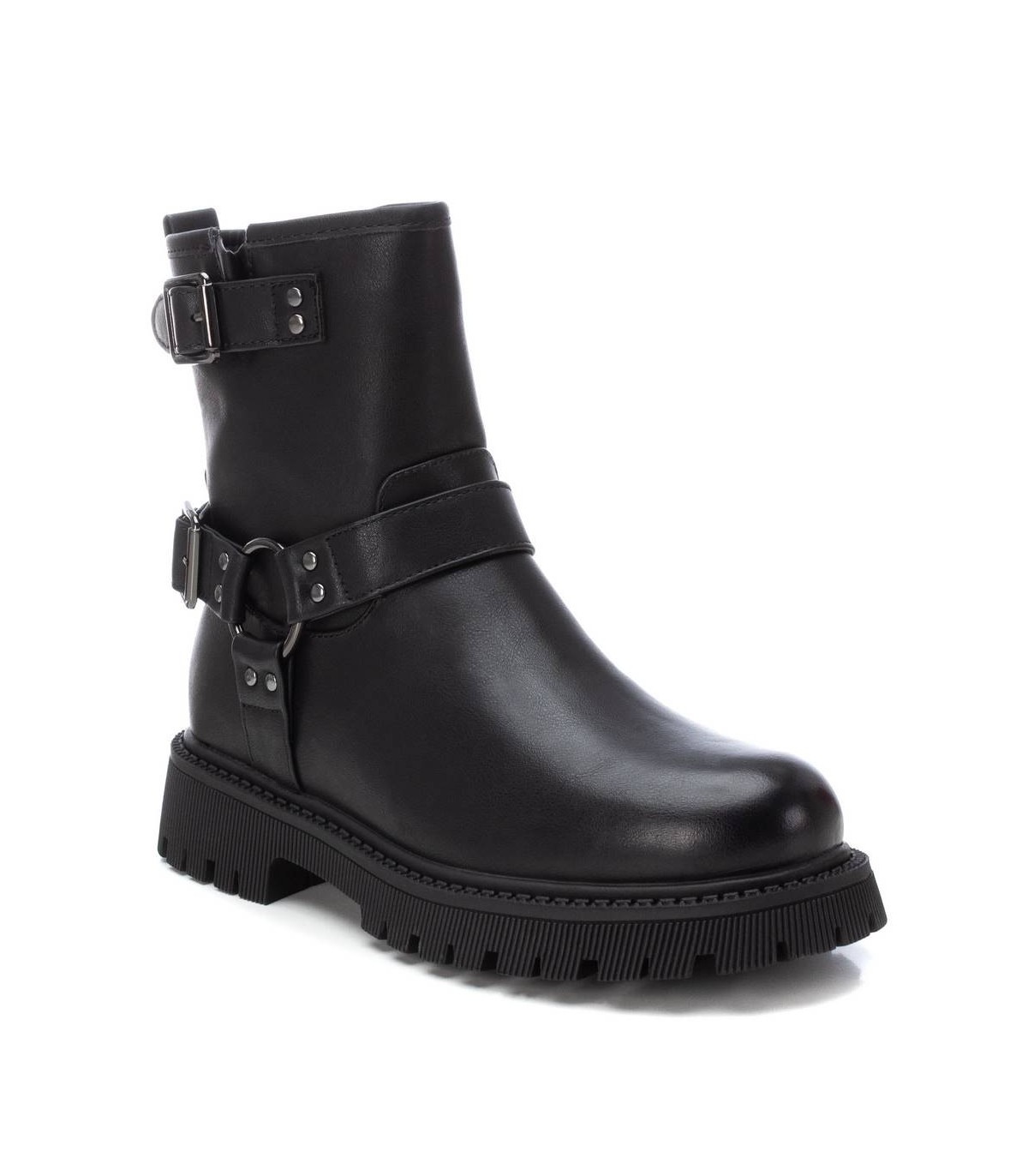 Botín motero de mujer, de la marca Xti. Fabricado en material que imita la piel. Cierre mediante cremallera lateral. Tirador trasero que facilita la puesta. Únete a la tendencia motera de esta temporada. Este modelo ha obtenido el certificado vegano por la organización mundial PETA (Organización de los derechos de los animales).
