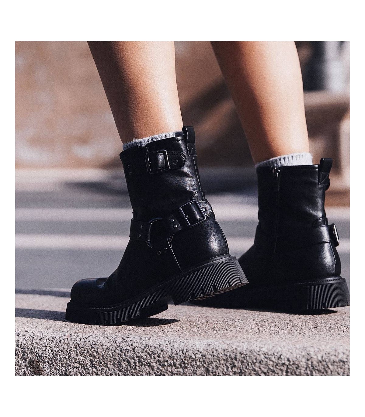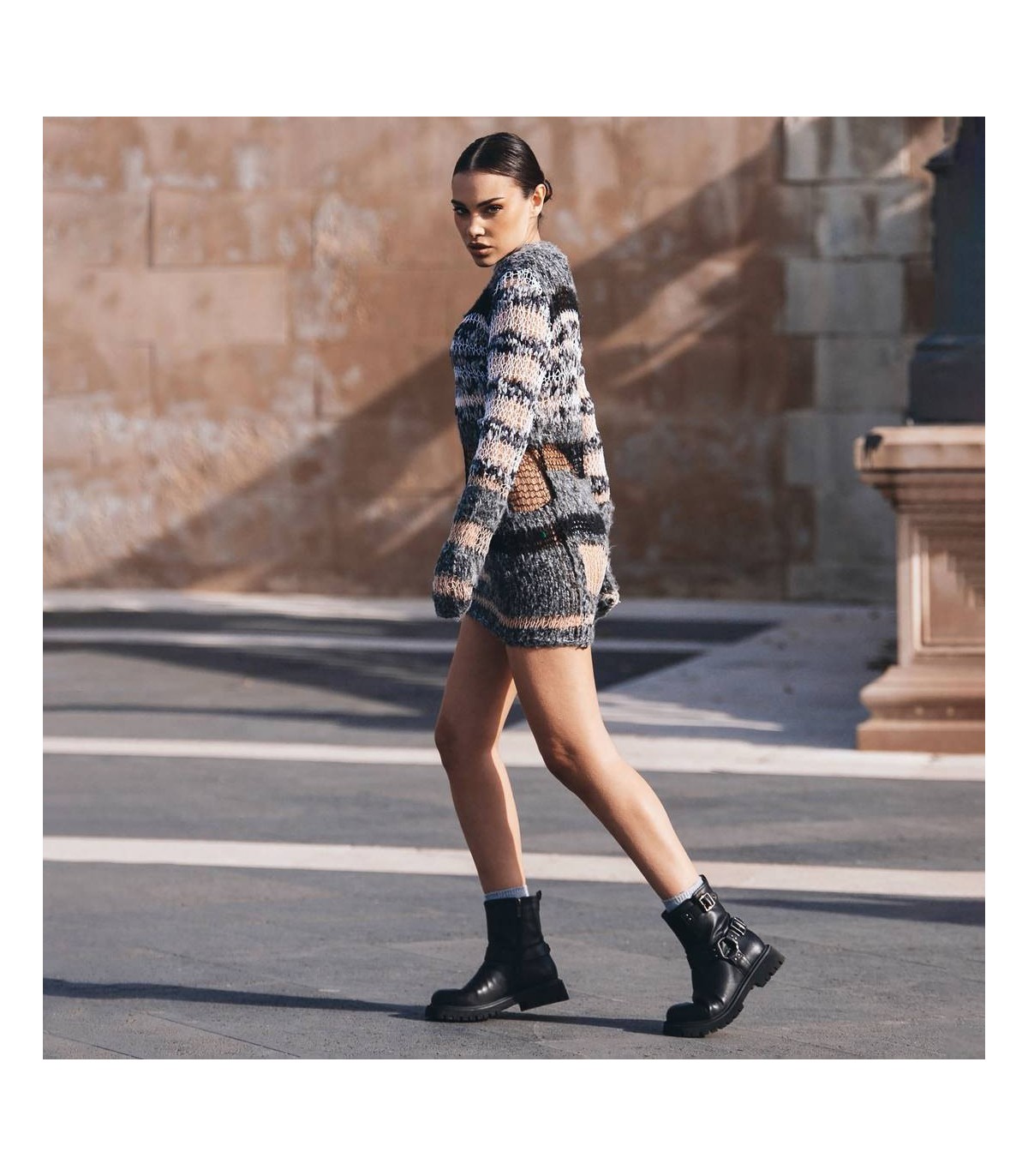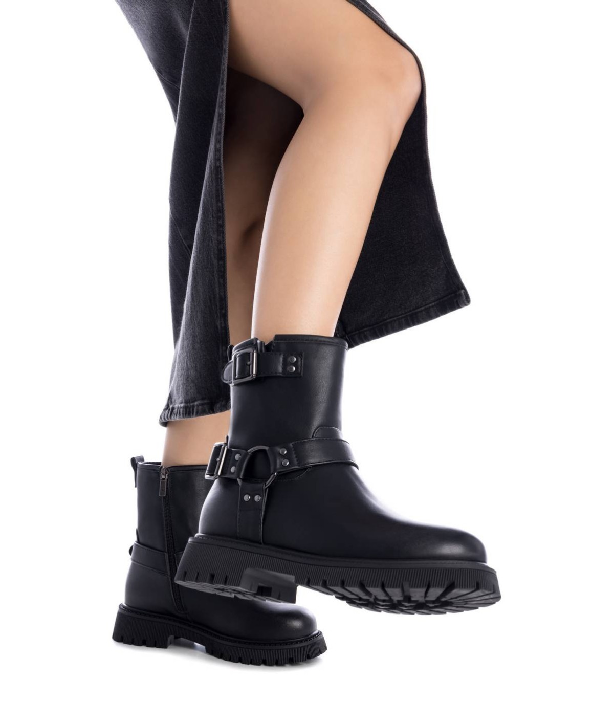 Botín motero de mujer, de la marca Xti. Fabricado en material que imita la piel. Cierre mediante cremallera lateral. Tirador trasero que facilita la puesta. Únete a la tendencia motera de esta temporada. Este modelo ha obtenido el certificado vegano por la organización mundial PETA (Organización de los derechos de los animales).