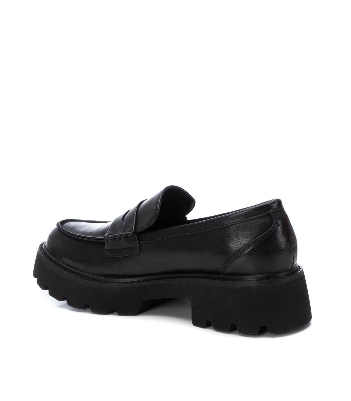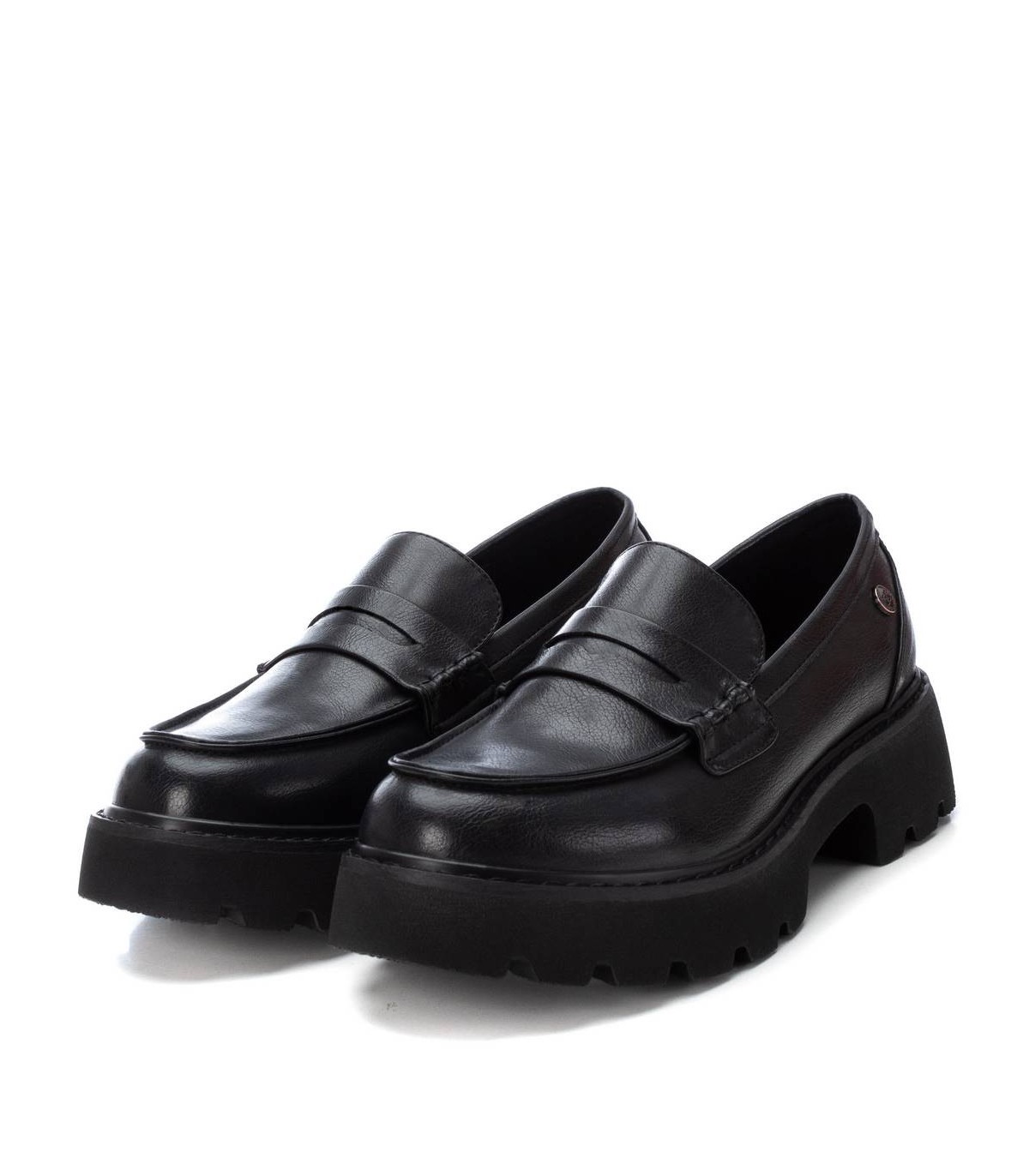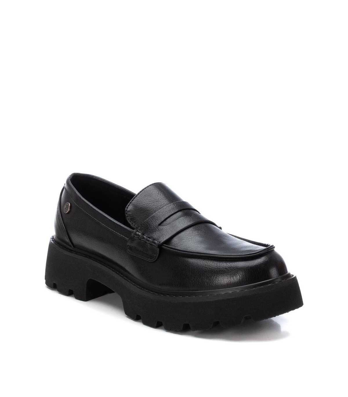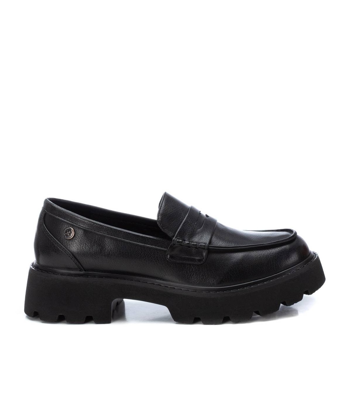 Mocasín de mujer, de la marca Xti. Fabricado en un material que imita la piel. Tacón ancho de 5 cm con suela dentada de goma antideslizante. Un básico de armario. Este modelo ha obtenido el certificado vegano por la organización mundial PETA (Organización de los derechos de los animales).