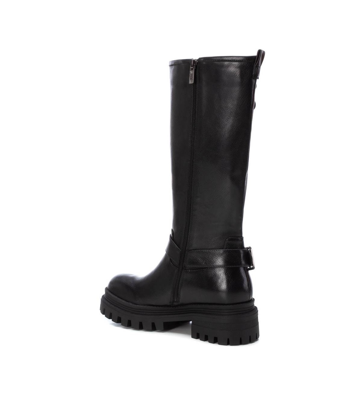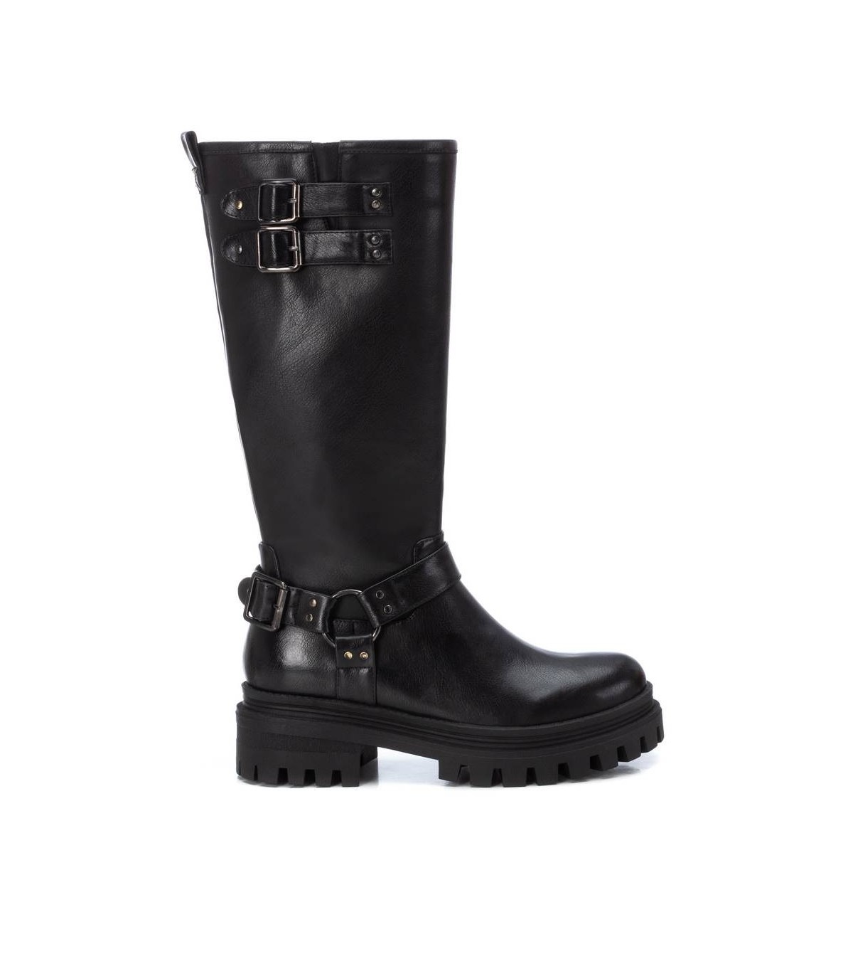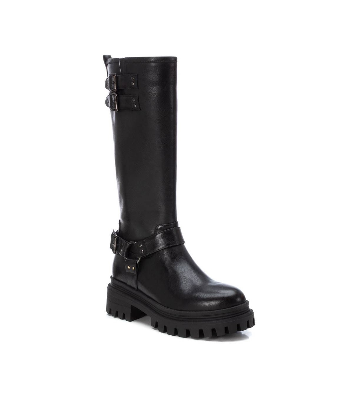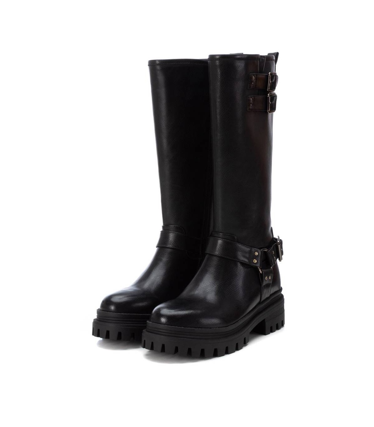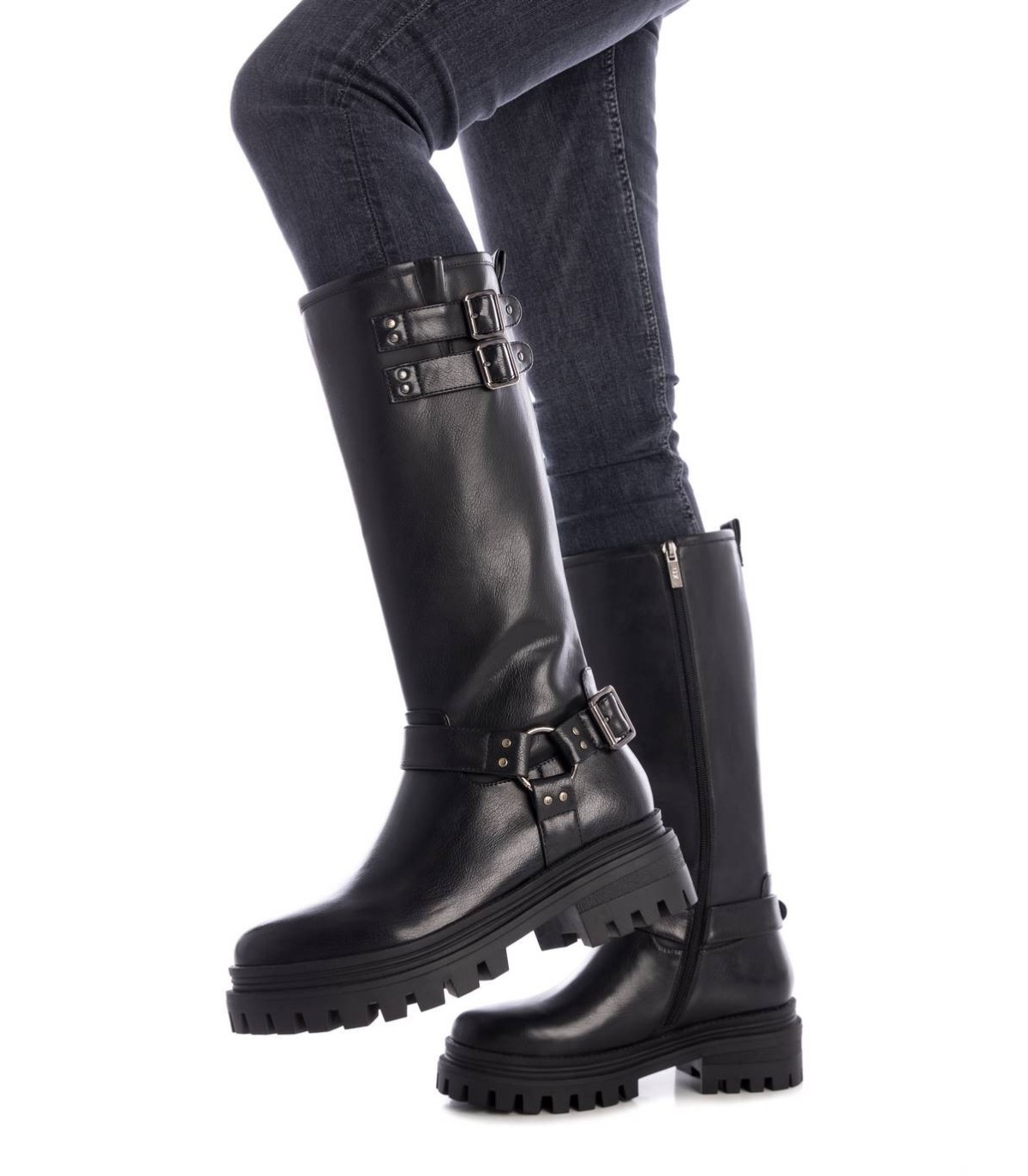 Bota motera de mujer, de la marca Xti. Fabricada en material que imita la piel. Cierre mediante cremallera interior y tirador trasero, los cuales facilitan la puesta. Suela gruesa antideslizante. Únete a la tendencia motera de esta temporada. Este modelo ha obtenido el certificado vegano por la organización mundial PETA (Organización de los derechos de los animales).