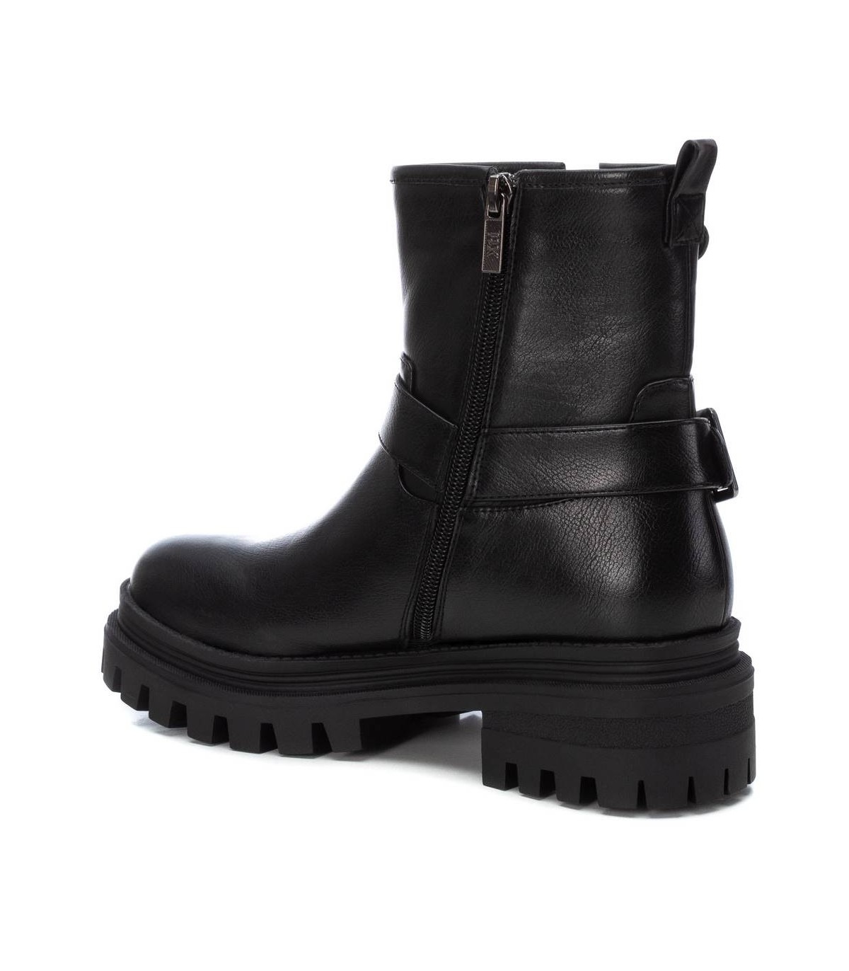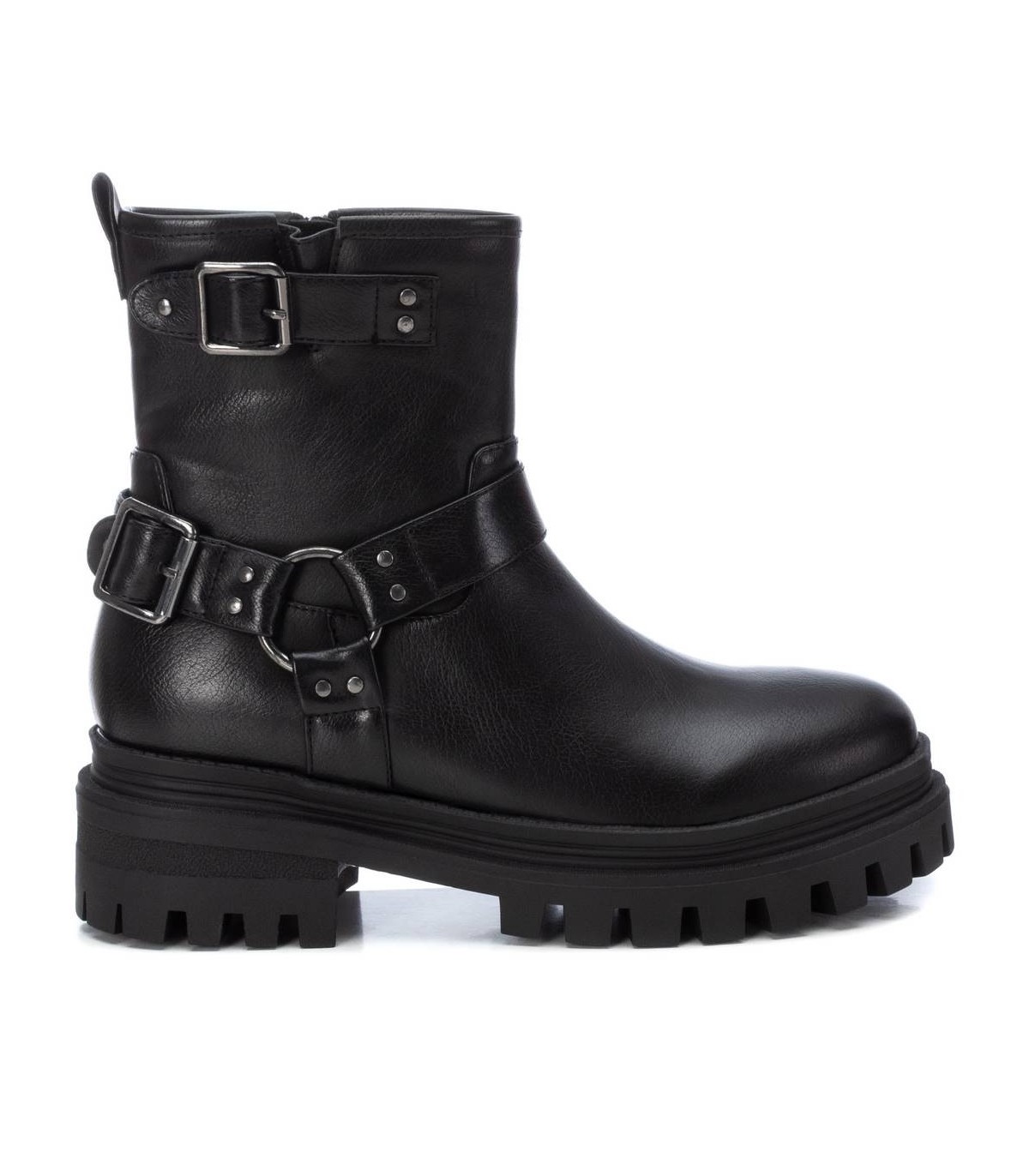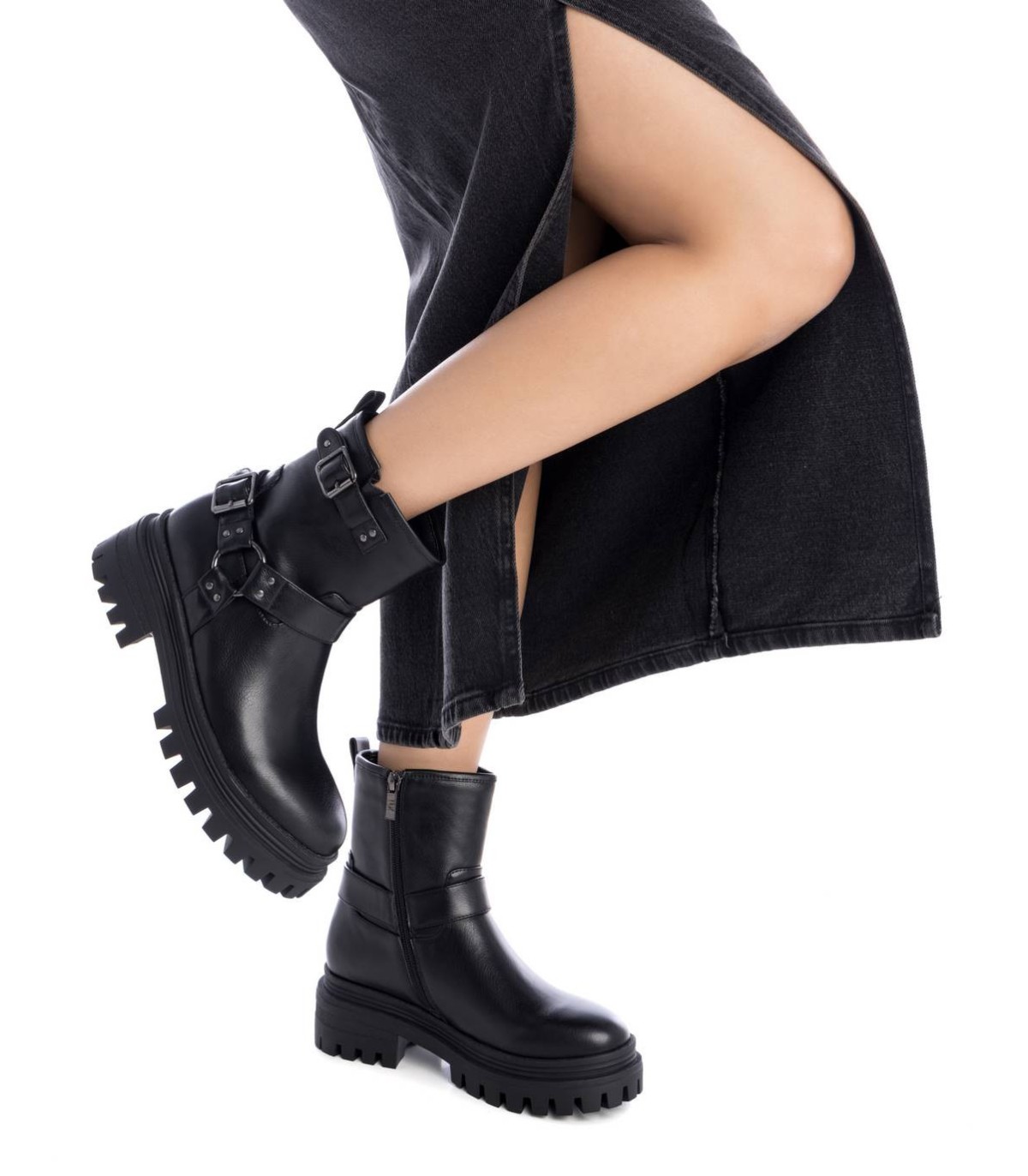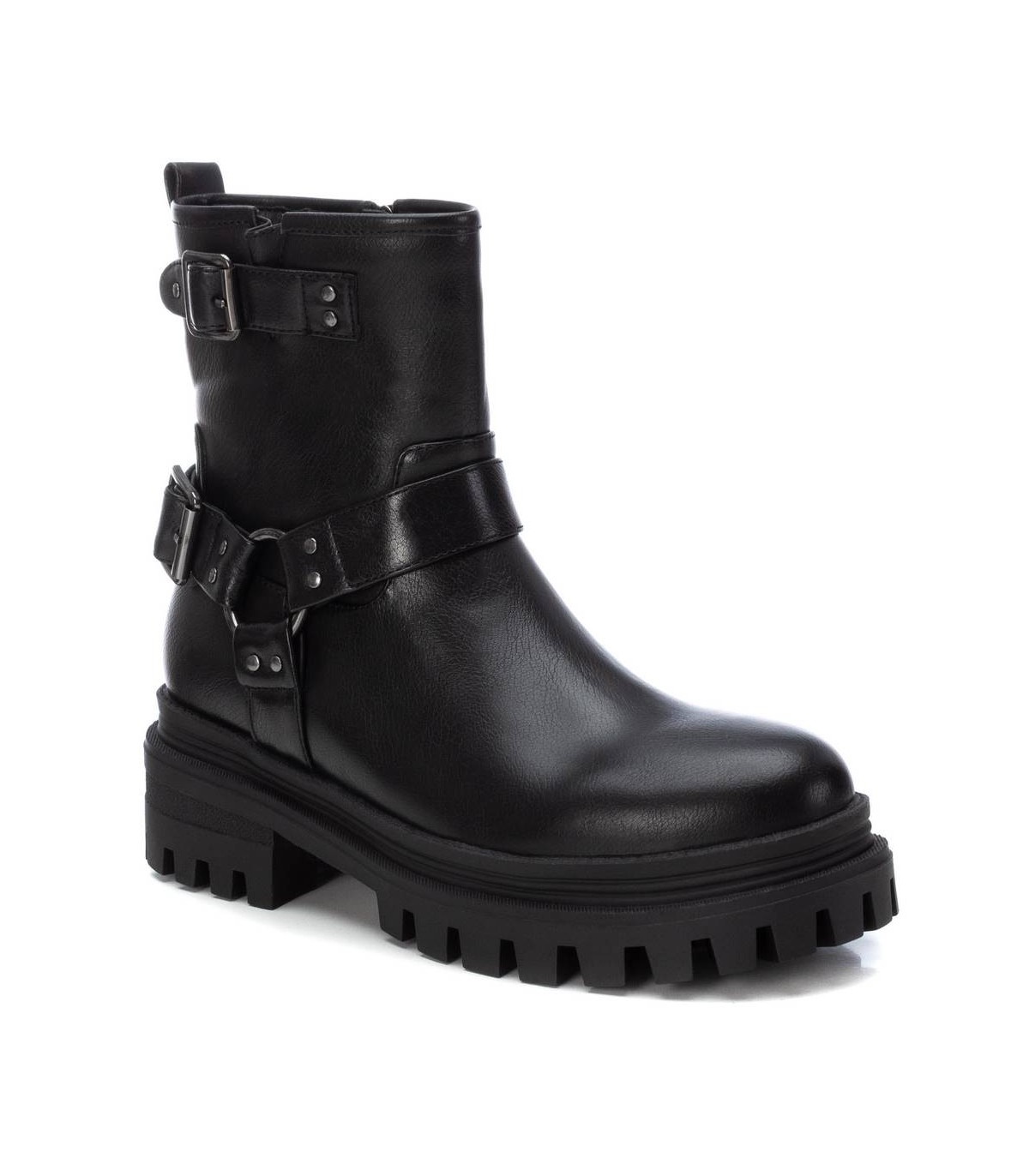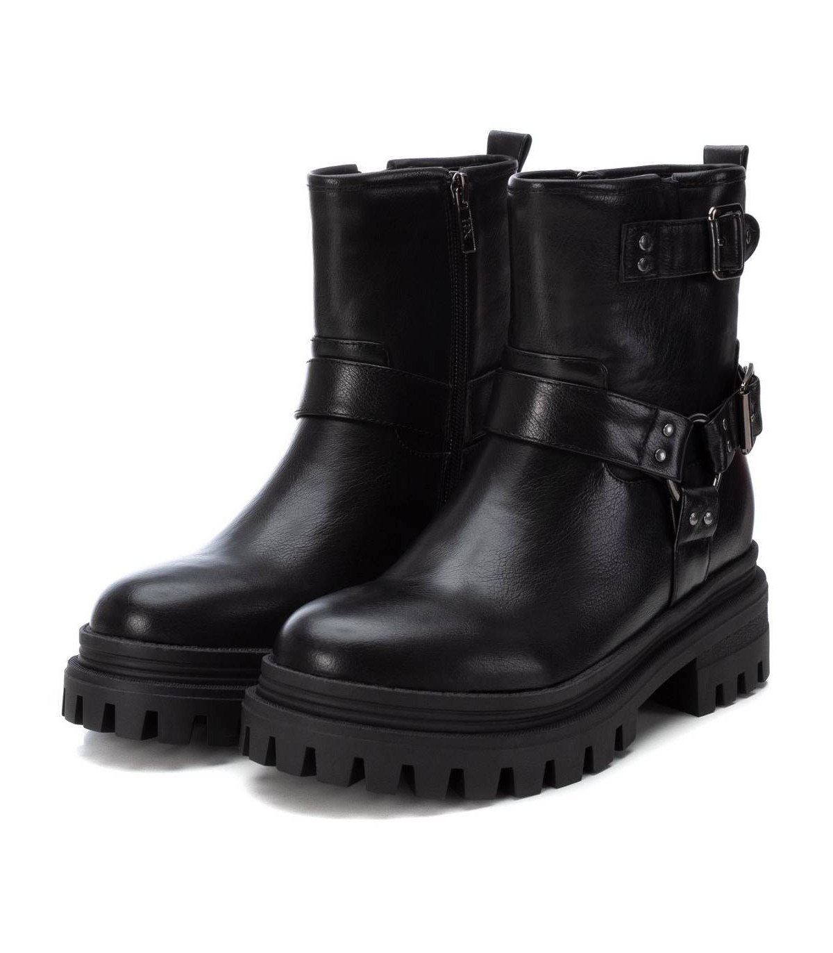 Botín motero de mujer, de la marca Xti. Fabricada en material que imita la piel. Cierre mediante cremallera interior, que con ayuda del tirador trasero facilitara la puesta. Suela gruesa antideslizante. Únete a la tendencia motera de esta temporada. Este modelo ha obtenido el certificado vegano por la organización mundial PETA (Organización de los derechos de los animales).