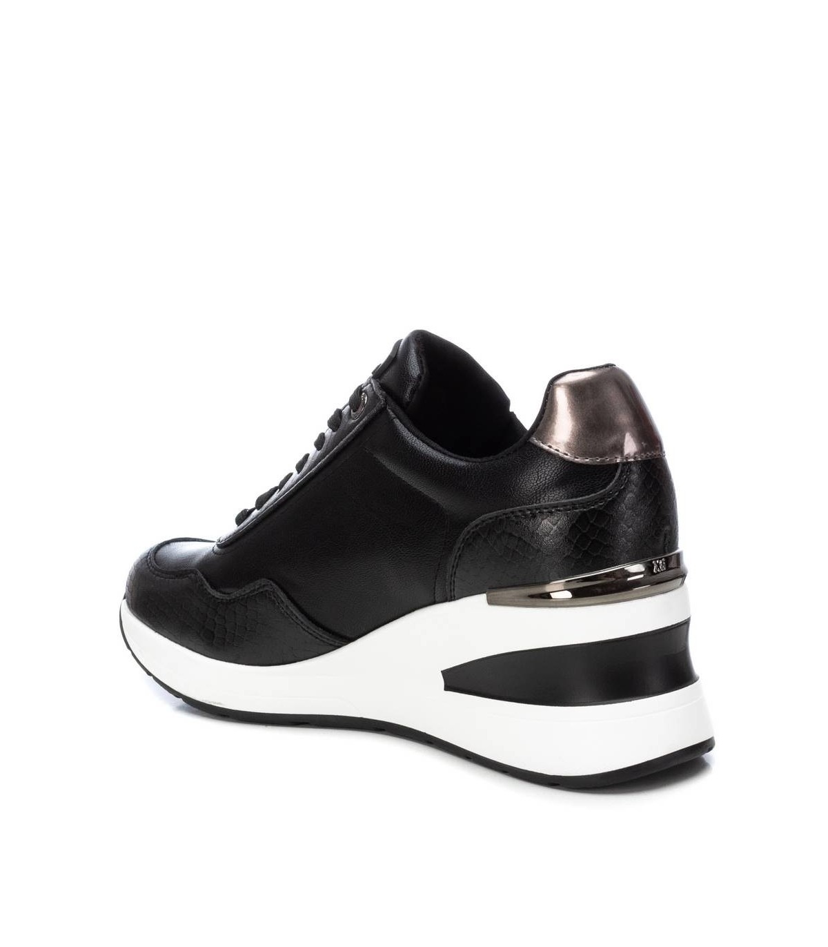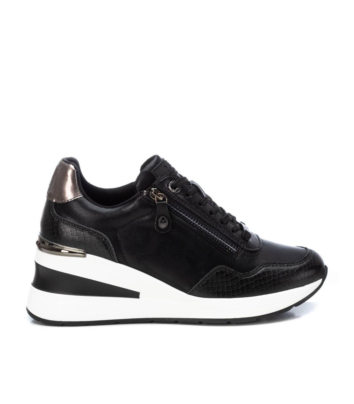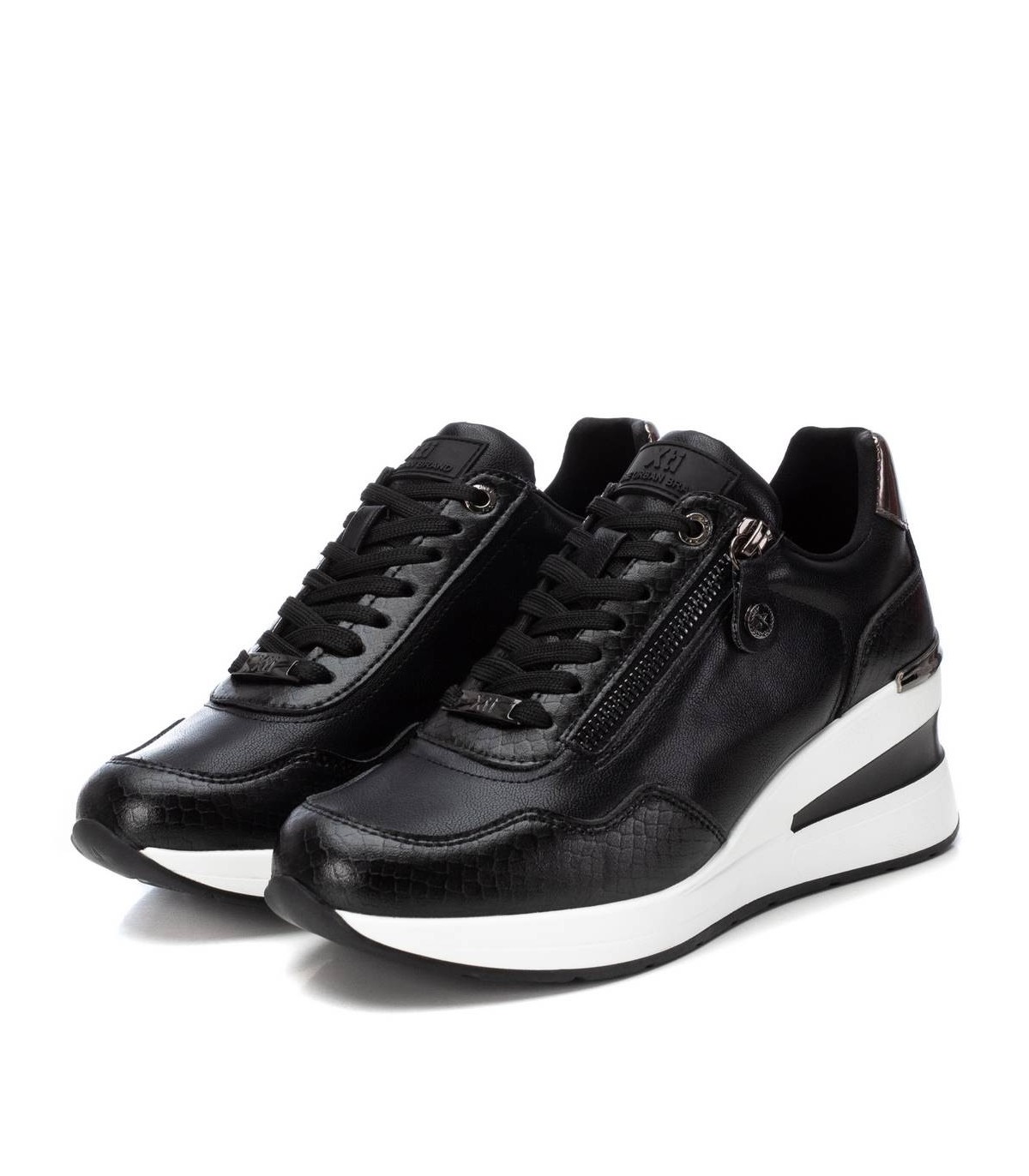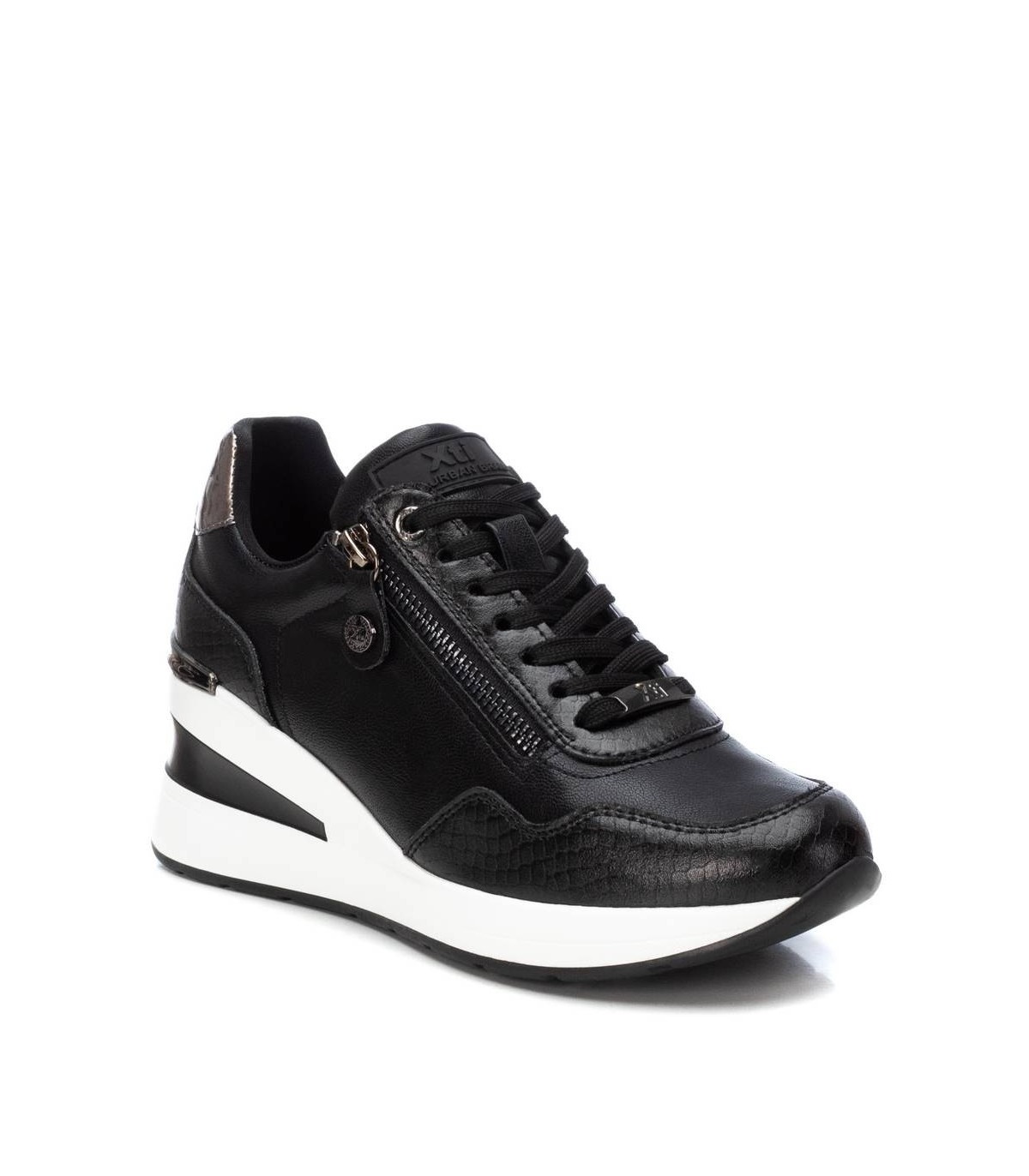 Zapatilla de mujer, de la marca Xti. Fabricado en material que imita la piel. Con cierre cremallera lateral y cordones ajustables para mayor comodidad y buen ajuste. Cómoda cuña de 6 cm con suela de goma dentada antideslizante. Con plantilla extraíble. Este modelo ha obtenido el certificado vegano por la organización mundial PETA (Organización de los derechos de los animales).