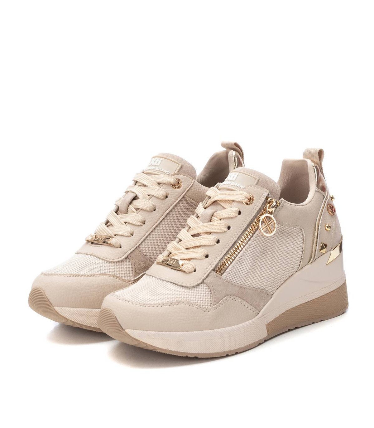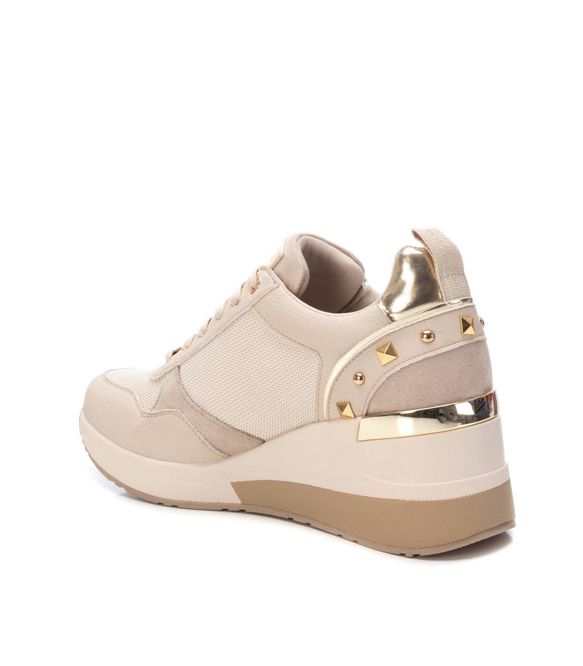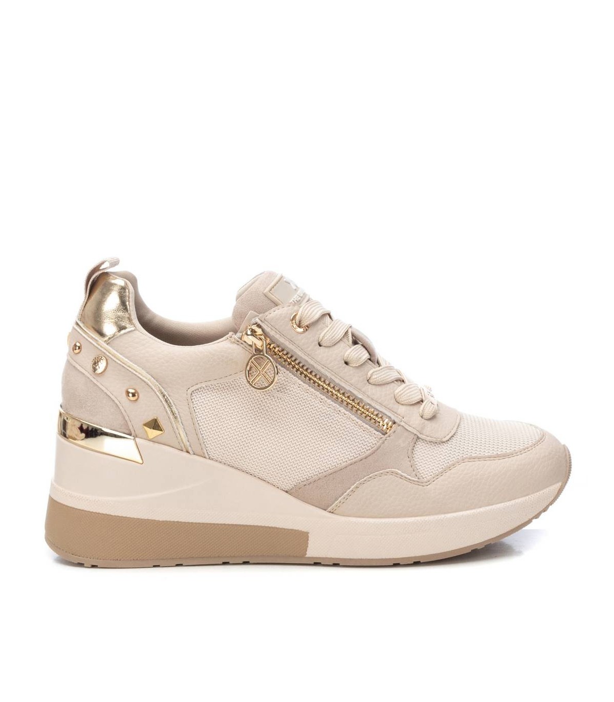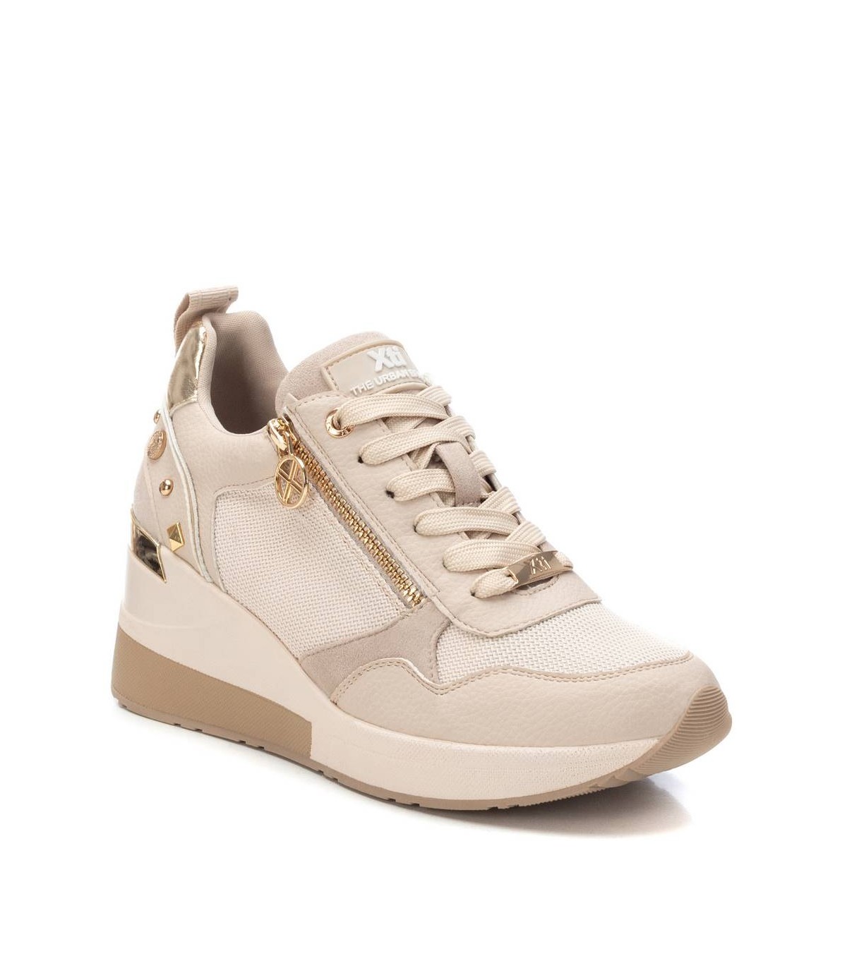 Zapatilla de mujer, de la marca Xti. Fabricada en material textil y rejilla al tono. Cierre mediante cordones y cremallera lateral facilitando la puesta. Cuña de 6 cm con suela de goma antideslizante. Ideal para aportar unos cm sin perder comodidad. Con plantilla extraíble. Este modelo ha obtenido el certificado vegano por la organización mundial PETA (Organización de los derechos de los animales).
