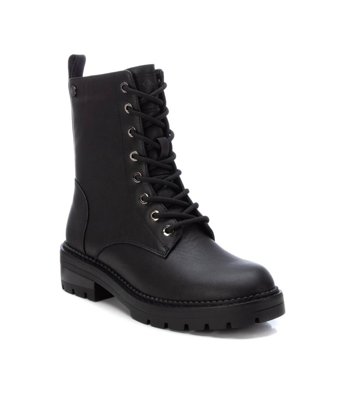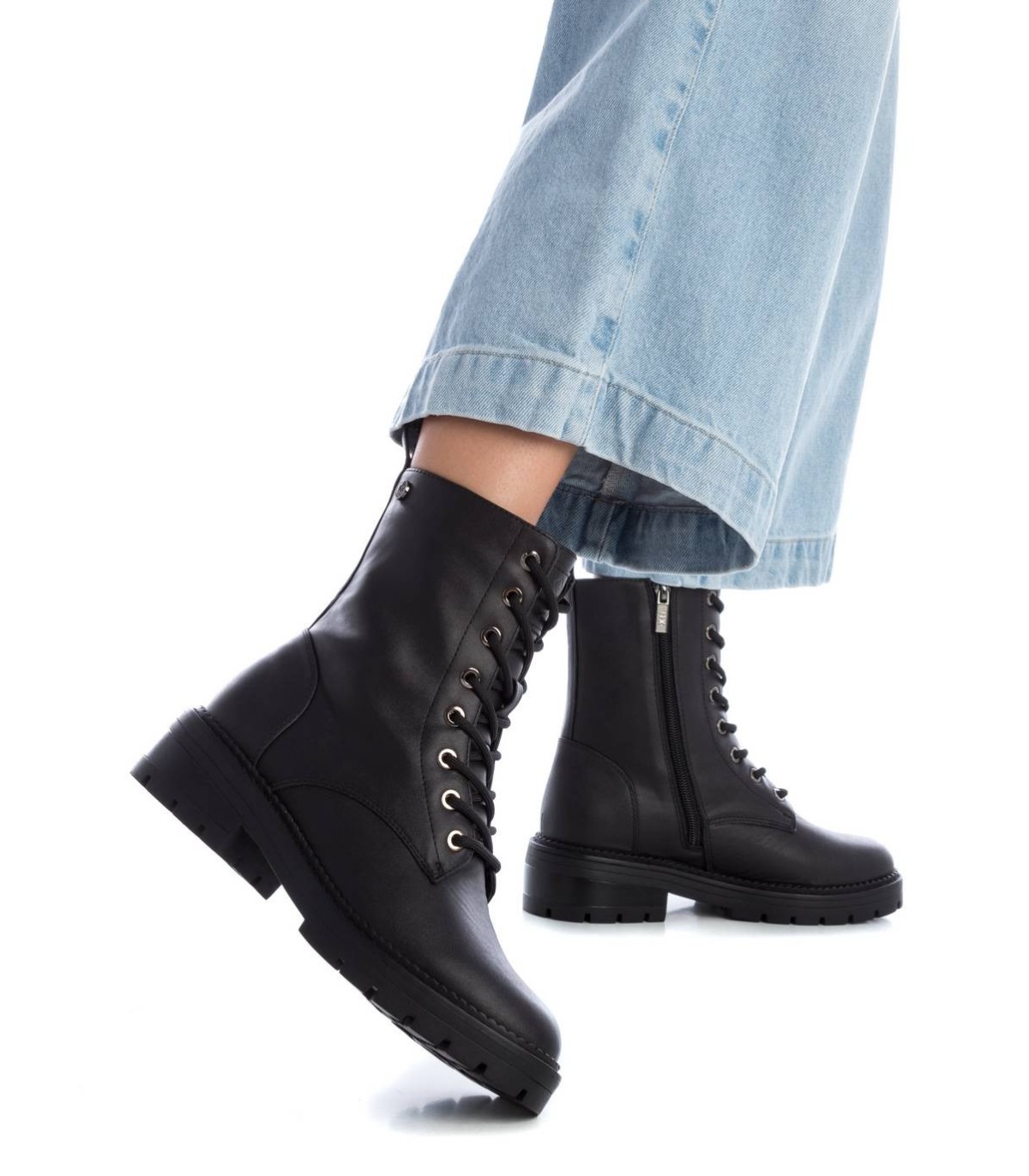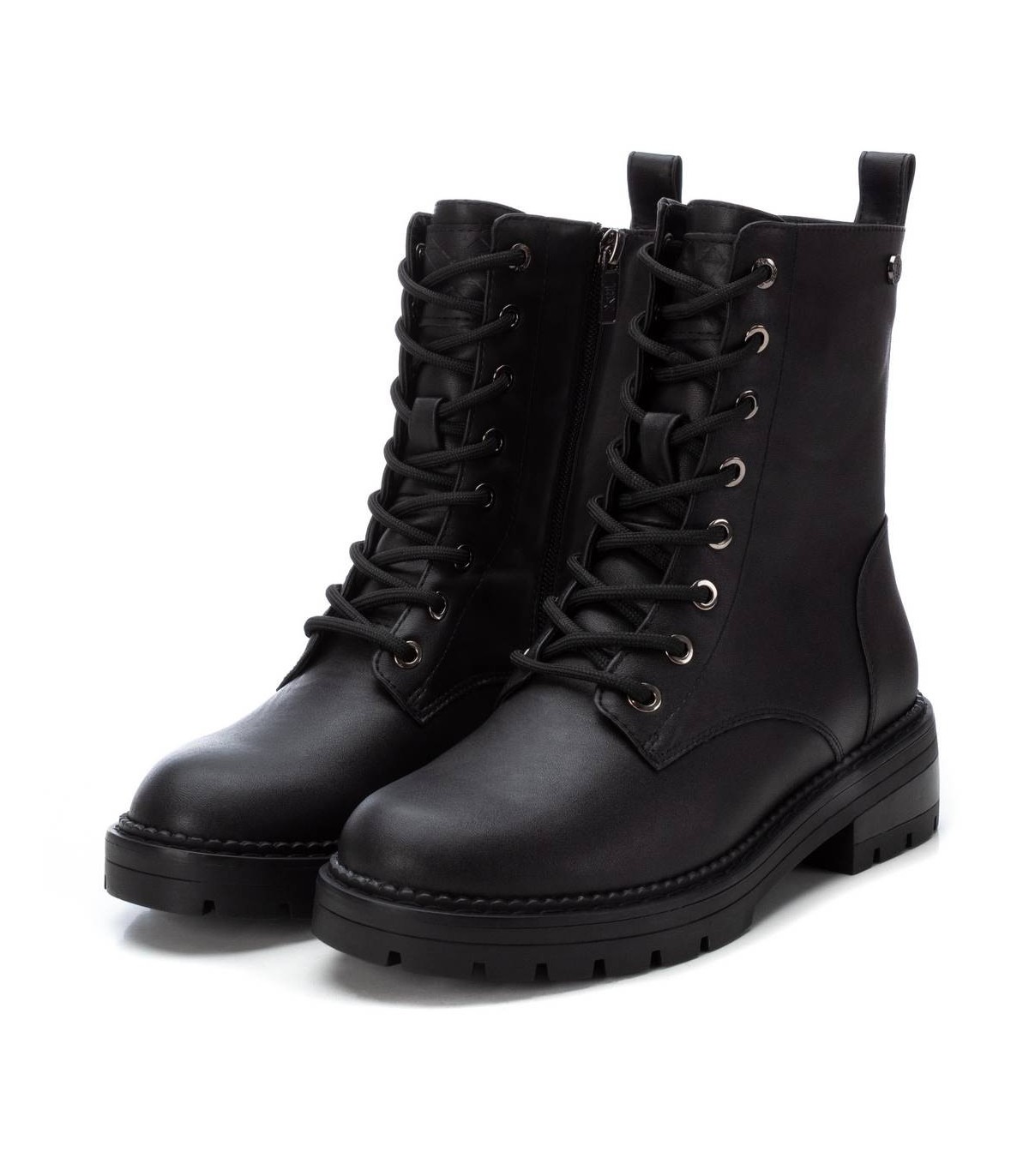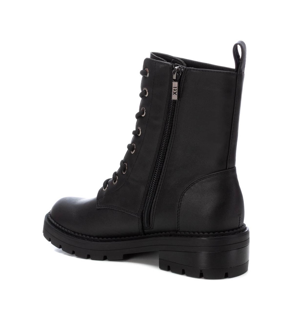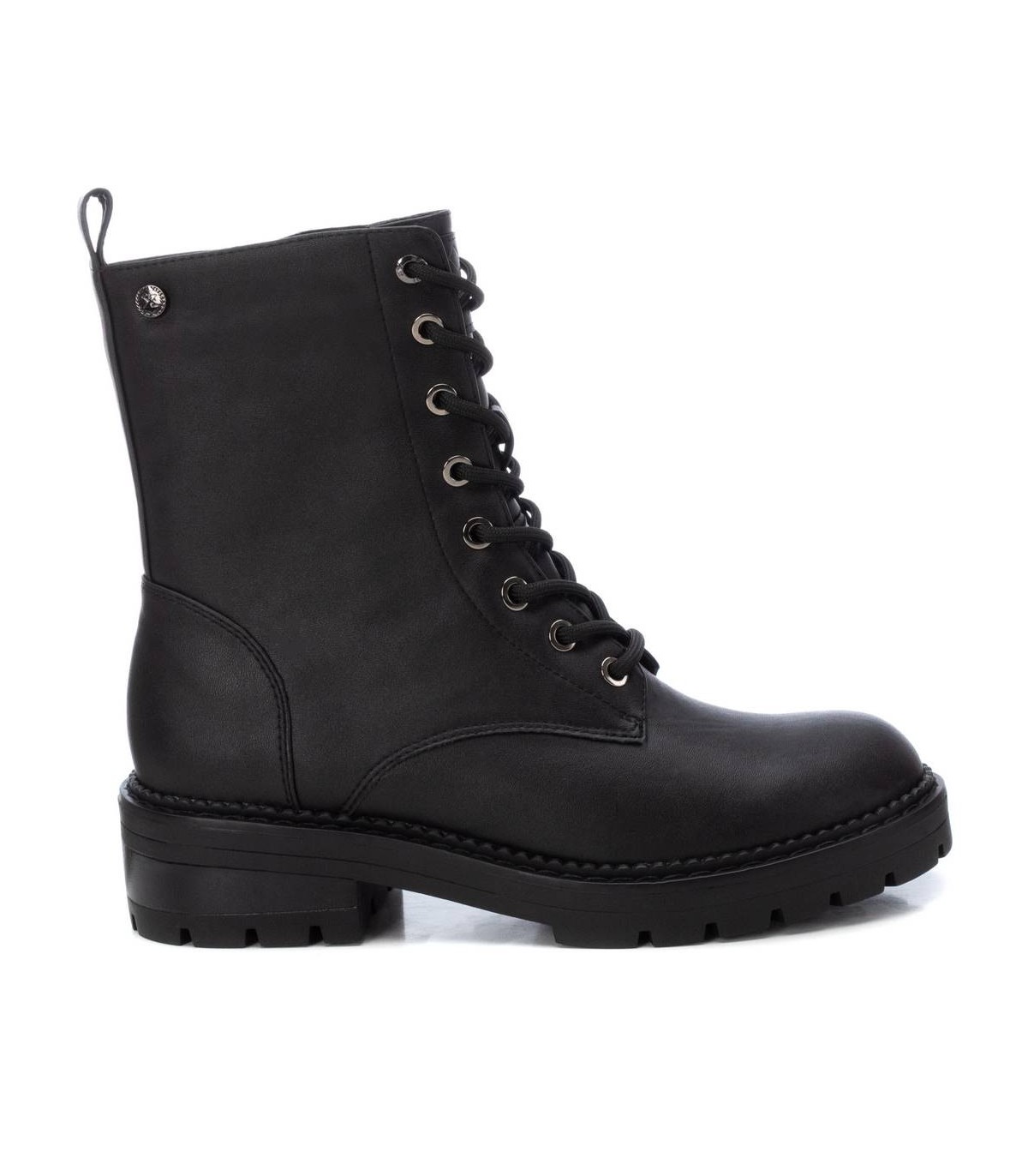 Botín de mujer, de la marca Xti. Fabricado en un material que imita la piel. Cierre con cremallera lateral y cordones para un mayor ajuste. Tirador trasero para facilitar la puesta. Suela track de goma antideslizante. Este modelo ha obtenido el certificado vegano por la organización mundial PETA (Organización de los derechos de los animales).