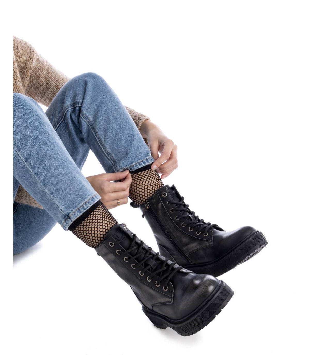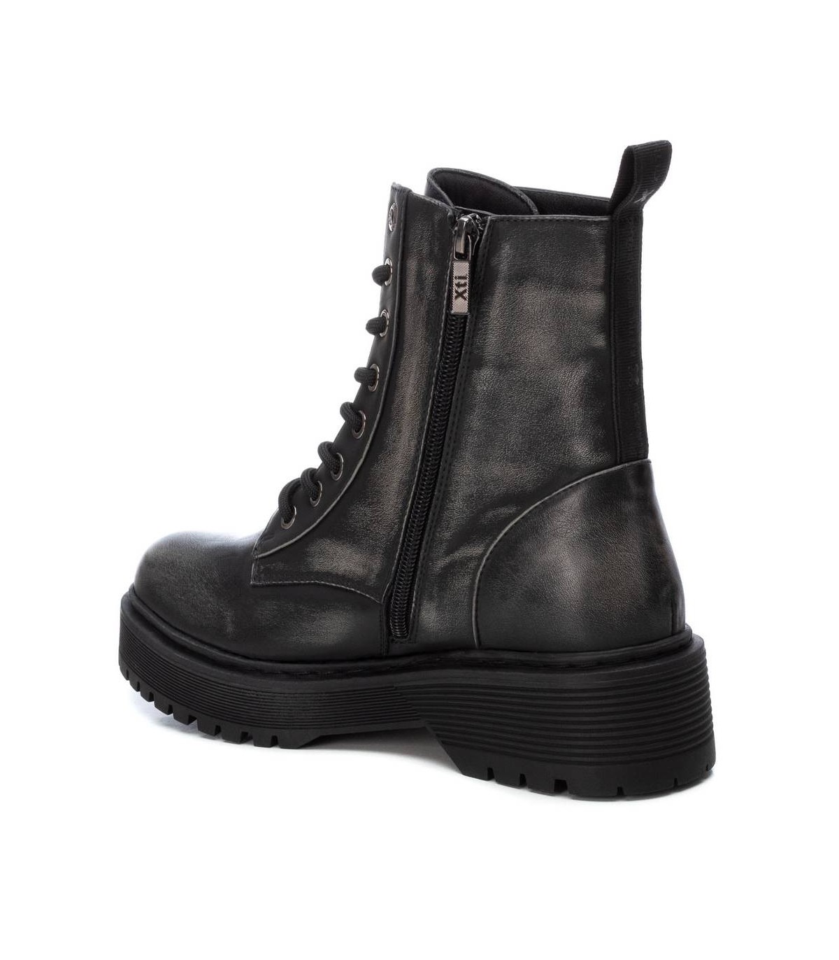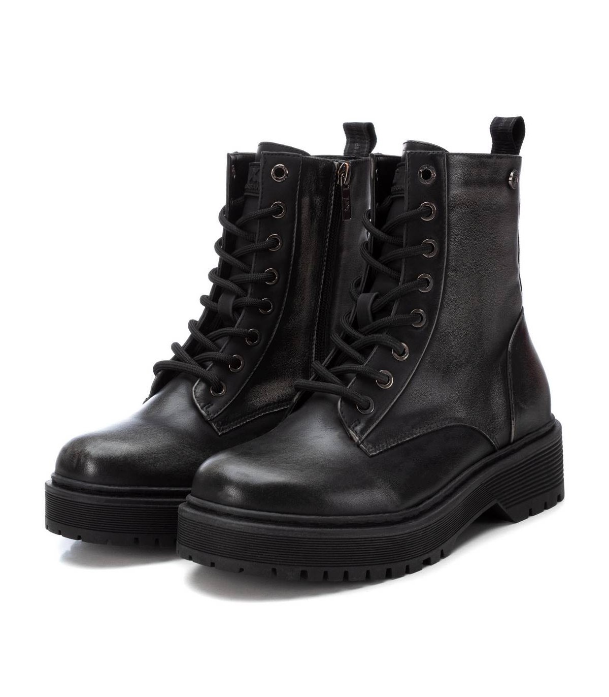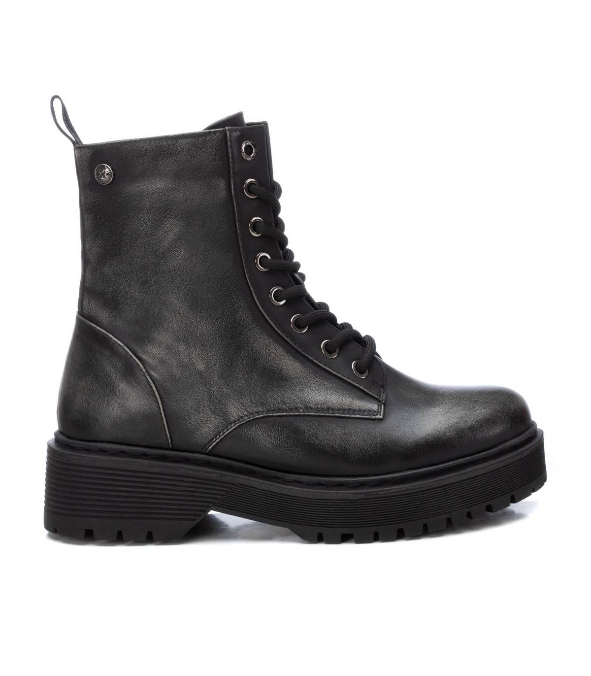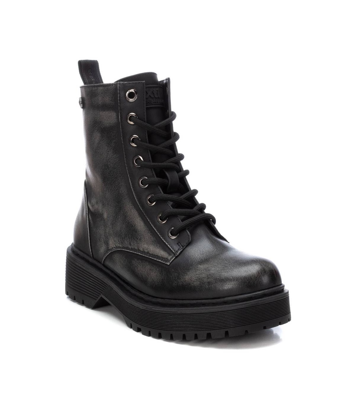 Botín militar de mujer, de la marca Xti. Fabricado en material que imita la piel. Cierre mediante cremallera lateral y cordoneras para un buen ajuste. Tirador trasero para facilitar la puesta. Suela track de goma antideslizante. Modelo en tendencia de esta temporada. Este modelo ha obtenido el certificado vegano por la organización mundial PETA (Organización de los derechos de los animales).