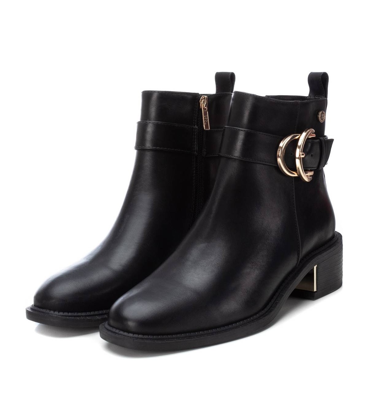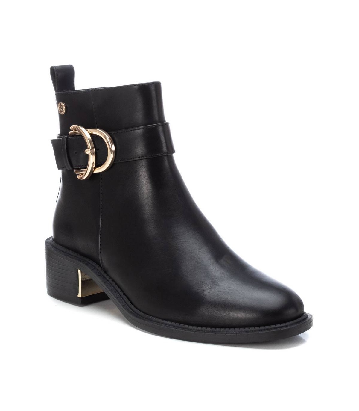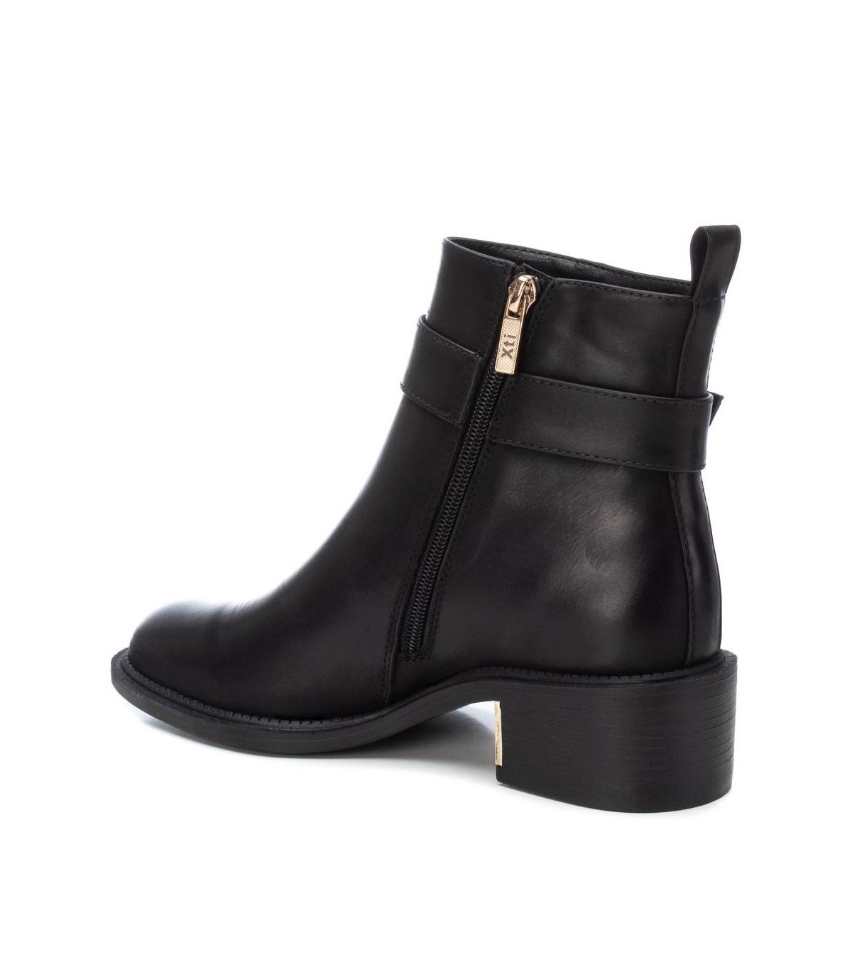 Botín de mujer, de la marca Xti. Fabricado en material que imita la piel. Cierre cremallera interior. Correa decorativa y hebilla metálica. Ideal para el invierno. Este modelo ha obtenido el certificado vegano por la organización mundial PETA (Organización de los derechos de los animales).