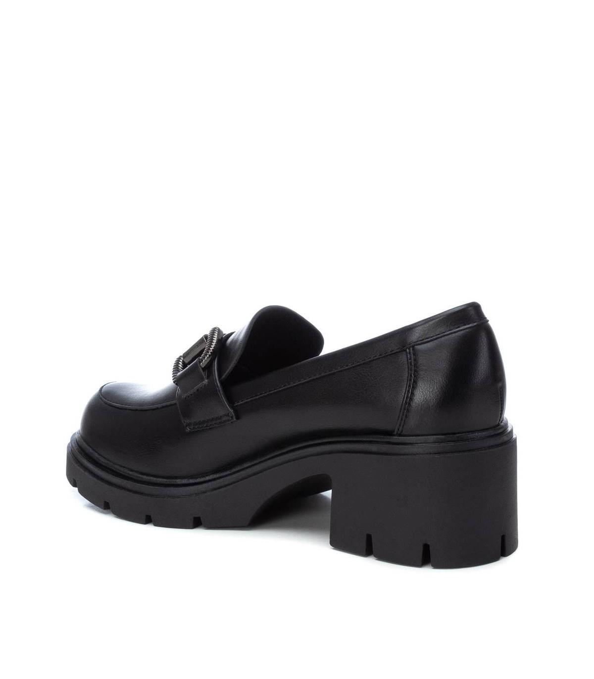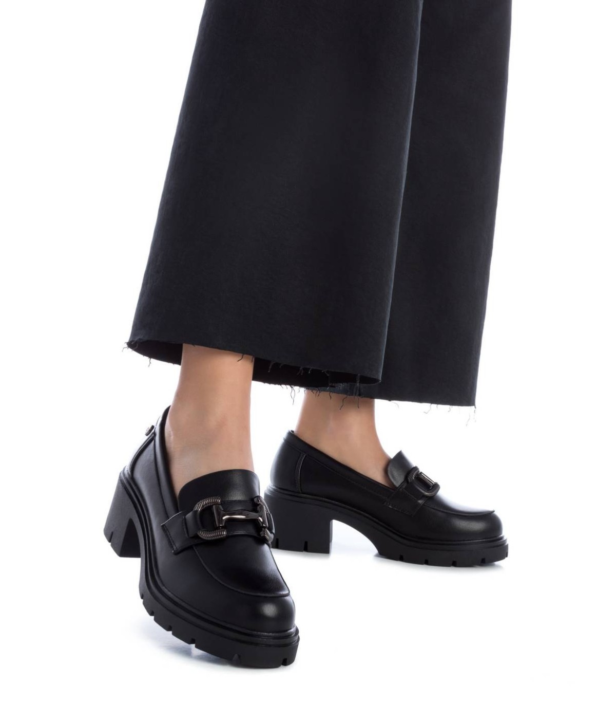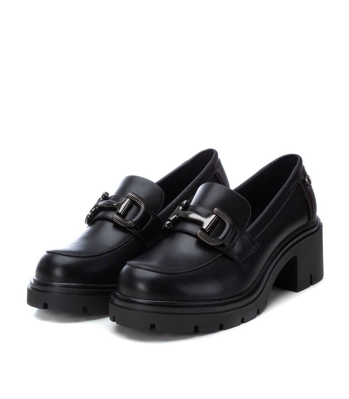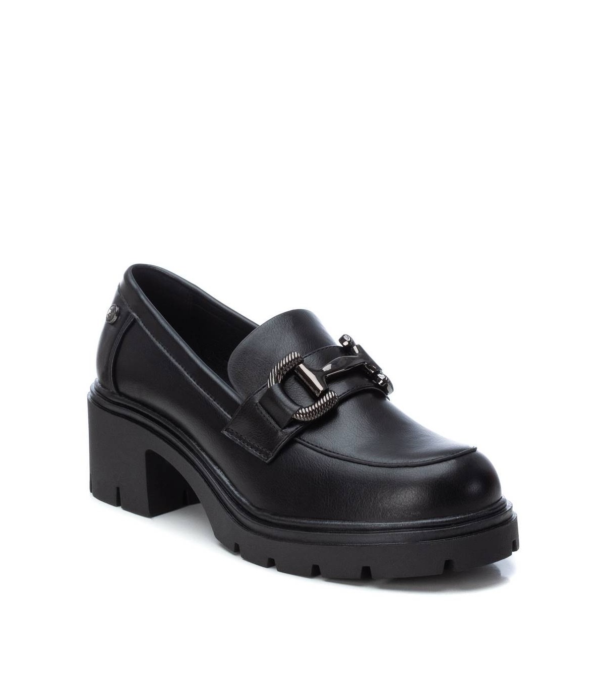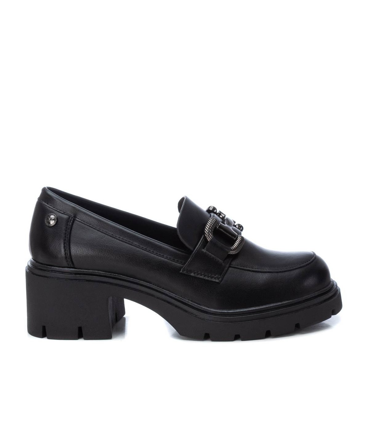 Mocasín de mujer, de la marca Xti. Fabricado en un material que imita la piel. Con detalle decorativo en el frente. Tacón ancho de 6 cm, suela dentada antideslizante. Un básico del invierno. Este modelo ha obtenido el certificado vegano por la organización mundial PETA (Organización de los derechos de los animales).