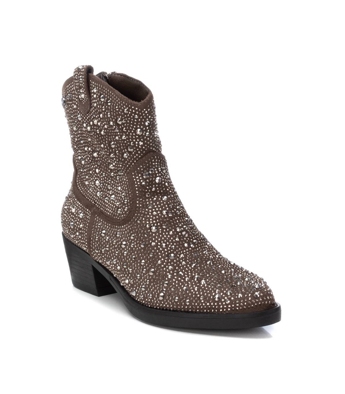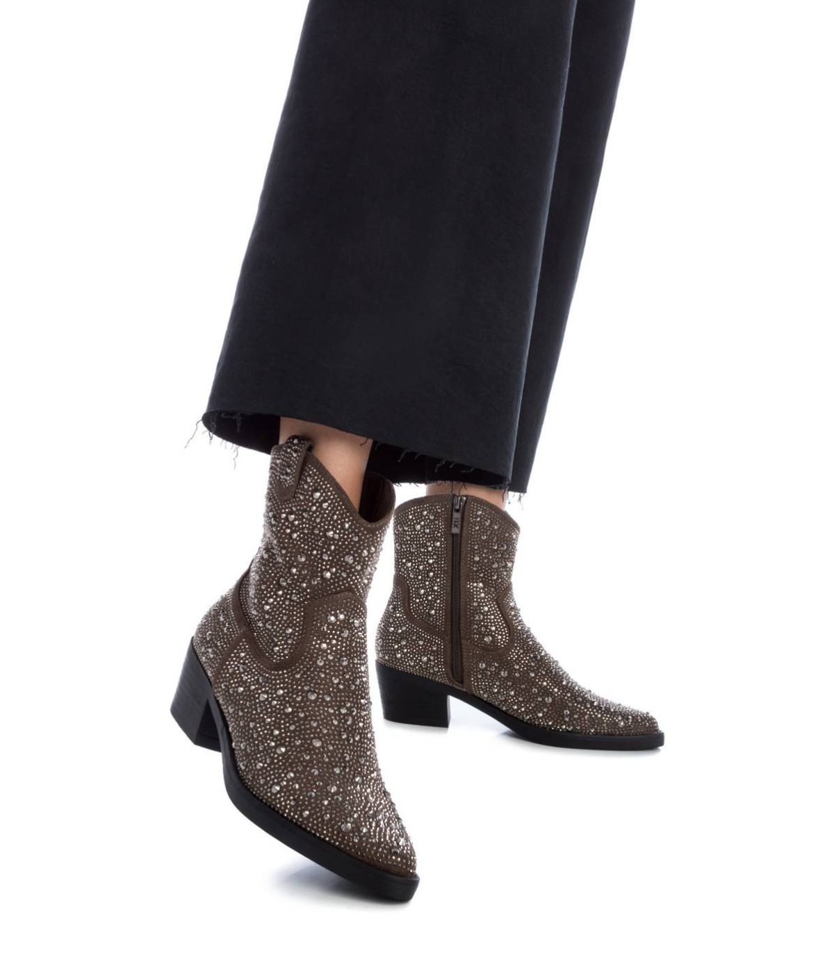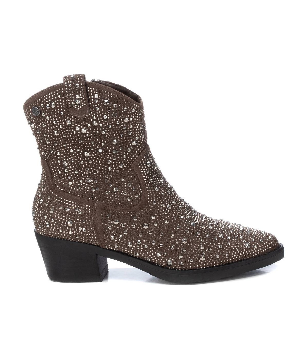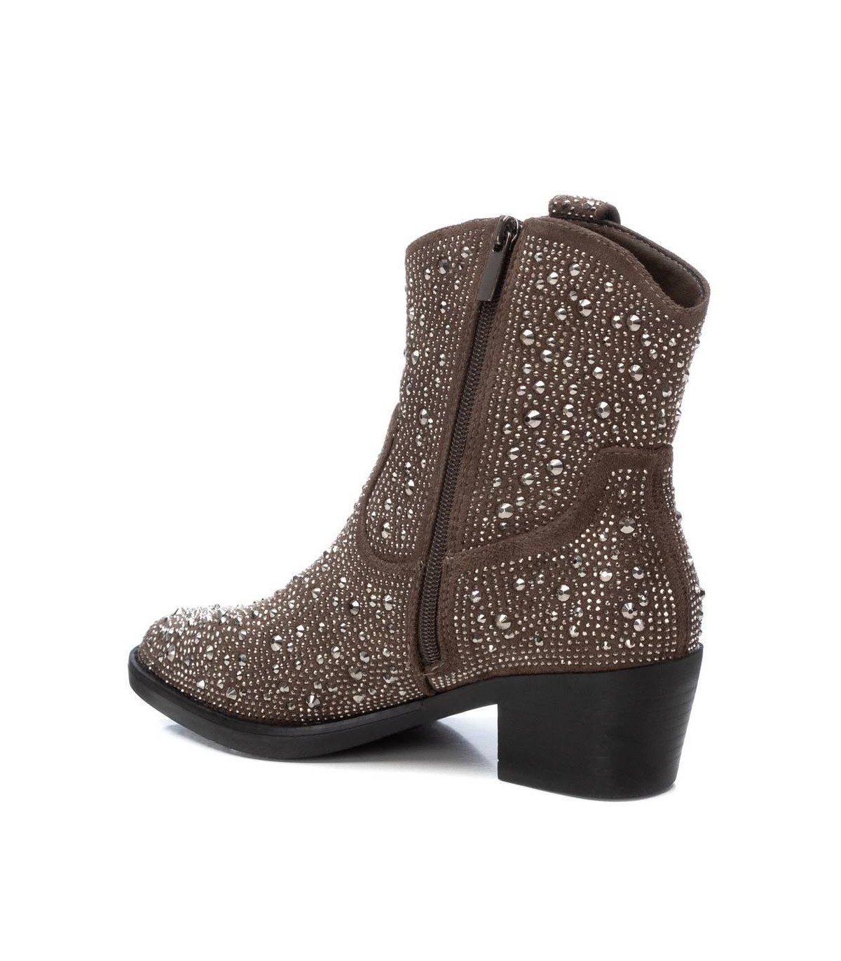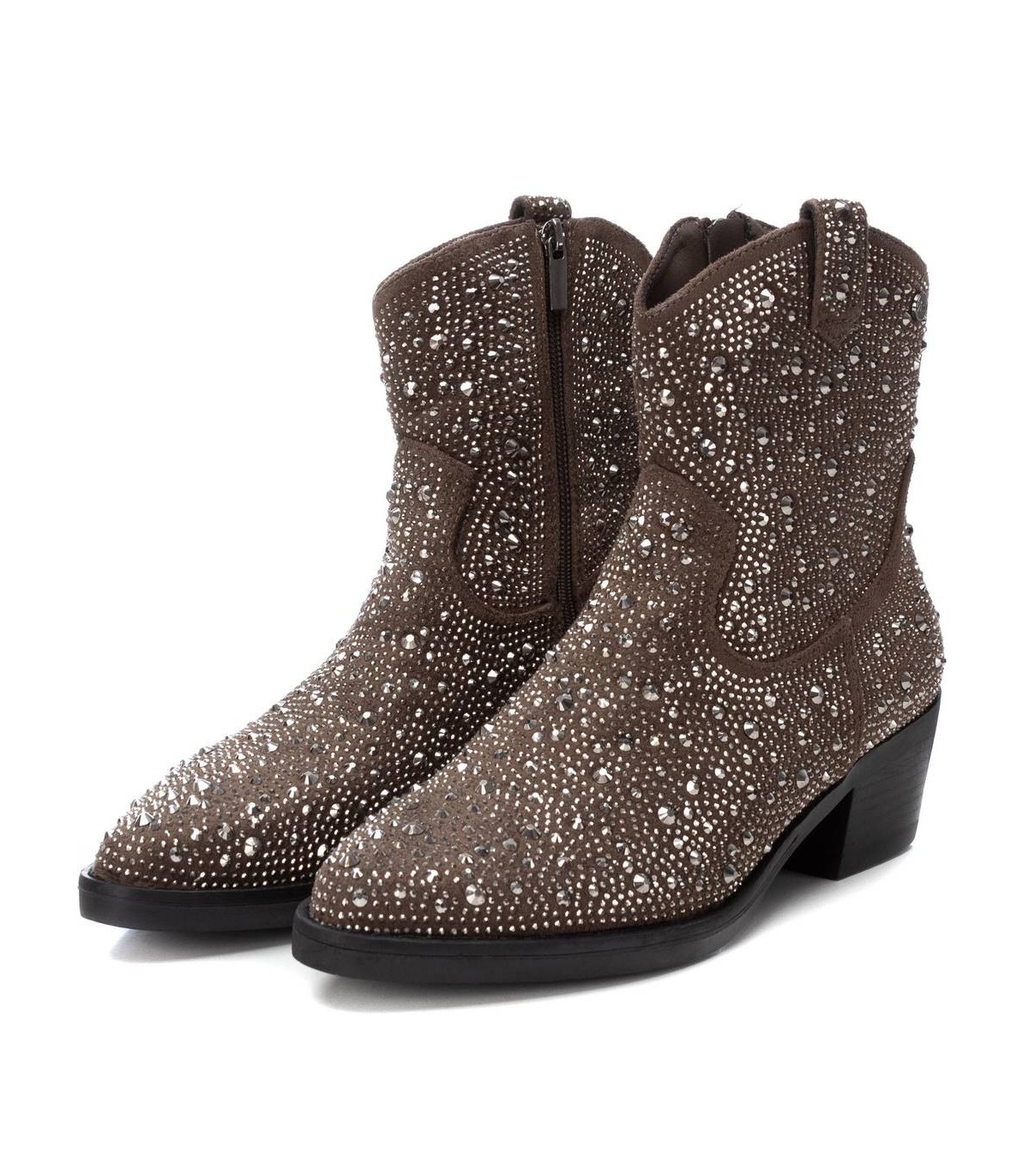 Botín estilo cowboy de mujer, de la marca Xti. Fabricado en antelina con piedras decorativas de fantasía. Cierre cremallera. Con punta afilada y un tacón ancho de 5 cm etilo cowboy y suela antideslizante. Este modelo ha obtenido el certificado vegano por la organización mundial PETA (Organización de los derechos de los animales).