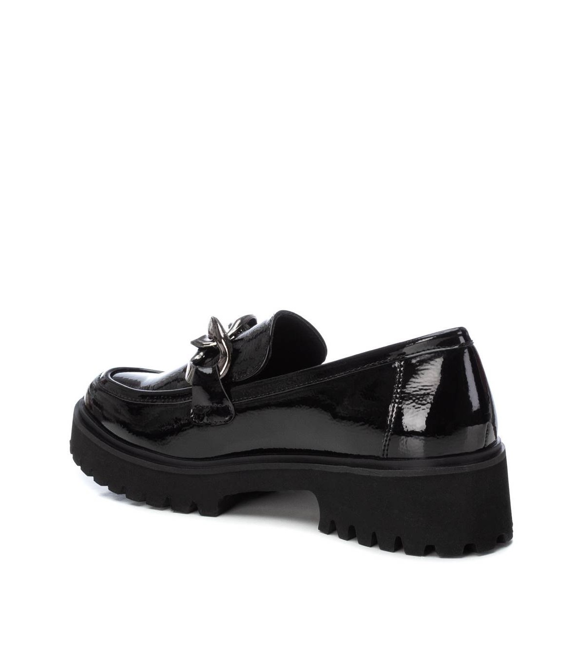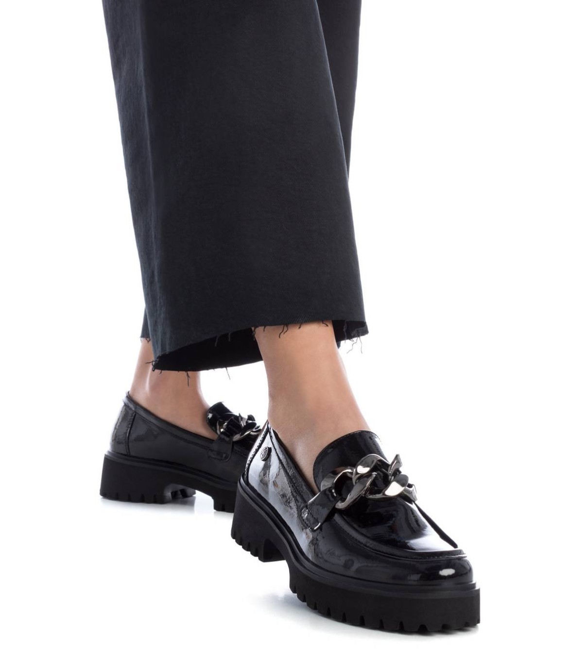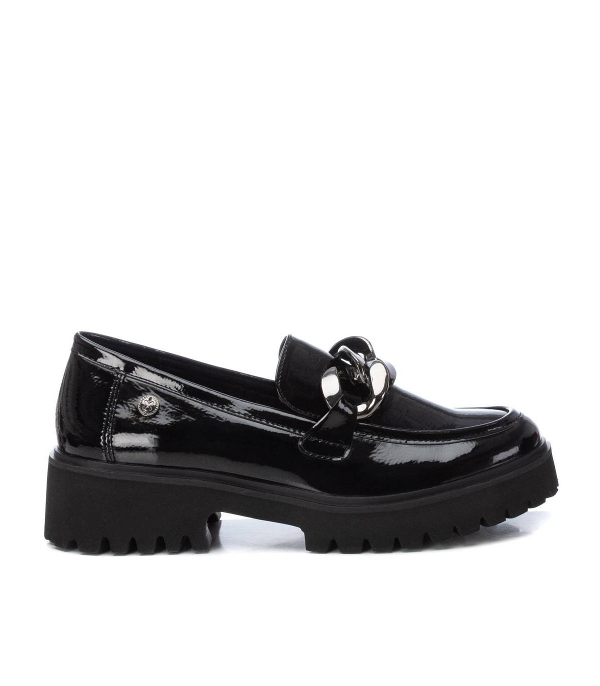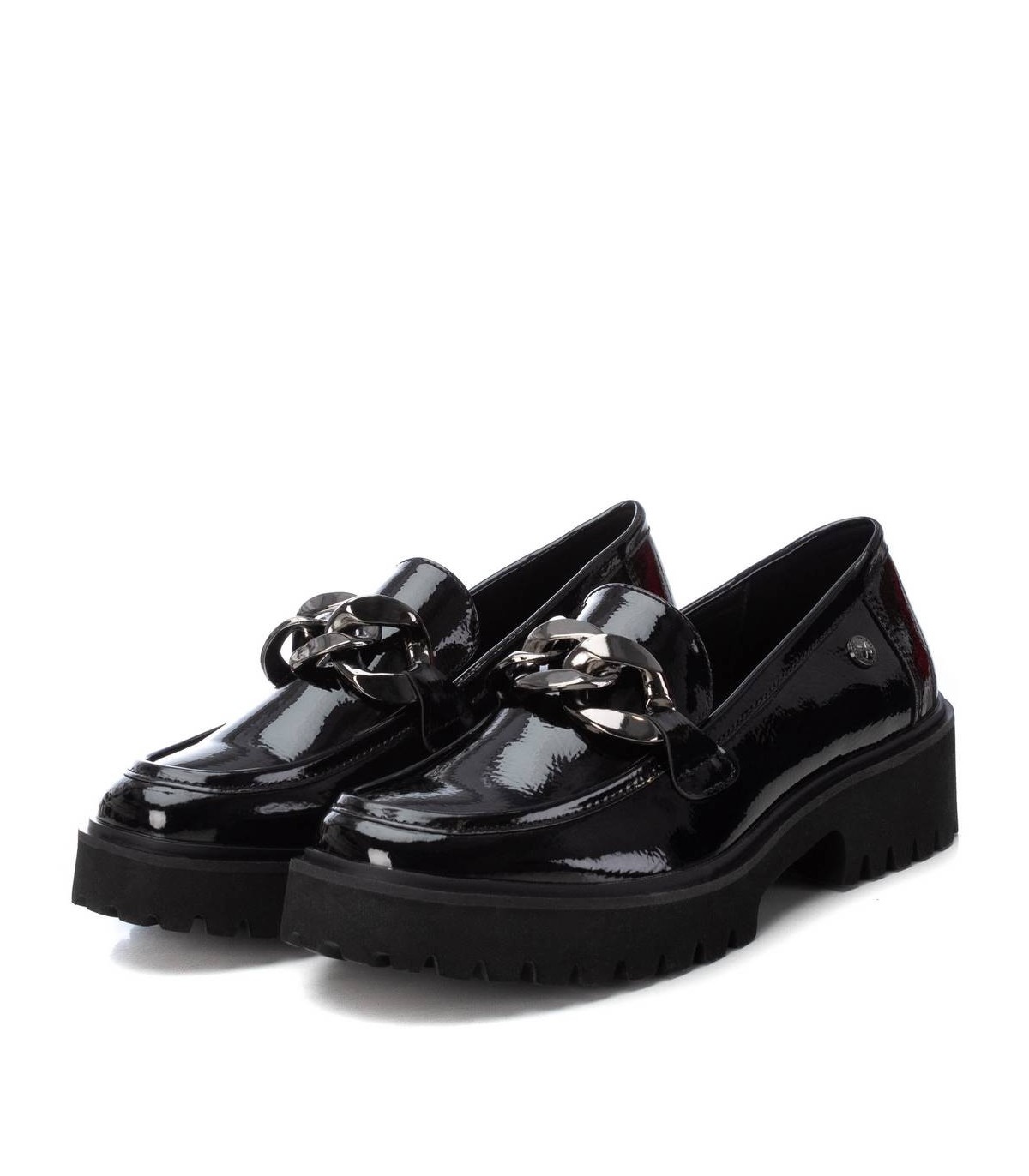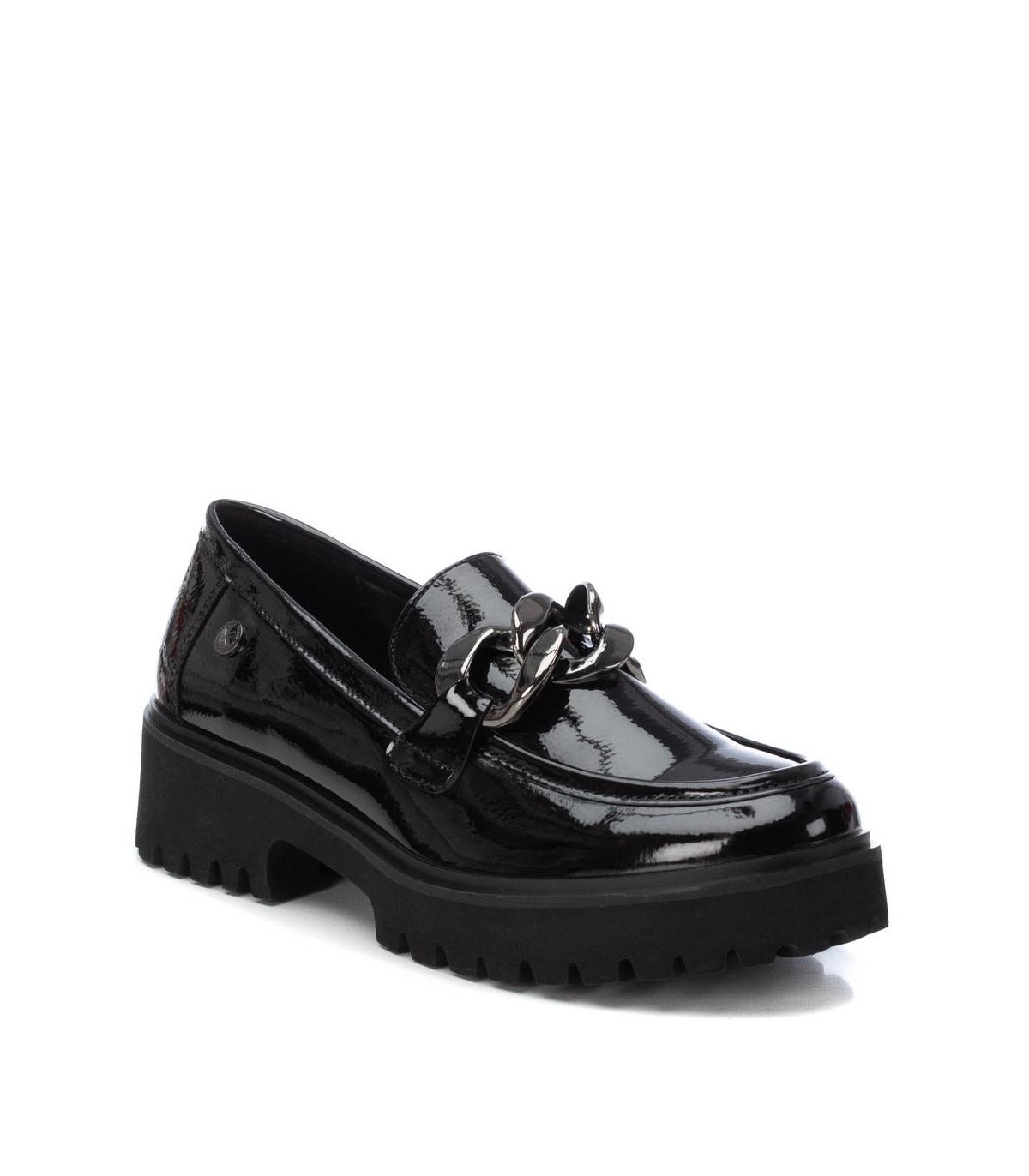 Mocasín de mujer, de la marca Xti. Fabricado en charol. Detalle decorativo en el frente. Suela dentada antideslizante. Tacón grueso de 4 cm. Un básico de invierno. Este modelo ha obtenido el certificado vegano por la organización mundial PETA (Organización de los derechos de los animales).