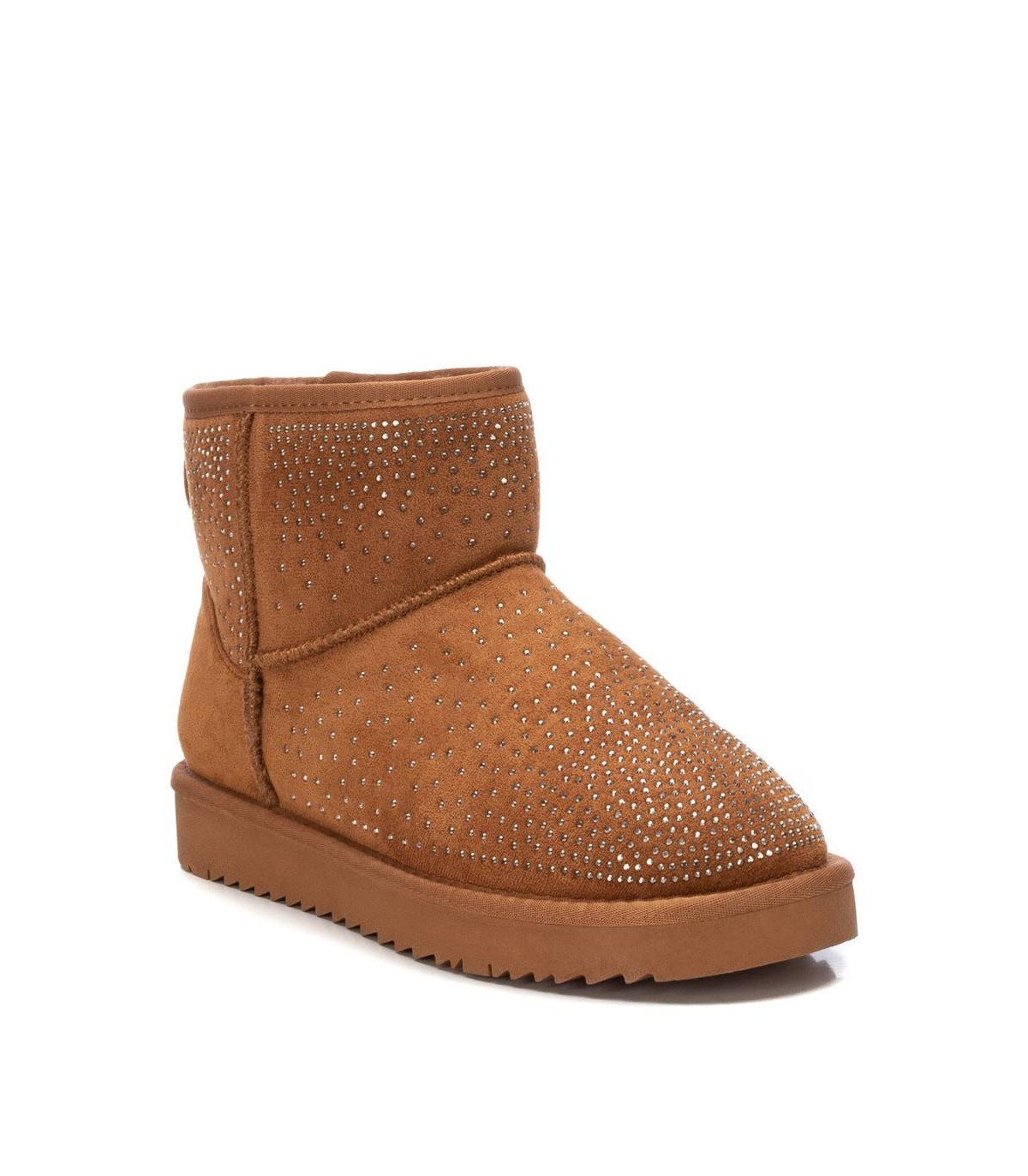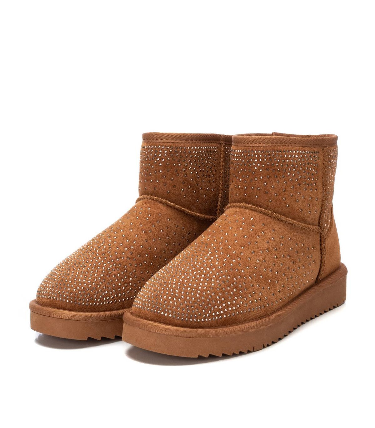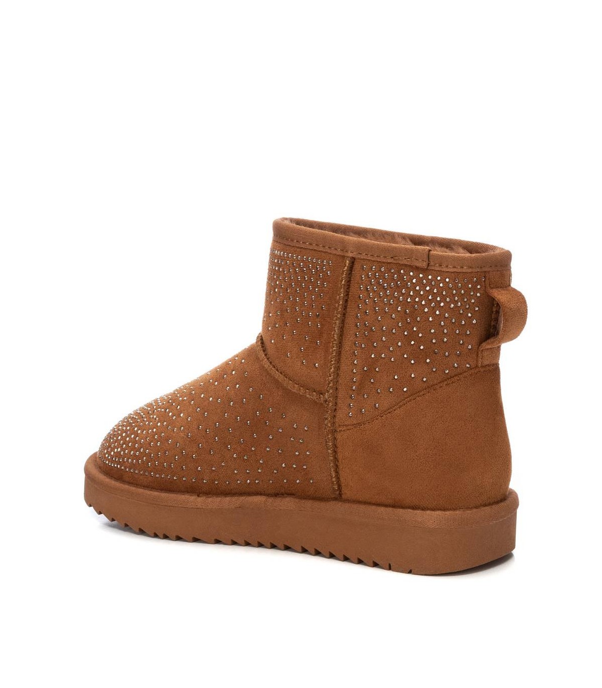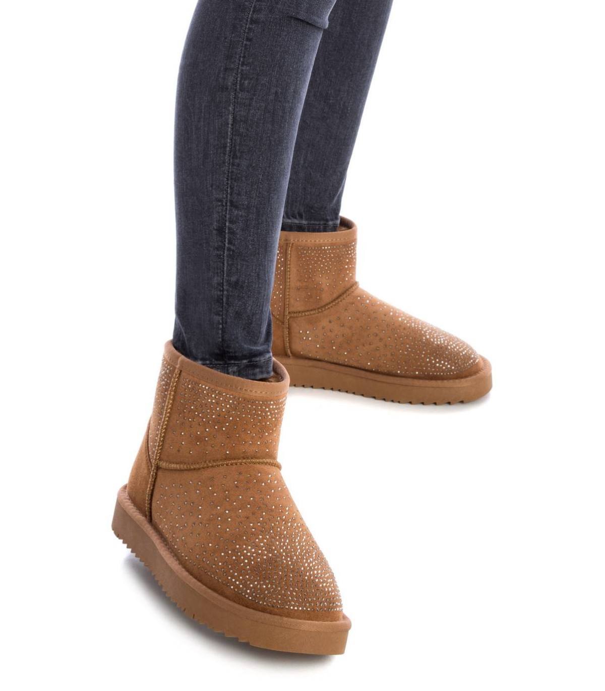 Botín de mujer, fabricado en una sueva antelina. Forro de pelito ideal para esta temporada de frío, tanto para llevarlo por la calle como en casa. Cómoda suela antideslizante. Decorado con cristales fantasía para darles un toque único. Este modelo ha obtenido el certificado vegano por la organización mundial PETA (Organización de los derechos de los animales).