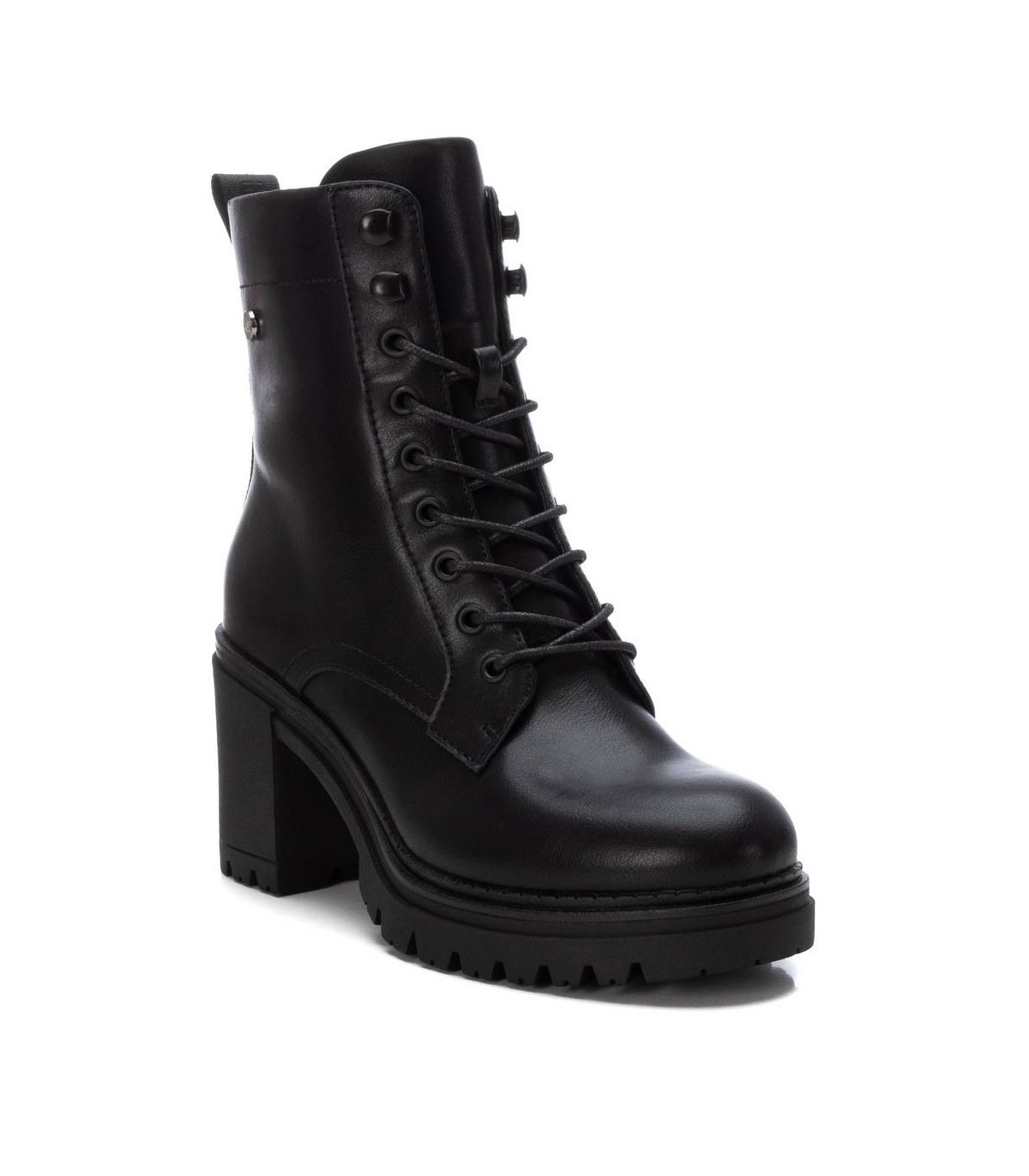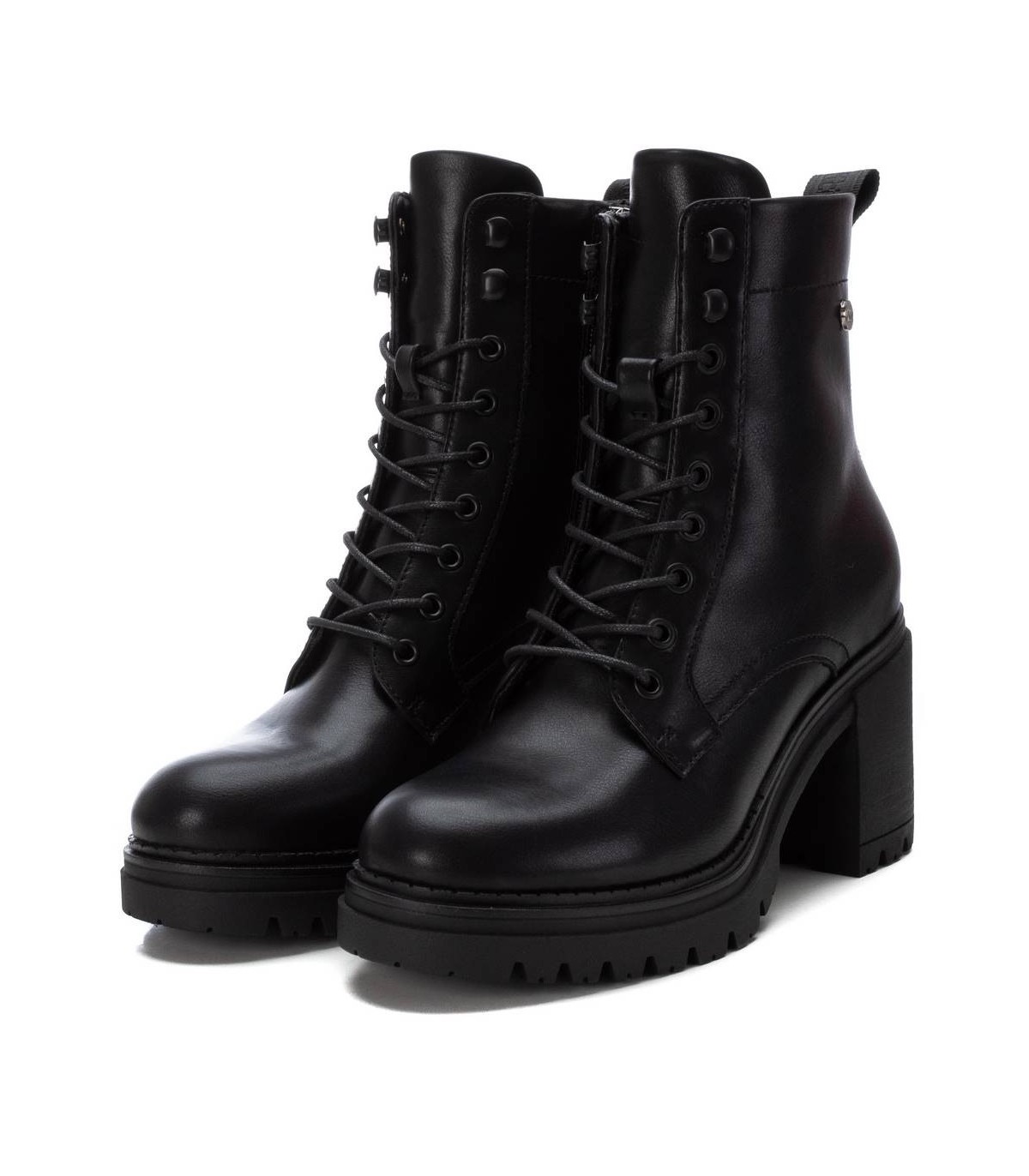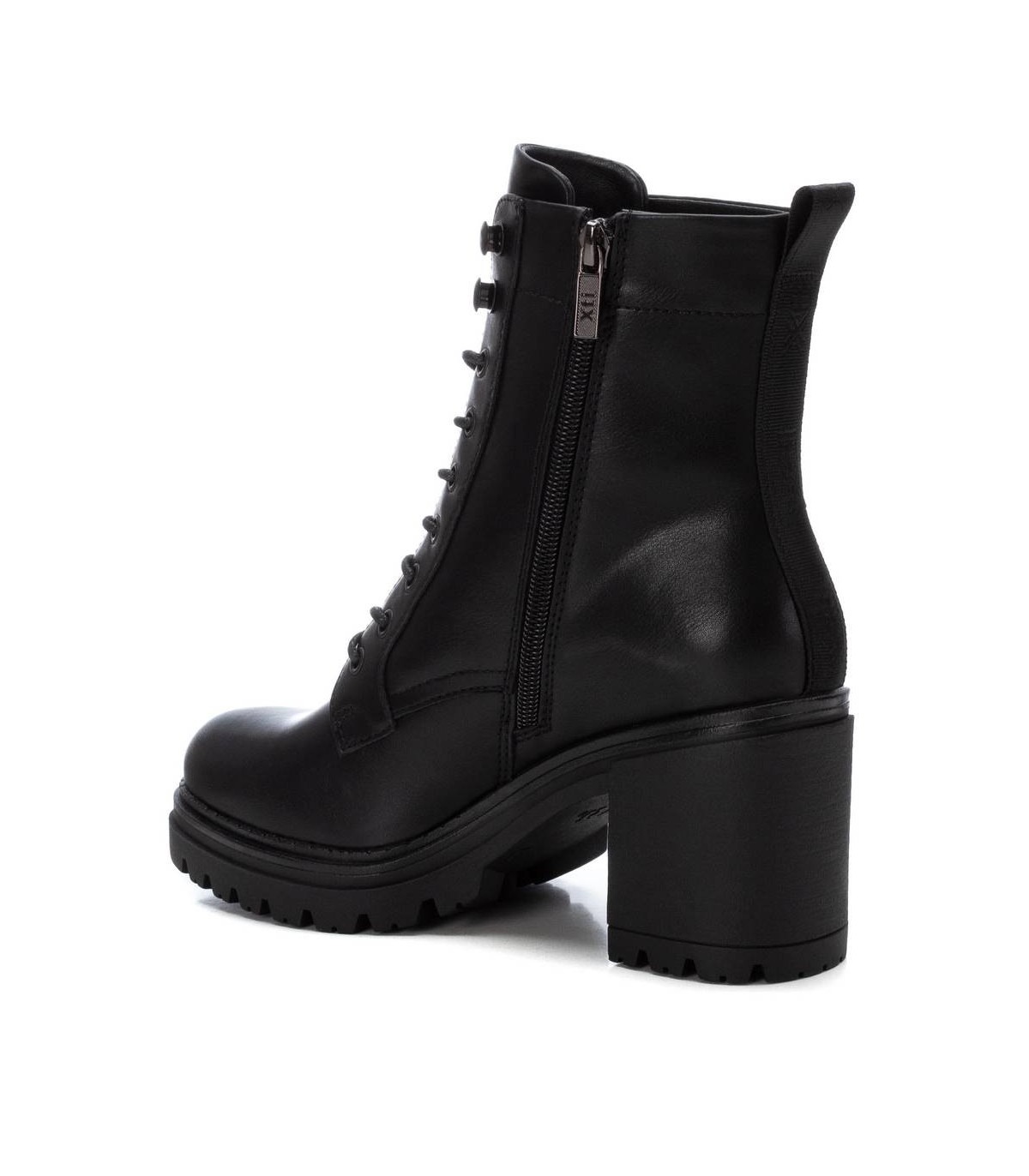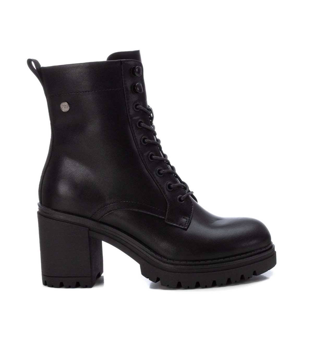 Botín de mujer, de la marca Xti. Fabricado en un material que imita la piel. Cierre mediante cremallera lateral y cordones para un mayor ajuste. Tacón ancho de 7 cm y suela de goma antideslizante. Este modelo ha obtenido el certificado vegano por la organización mundial PETA (Organización de los derechos de los animales).