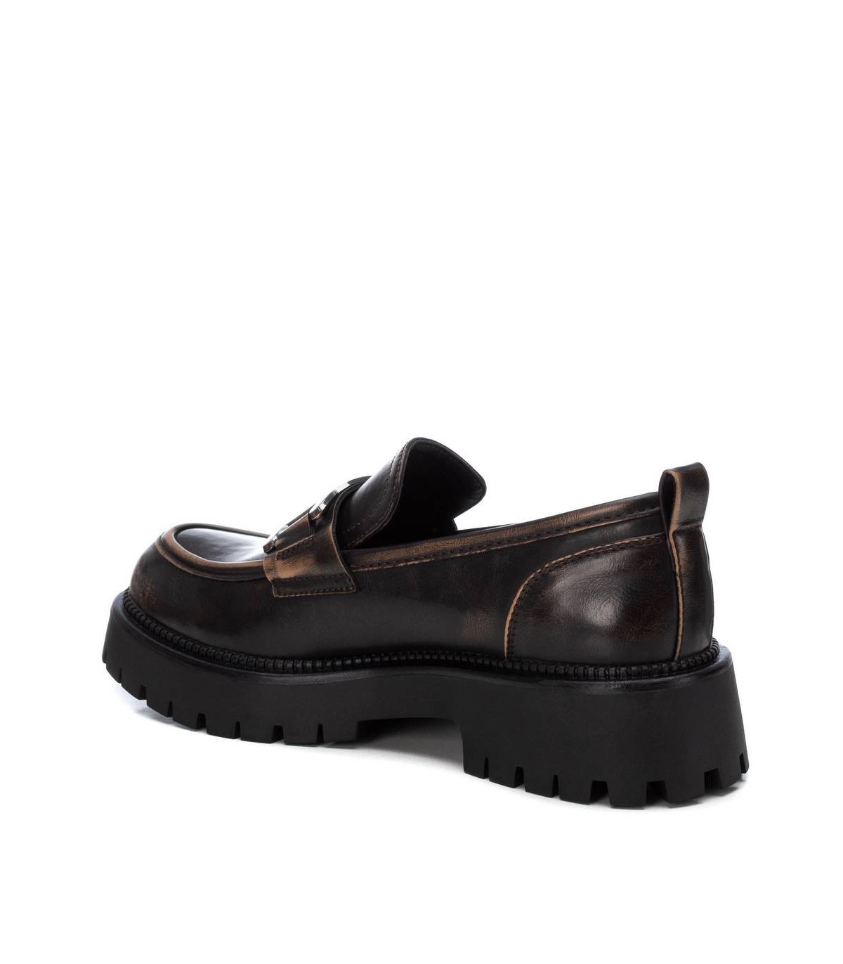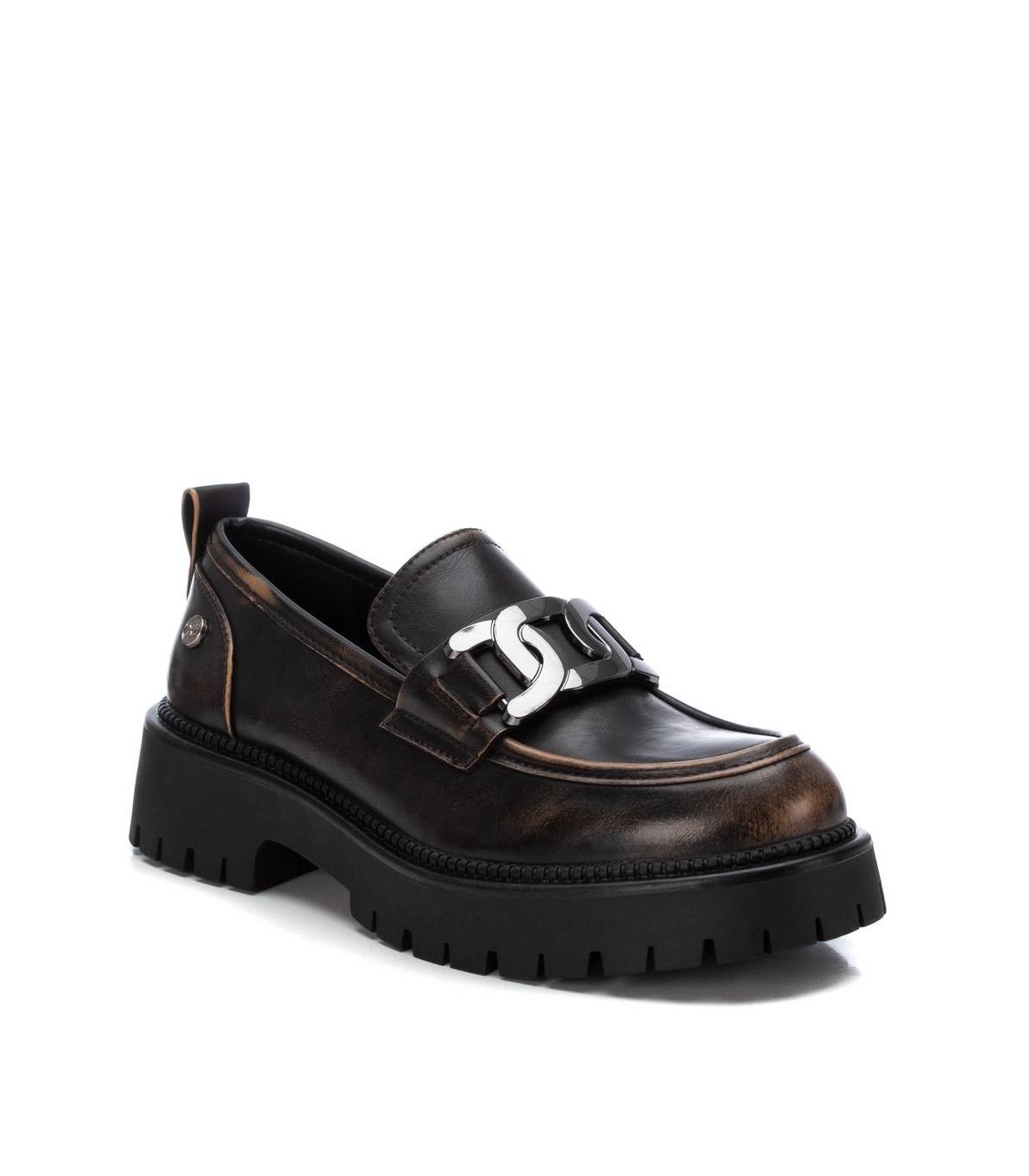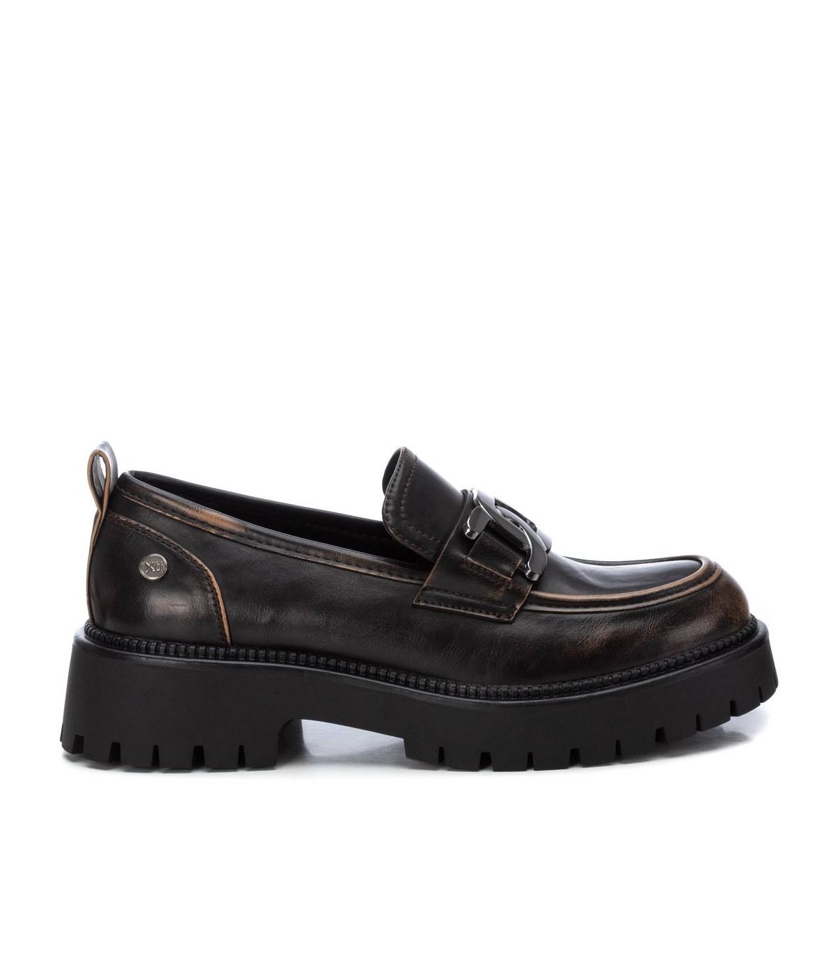 Mocasín de mujer, de la marca Xti. Fabricado en un material que imita la piel. Cadena decorativa en el frente. Suela antideslizante, dentada de 4 cm. Un básico para el armario y crear diferentes looks. Este modelo ha obtenido el certificado vegano por la organización mundial PETA (Organización de los derechos de los animales).