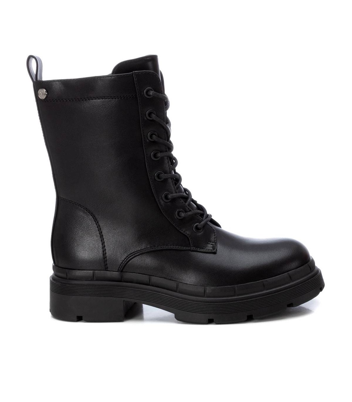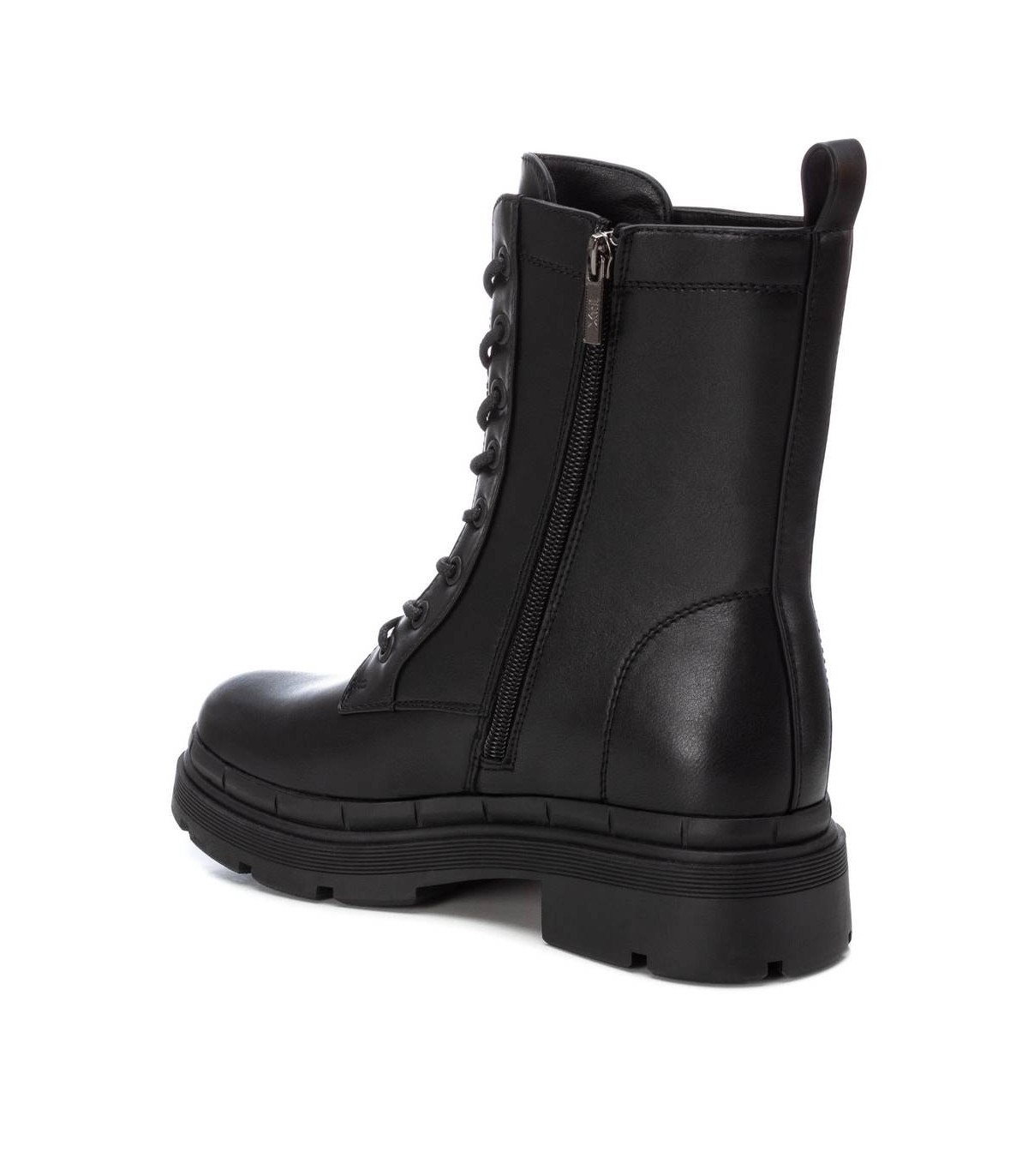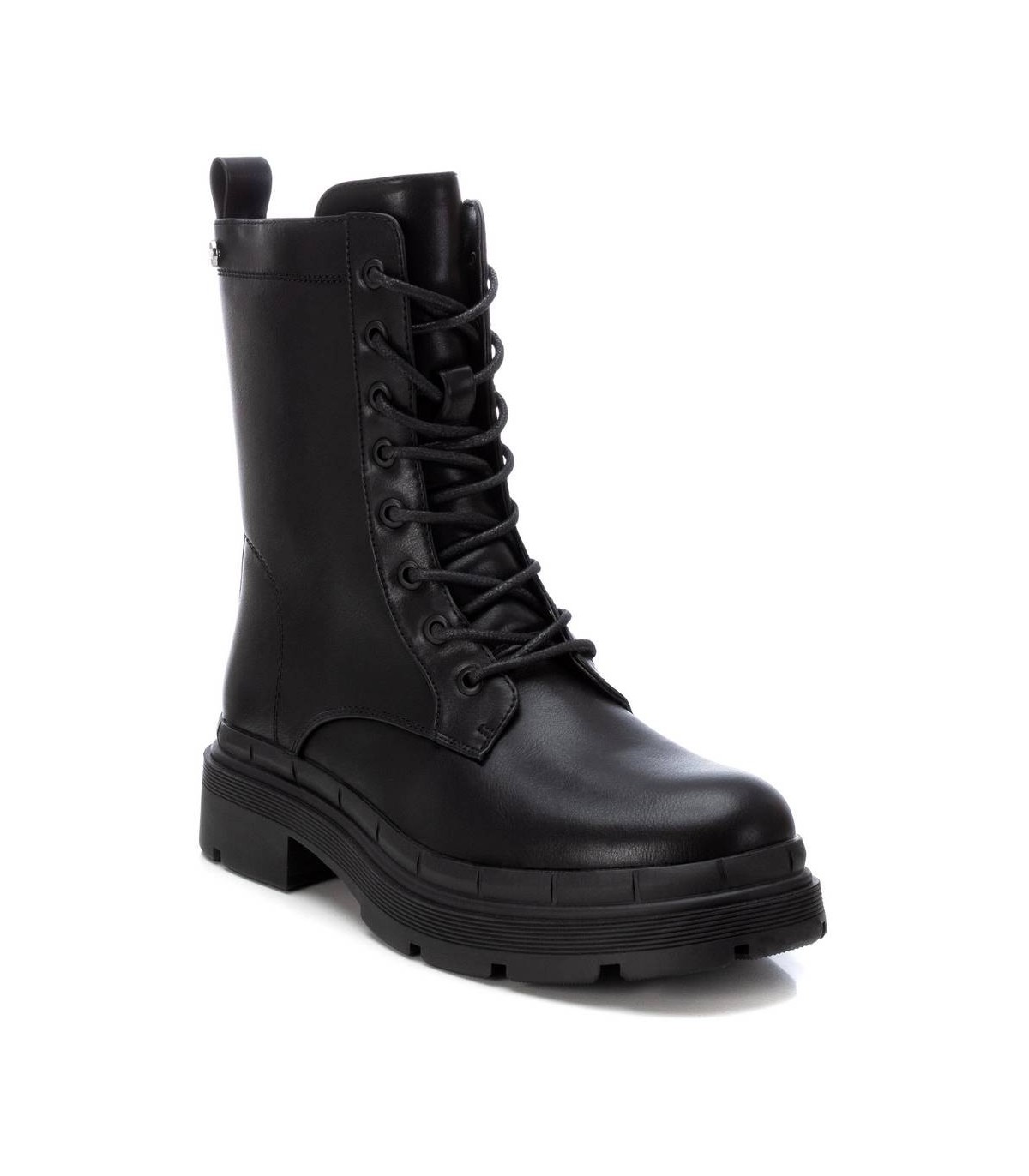 Botín de mujer, de la marca Xti. Fabricada en un material que imita la piel. Botín estilo militar. Tendencia. Cierre cremallera y cordones ajustables para un mayor ajuste. 4 cm de tacón grueso y suela antideslizante. Este modelo ha obtenido el certificado vegano por la organización mundial PETA (Organización de los derechos de los animales).