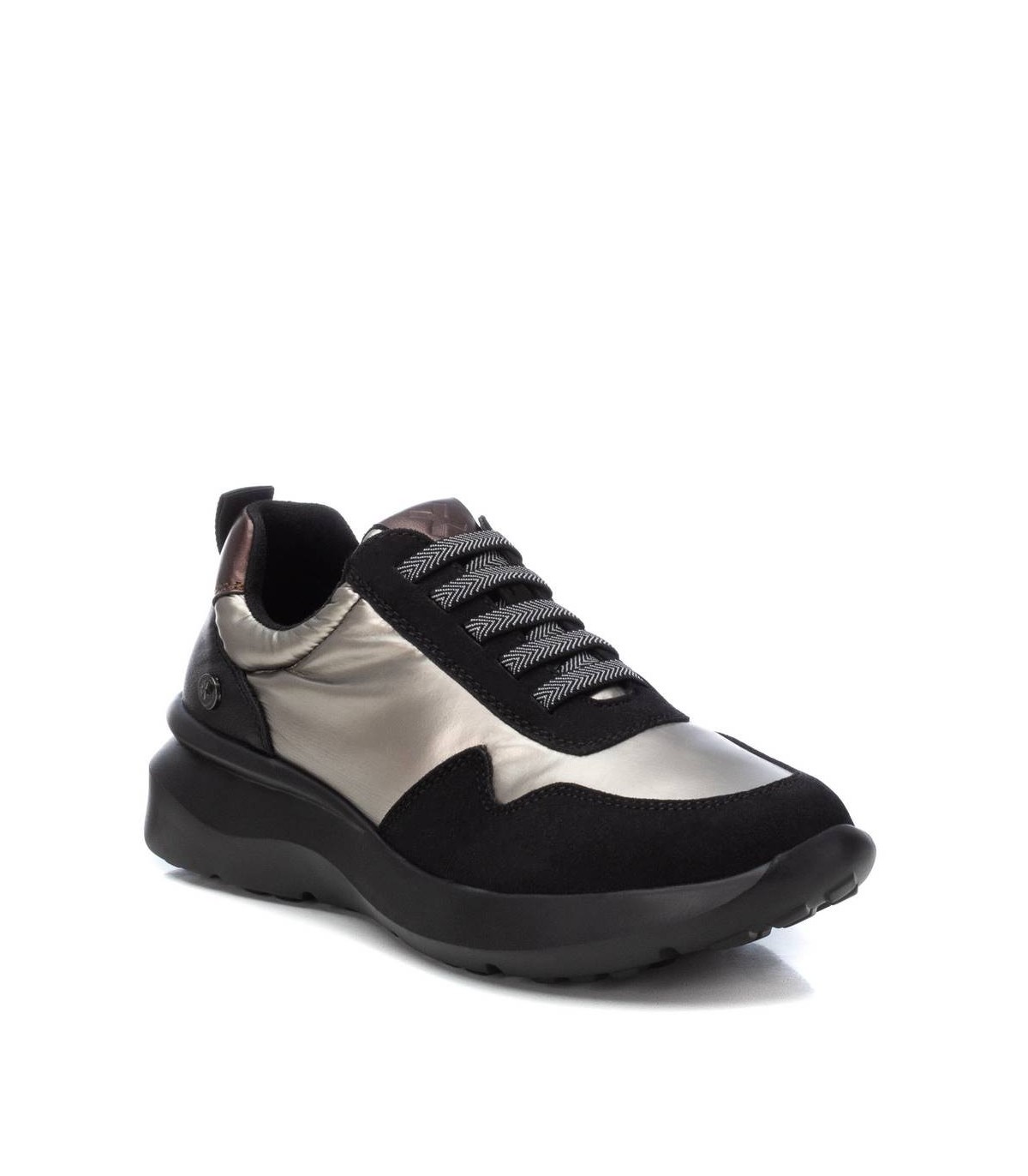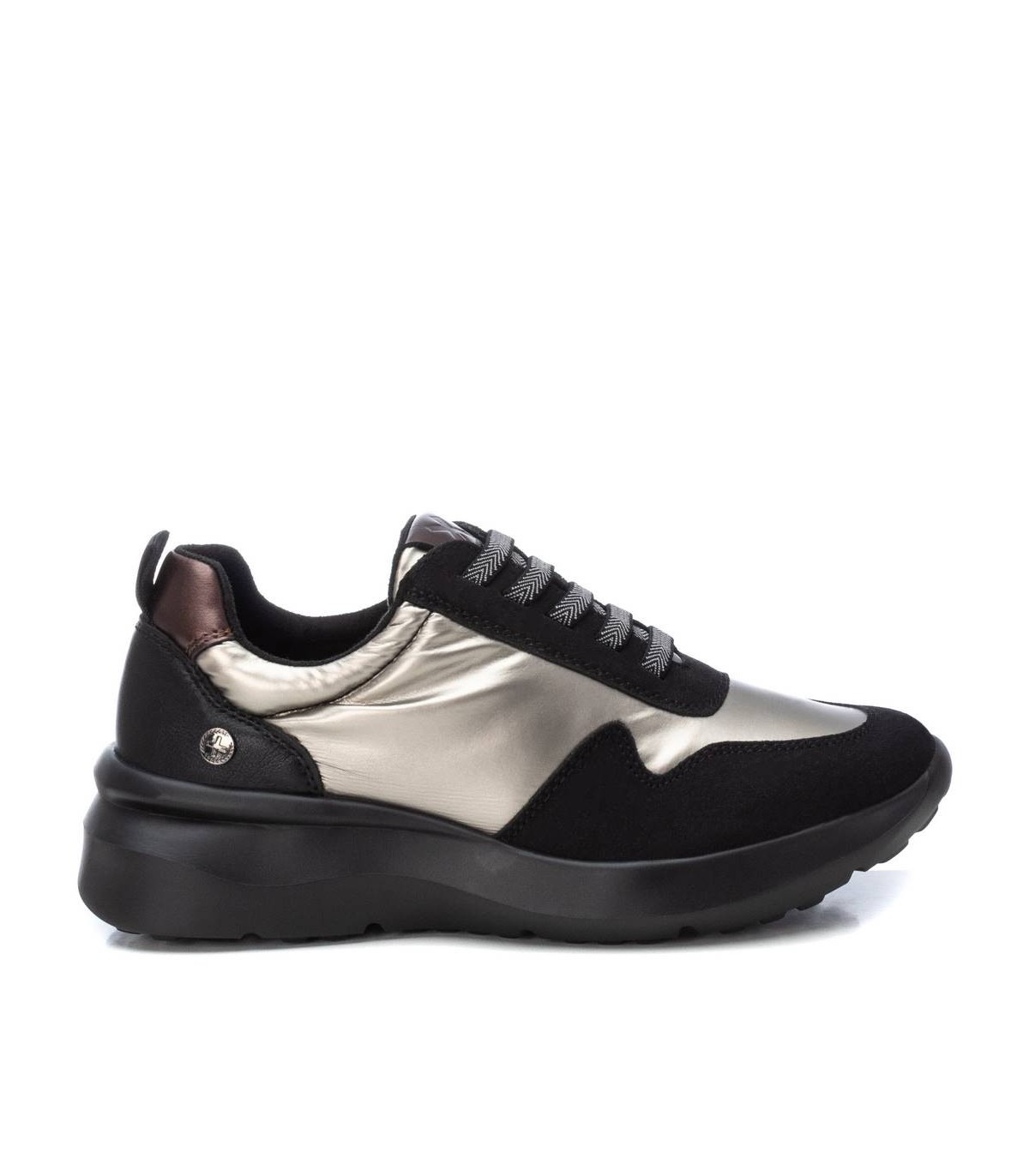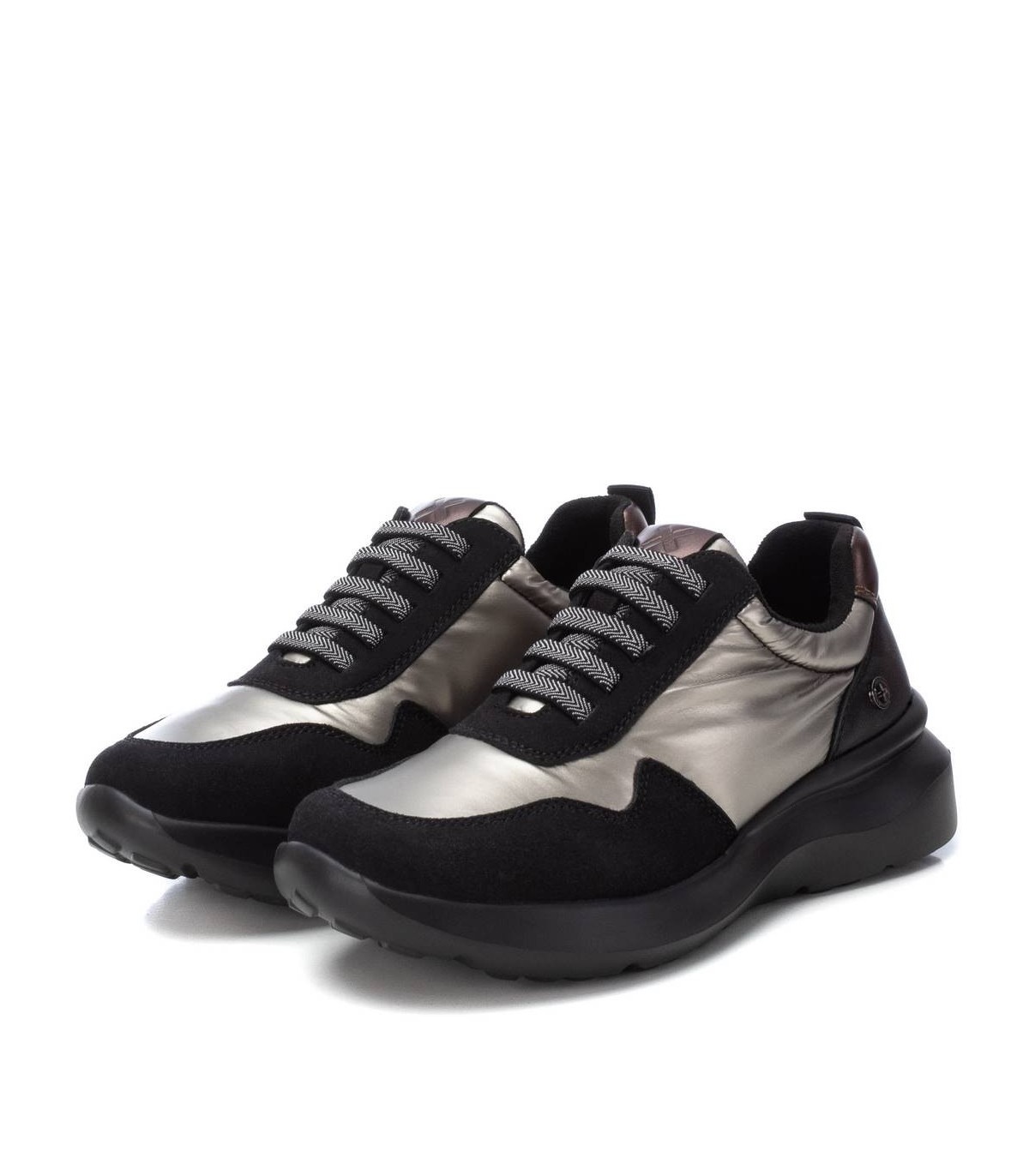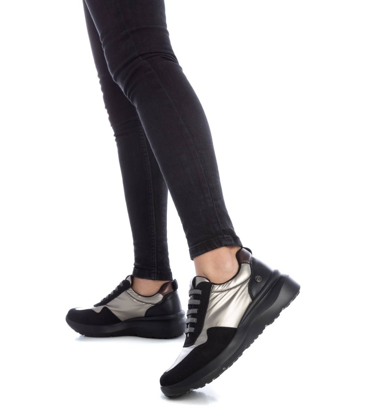 Zapatilla de mujer, de la marca Xti. Fabricada en diversos materiales textiles. Detalles metalizados. Cierre con cordones ajustables. Suela 4 cm de cuña antideslizante. Con plantilla extraíble. Este modelo ha obtenido el certificado vegano por la organización mundial PETA (Organización de los derechos de los animales).