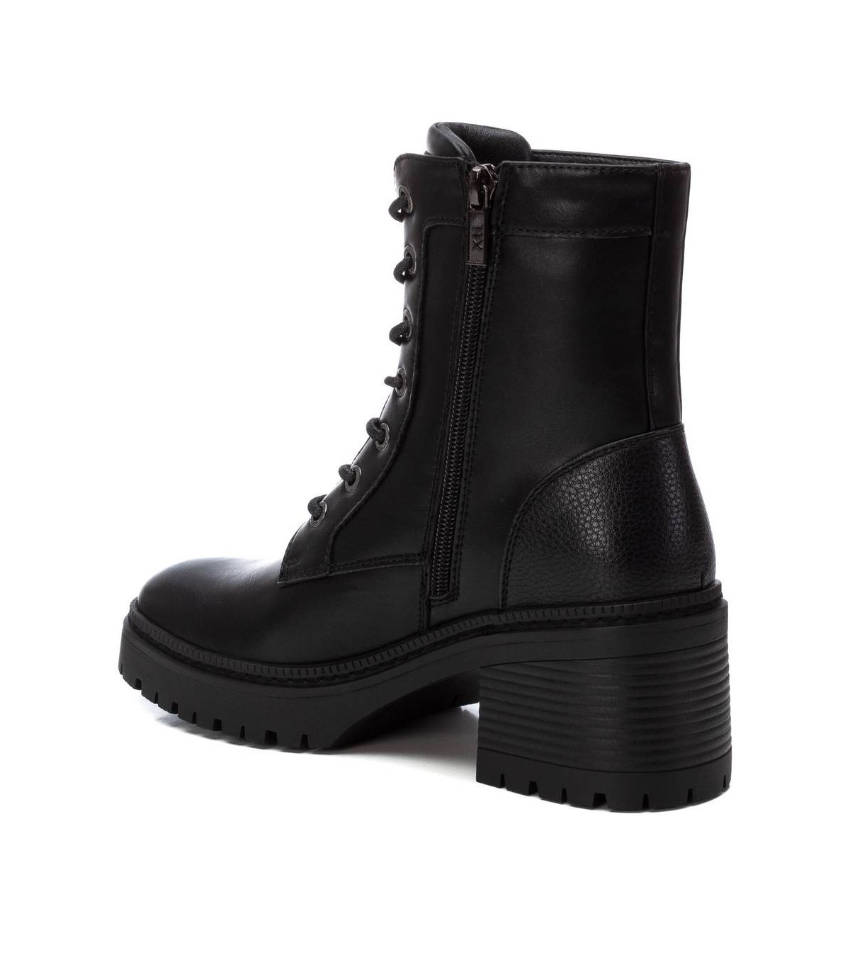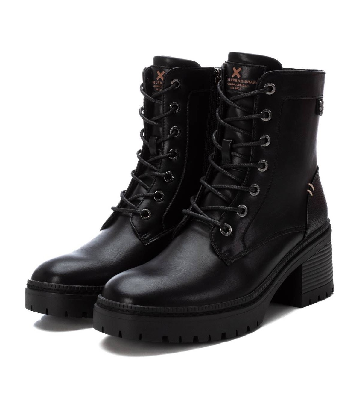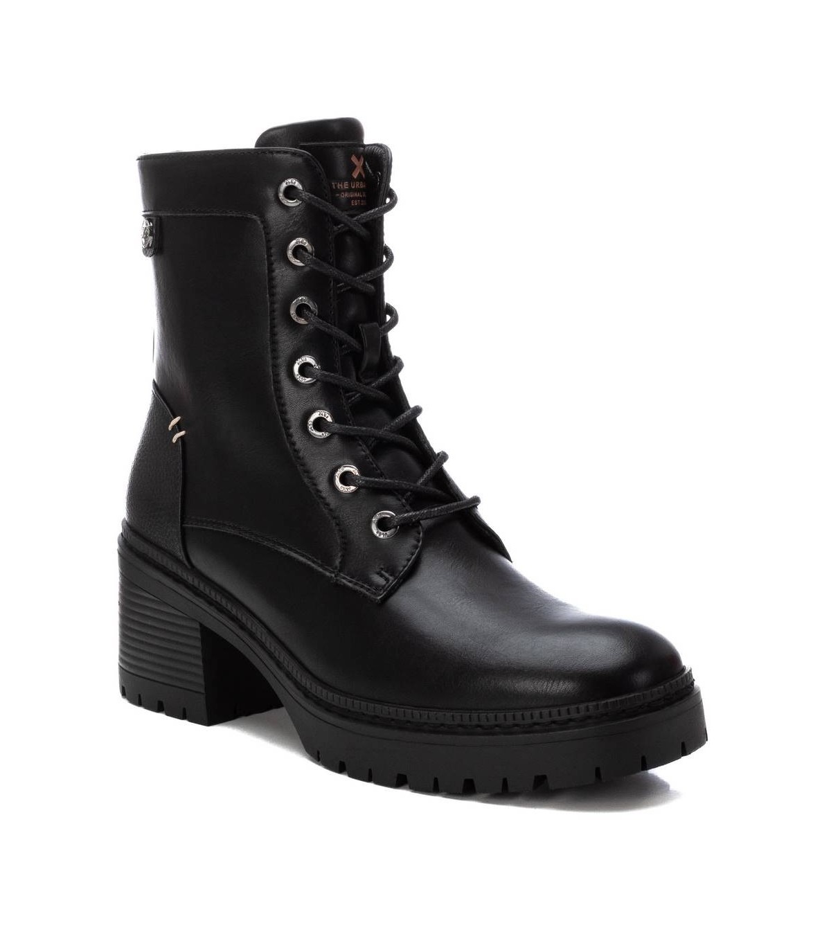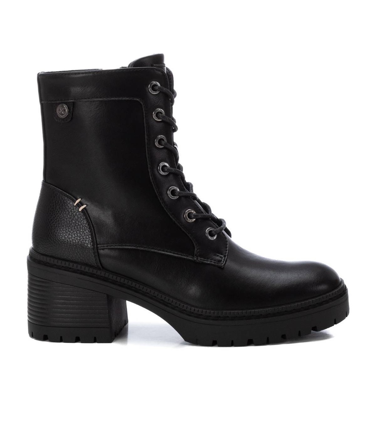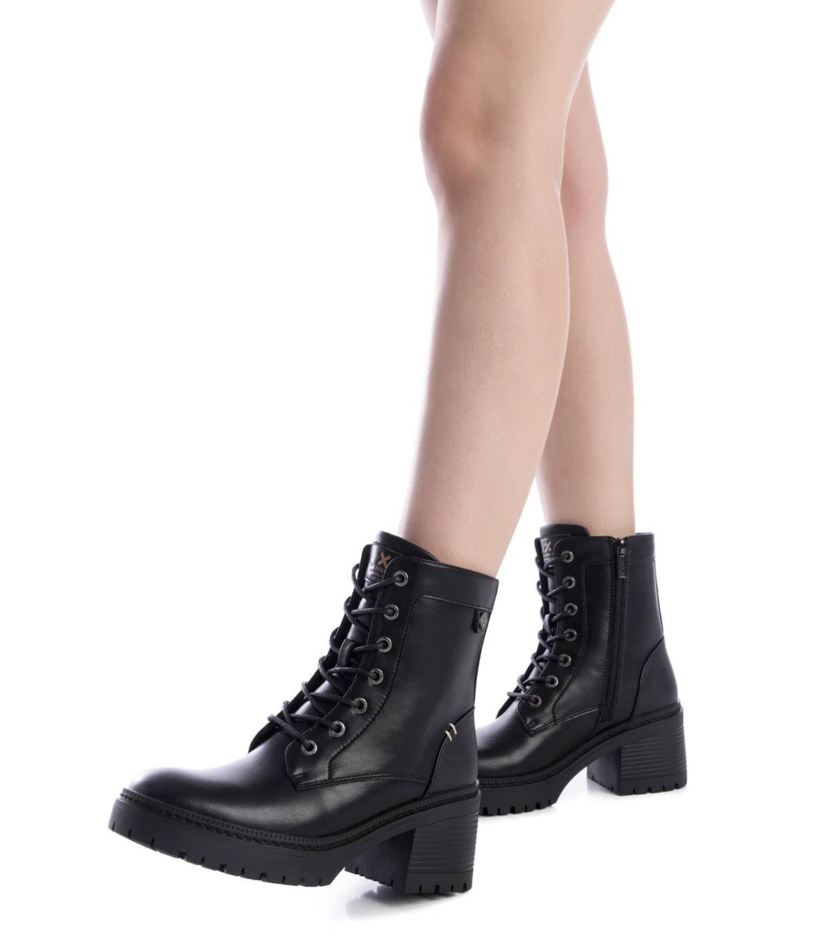 Botín de mujer, de la marca Xti. Fabricada en un material que imita la piel. Cierre cremallera lateral y cordones regulables para un mayor ajuste. Detalles en metal. Tacón de 6 cm y suela de goma antideslizante. Este modelo ha obtenido el certificado vegano por la organización mundial PETA (Organización de los derechos de los animales).
