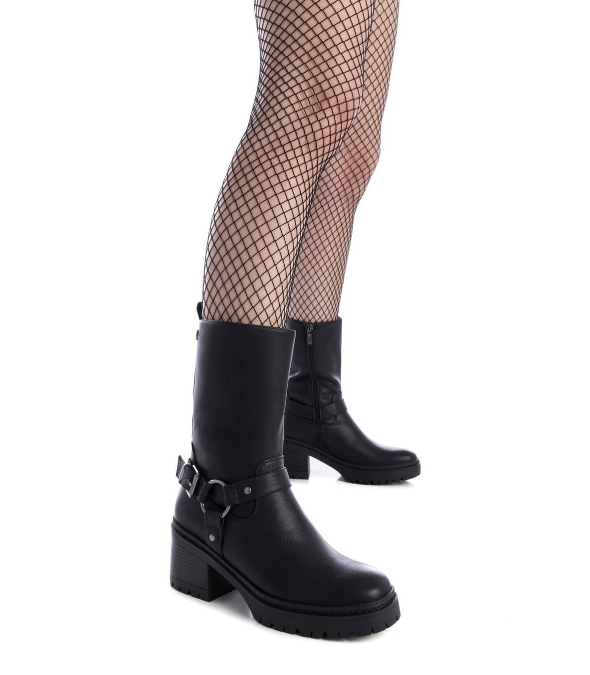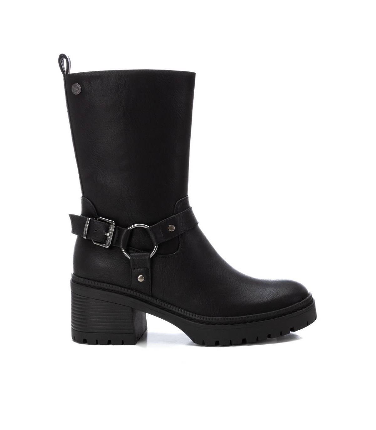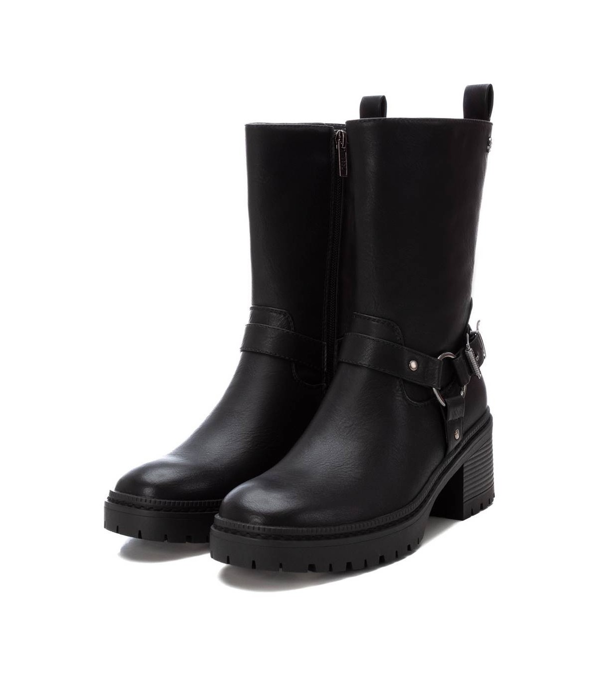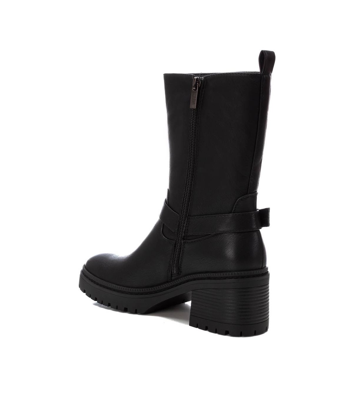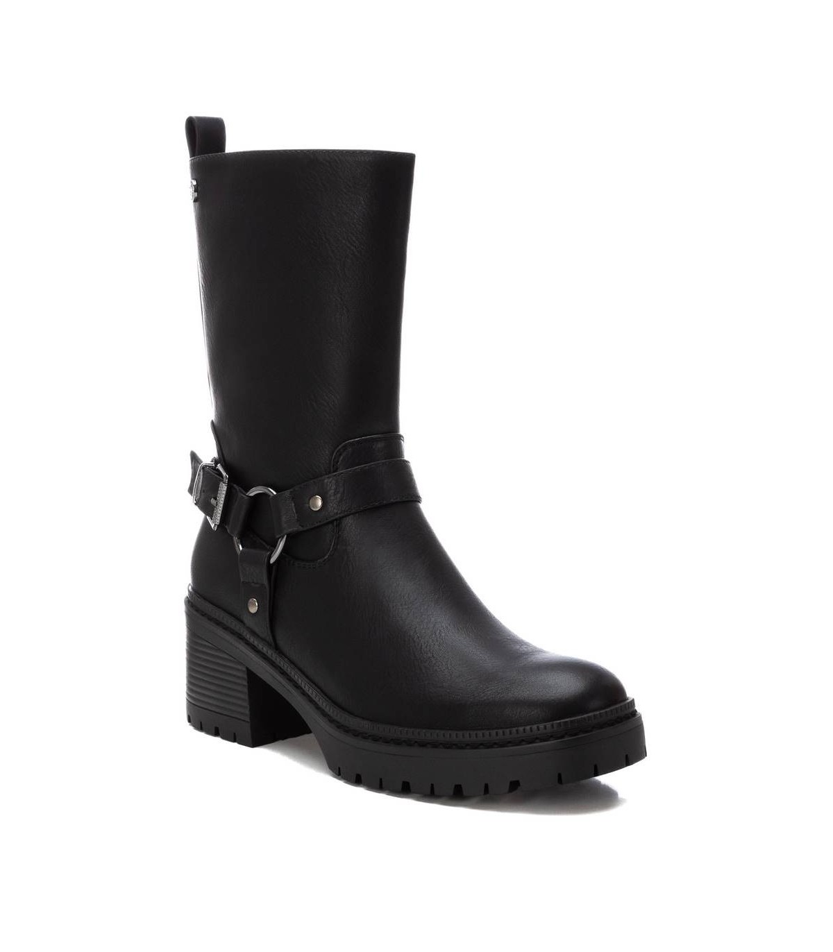 Botín de mujer, de la marca Xti. Fabricada en material que imita la piel. Botín biker con detalles de hebillas, un modelo en tendencia esta temporada. Con tacón de 6 cm y suela gruesa antideslizante. No puede faltar en tu armario. Este modelo ha obtenido el certificado vegano por la organización mundial PETA (Organización de los derechos de los animales).