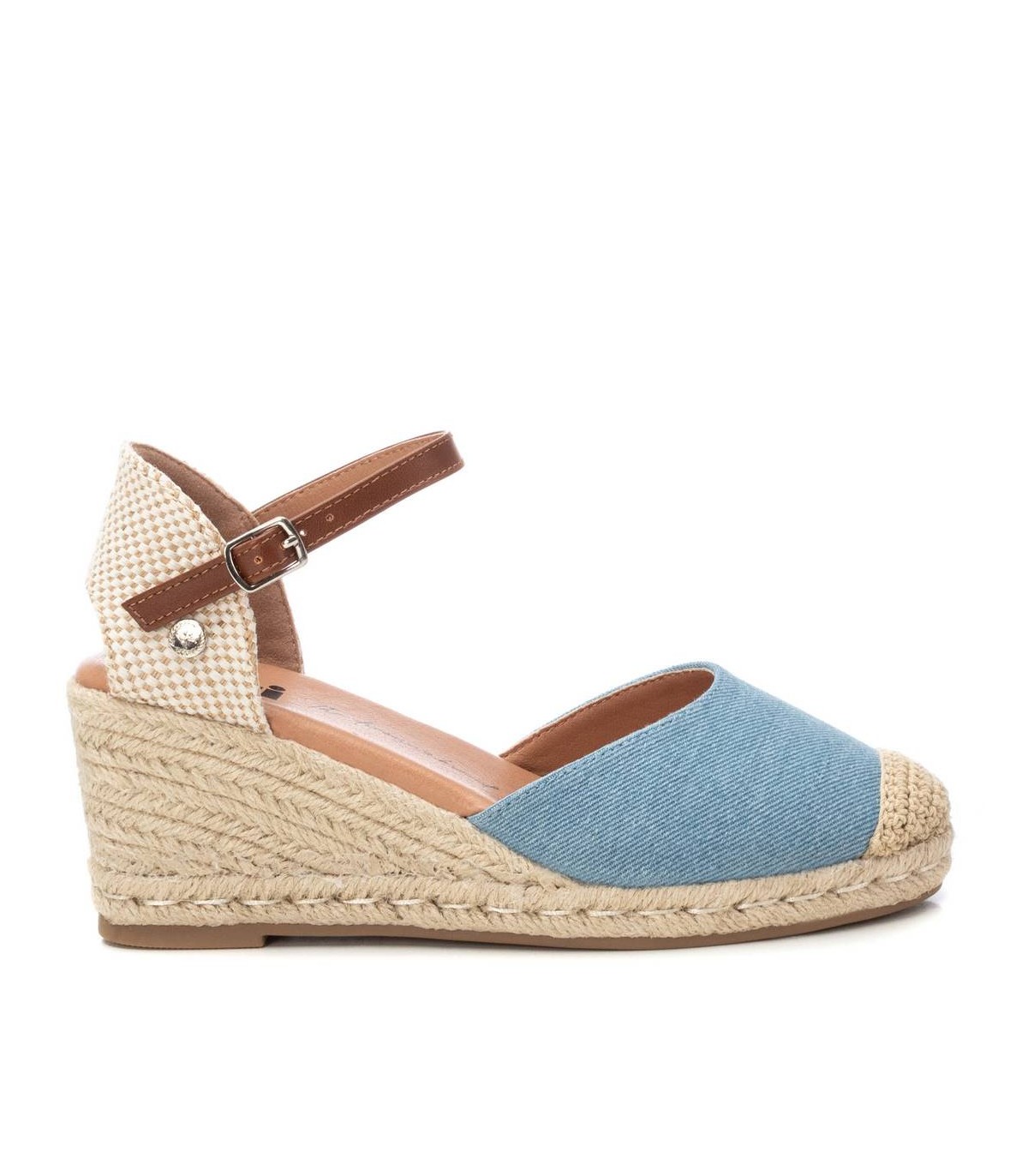 Zapato de mujer con cuña tipo valenciana, de la marca Xti. Fabricada en tres tipos de materiales distintos, siendo la puntera antelina, la trasera lona y el cierre, mediante tira y hebilla, de material que imita la piel. Cuña de 7 cm de yute con suela de goma antideslizante. Este modelo ha obtenido el certificado vegano por la organización mundial PETA (Organización de los derechos de los animales).