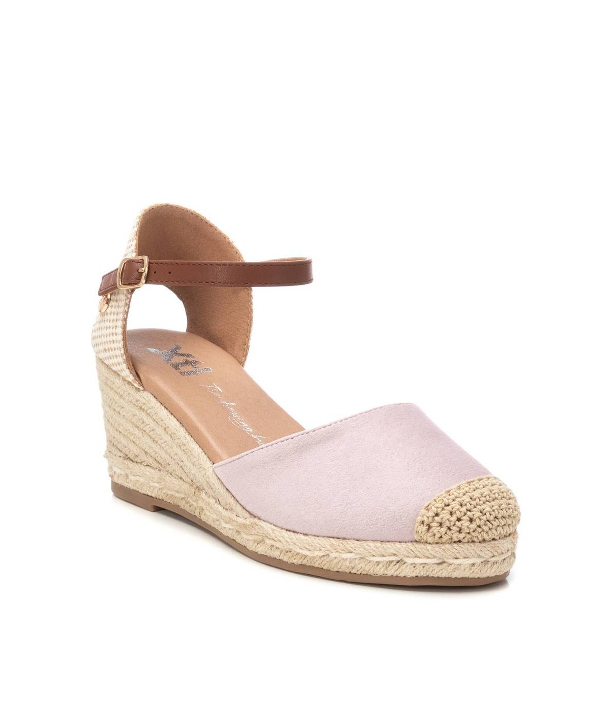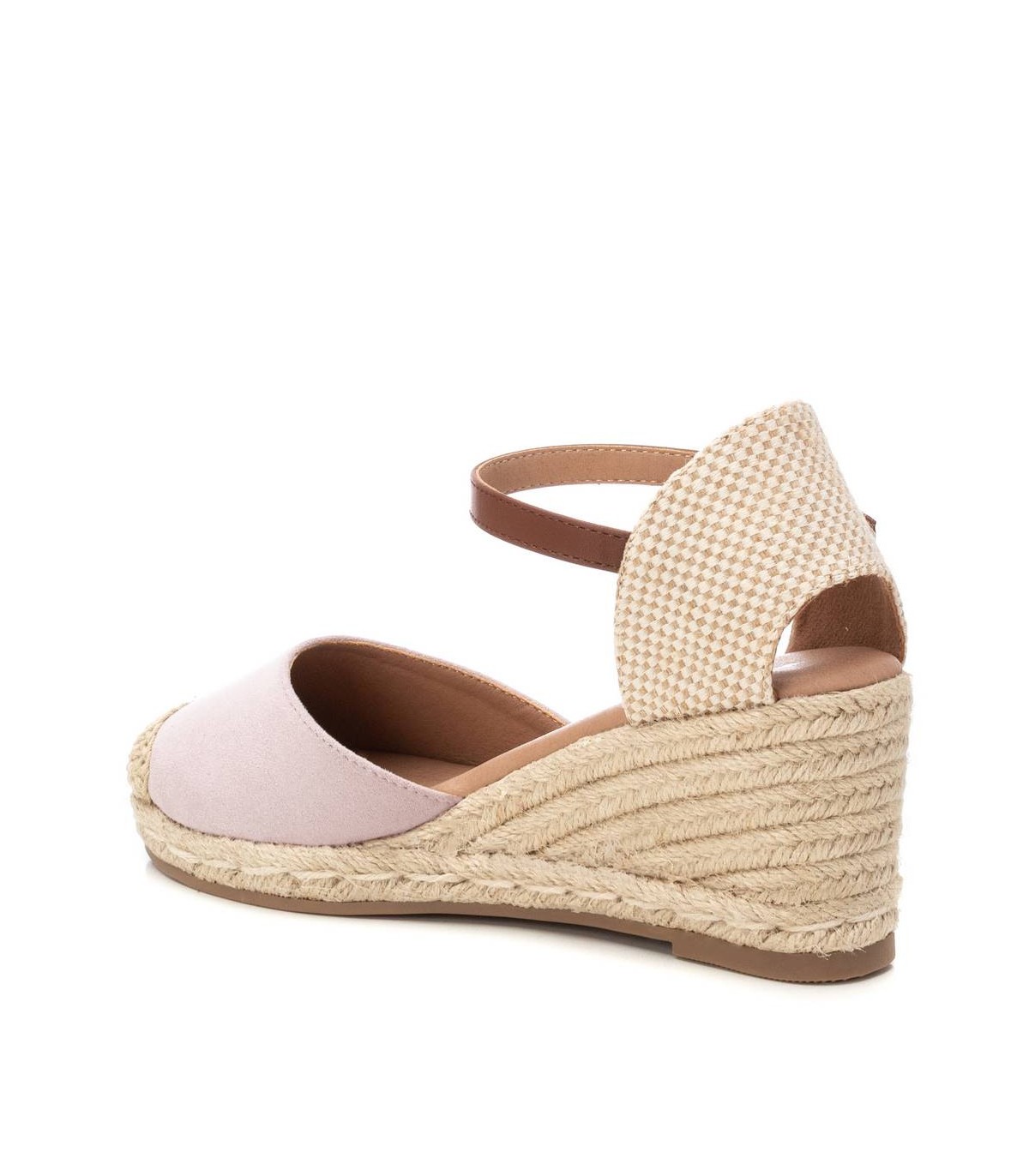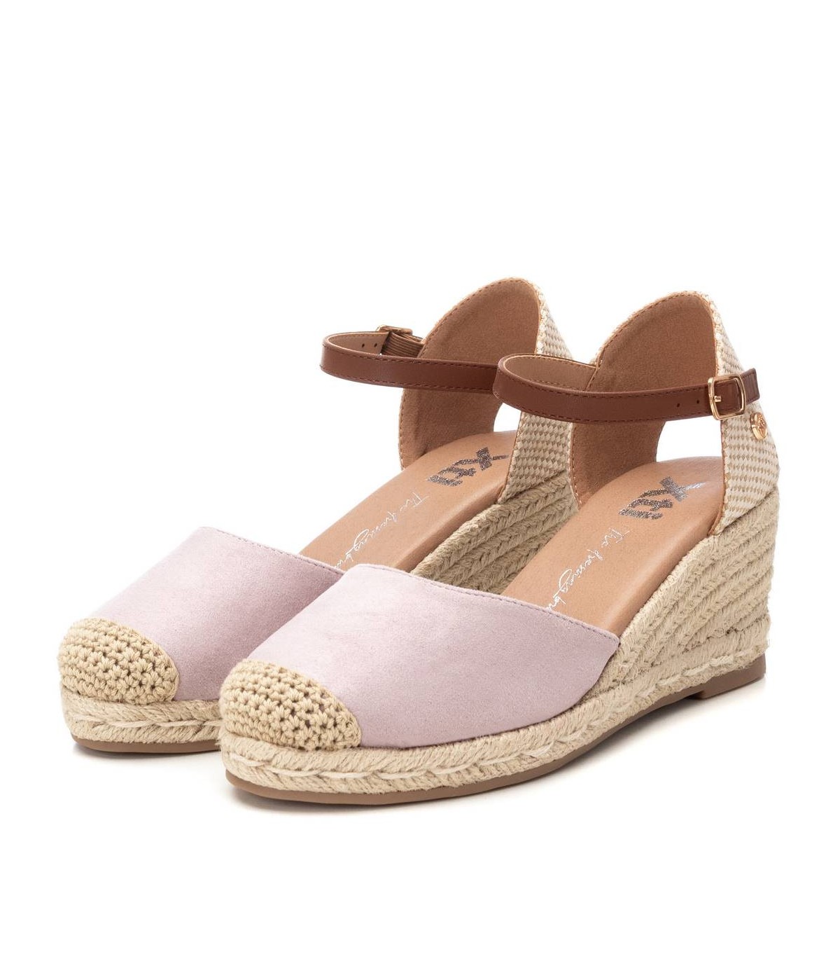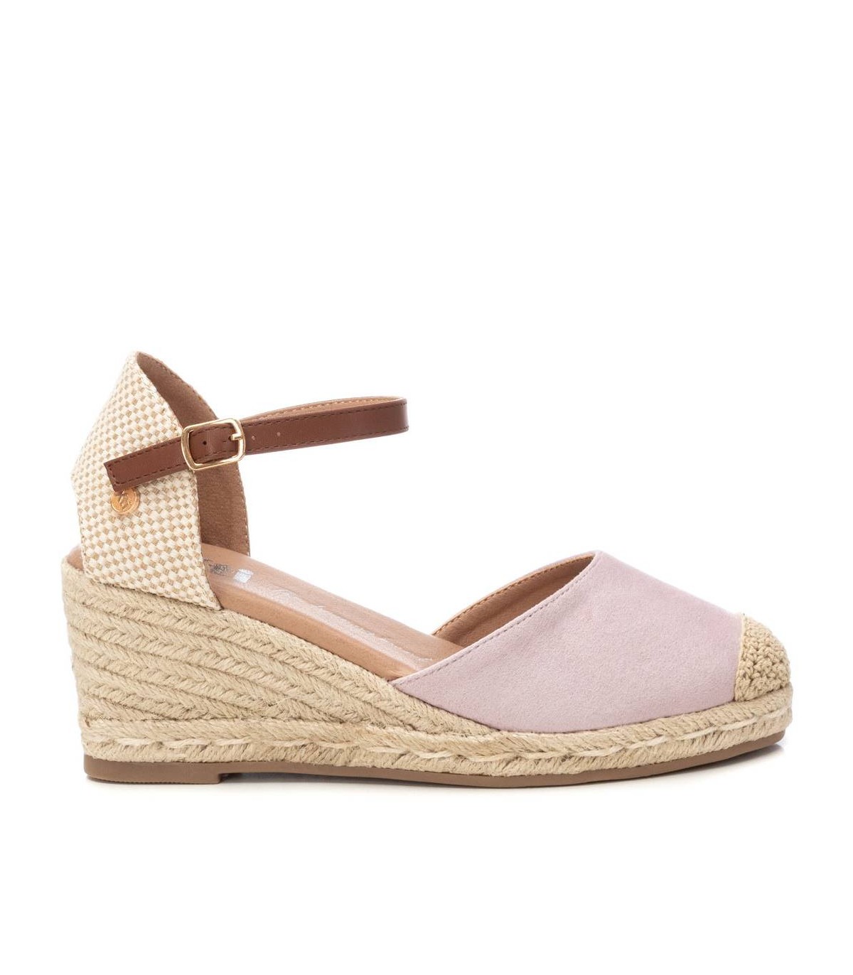 Zapato de mujer con cuña tipo valenciana, de la marca Xti. Fabricada en tres tipos de materiales distintos, siendo la puntera antelina, la trasera lona y el cierre, mediante tira y hebilla, de material que imita la piel. Cuña de 7 cm de yute con suela de goma antideslizante. Este modelo ha obtenido el certificado vegano por la organización mundial PETA (Organización de los derechos de los animales).