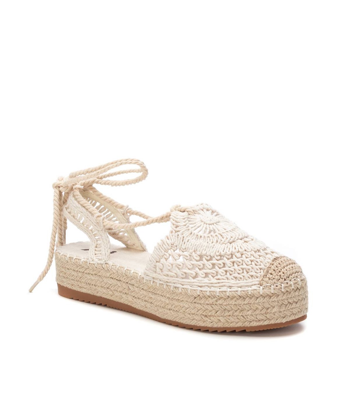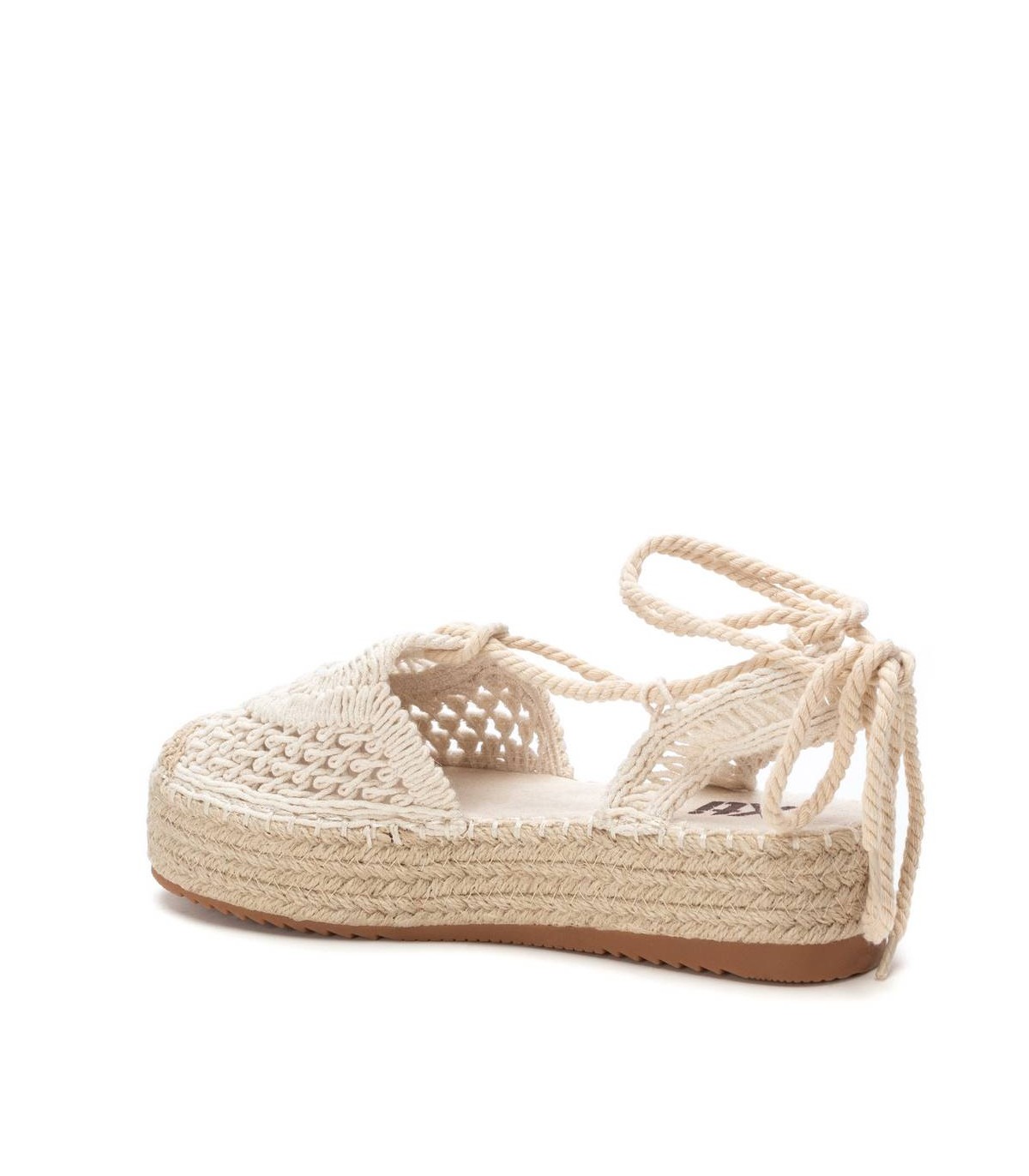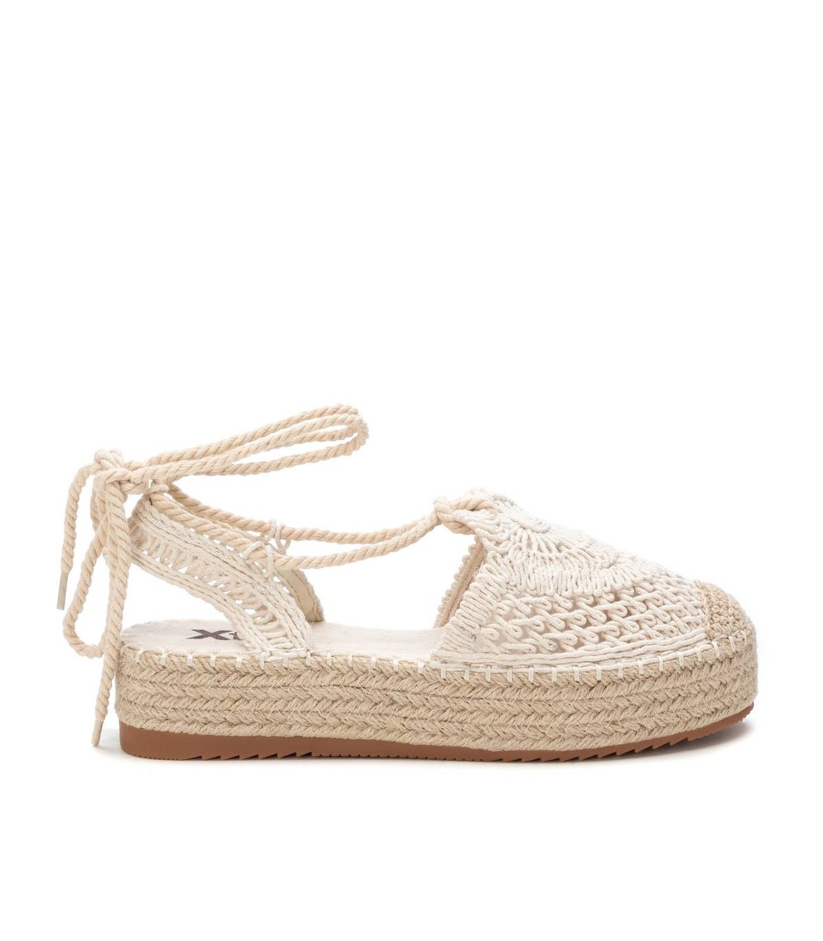 Zapato de mujer con plataforma plana tipo valenciana, de la marca Xti. Fabricada en material textil estilo crochet. Tira atada al tobillo al tono. Cuña de yute con suela de goma antideslizante.