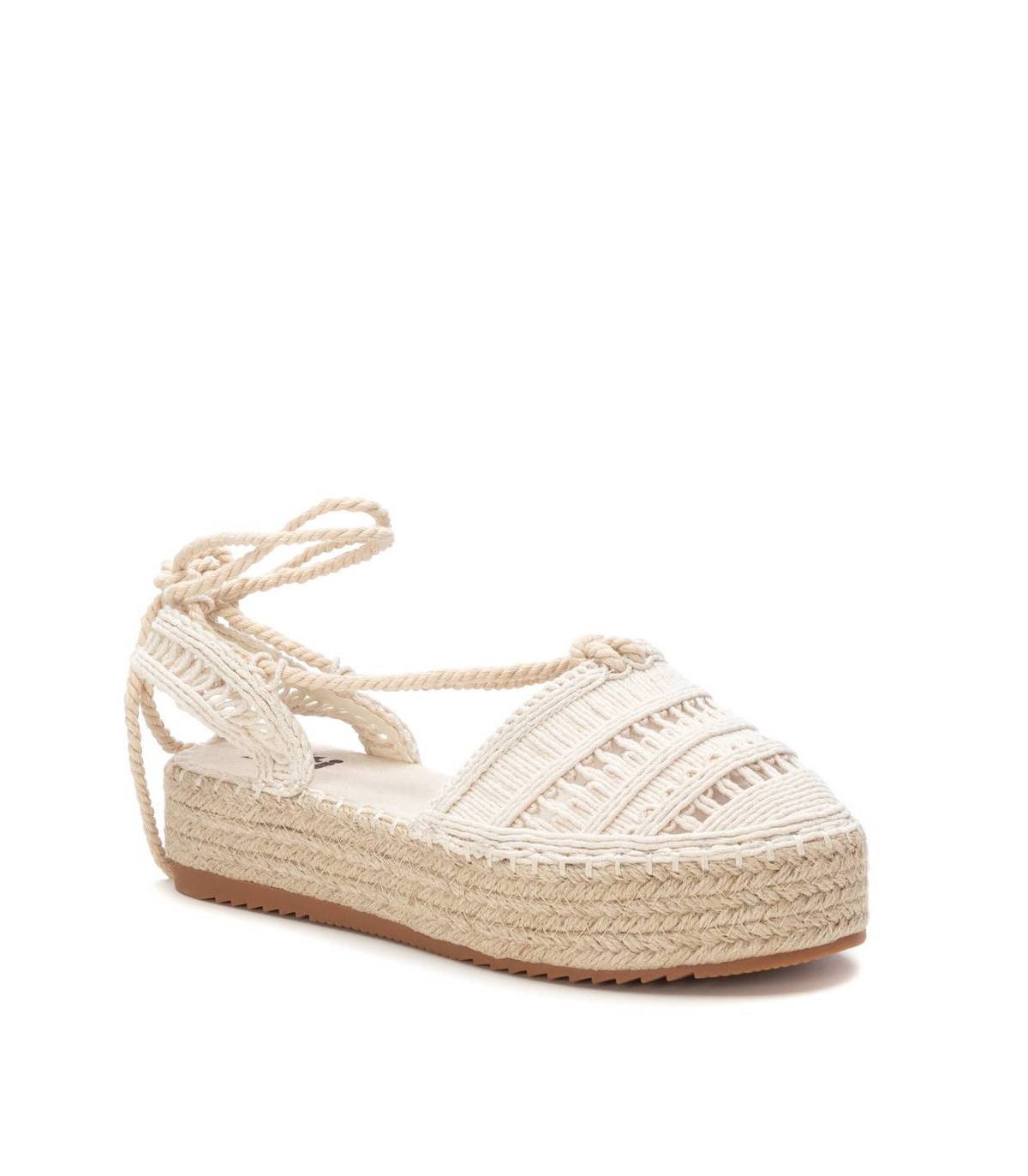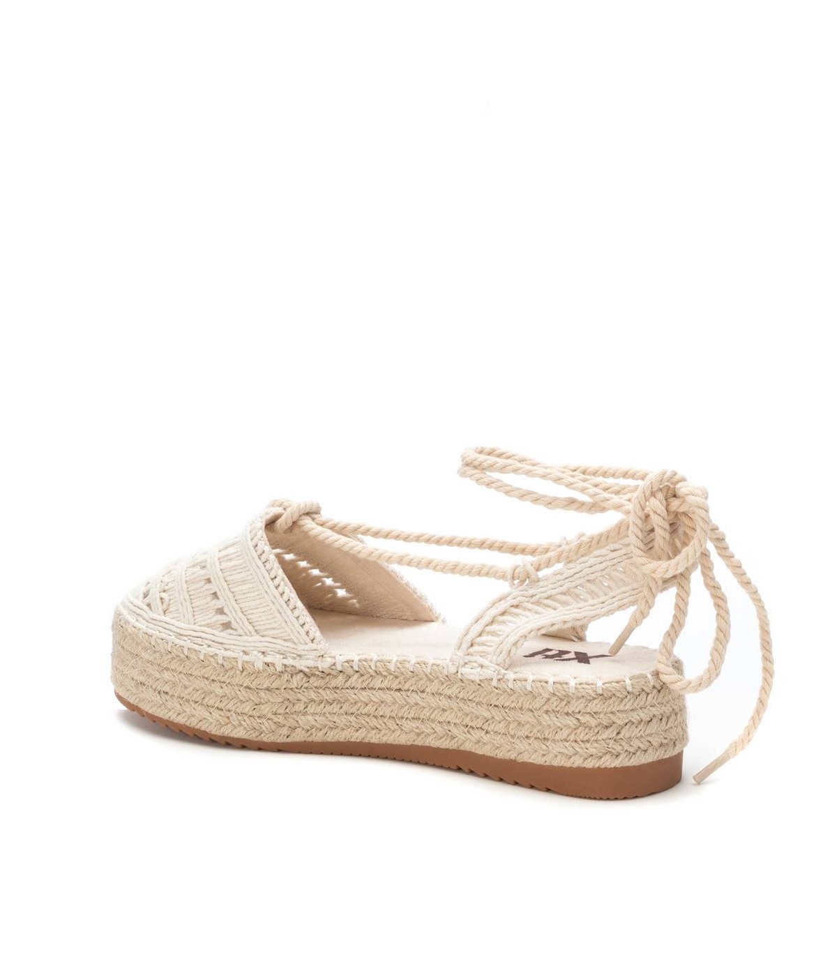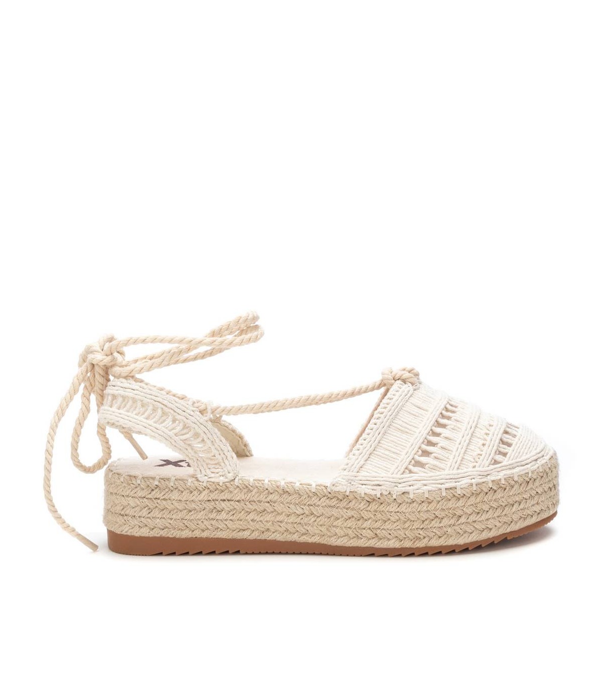 Zapato de mujer con plataforma plana tipo valenciana, de la marca Xti. Fabricada en material textil estilo crochet. Tira atada al tobillo al tono. Cuña de yute con suela de goma antideslizante.