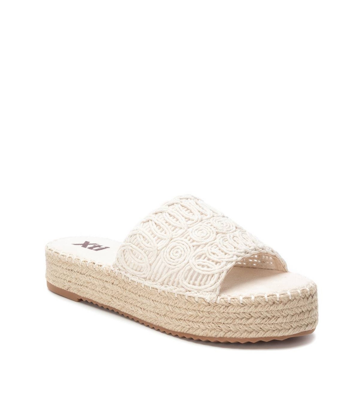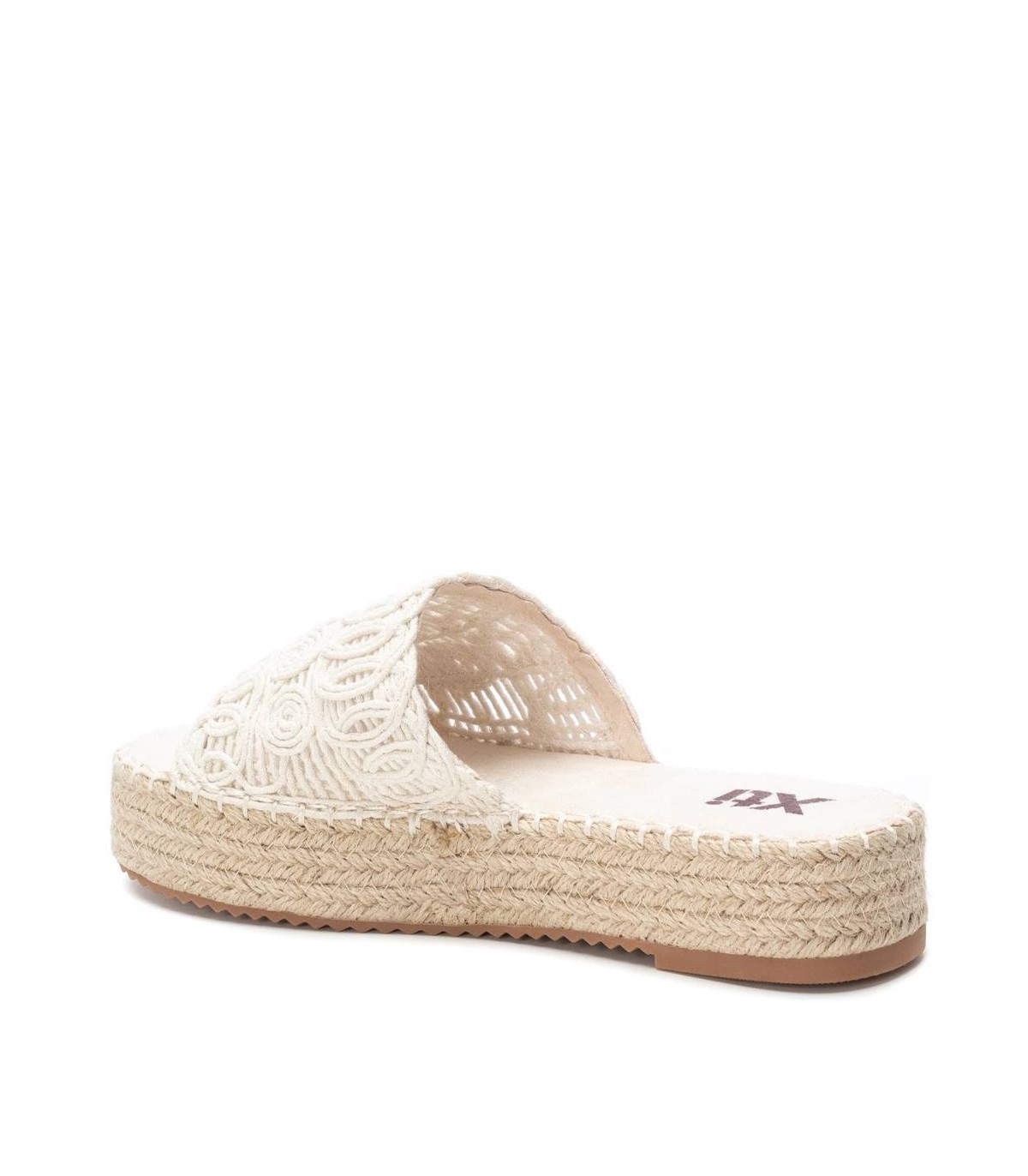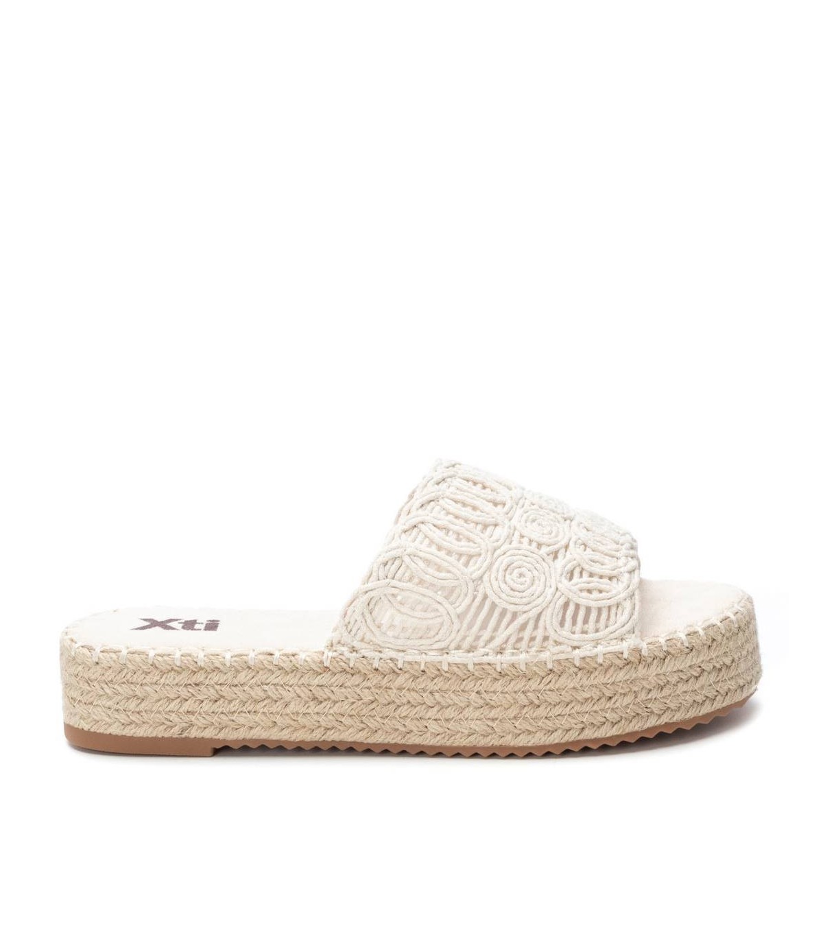 Sandalia de mujer, de la marca Xti Basic. Modelo de pala ancha fabricado en material textil con un bonito diseño. Plataforma plana recubierta de yute con suela de goma antideslizante.