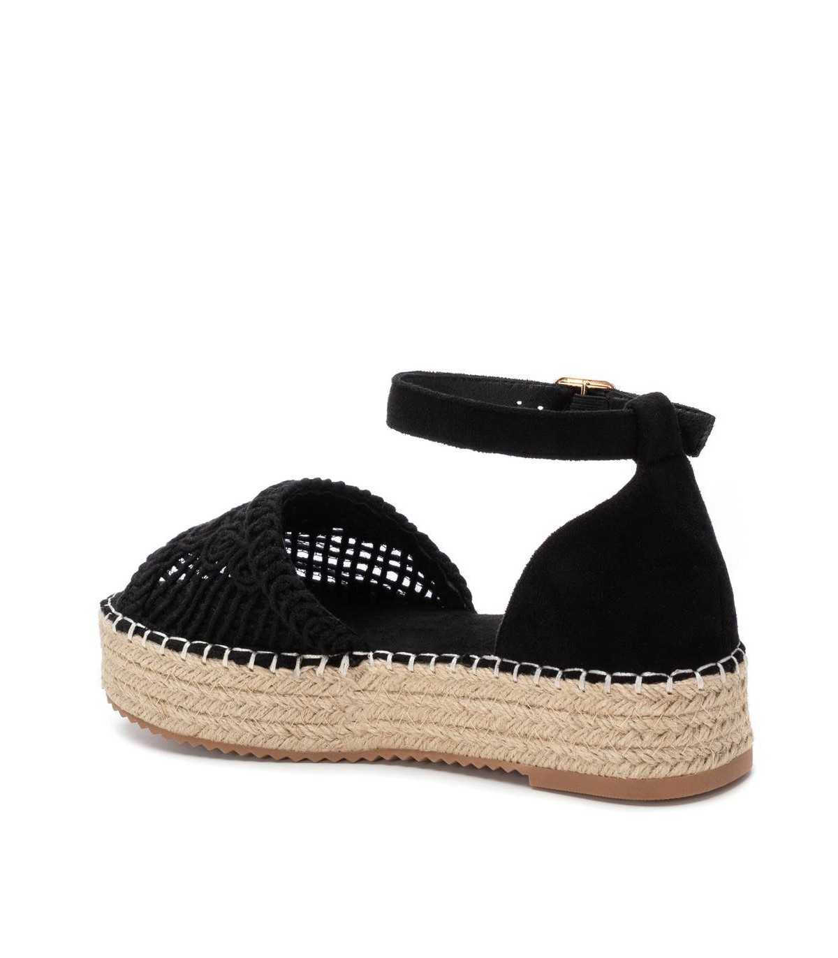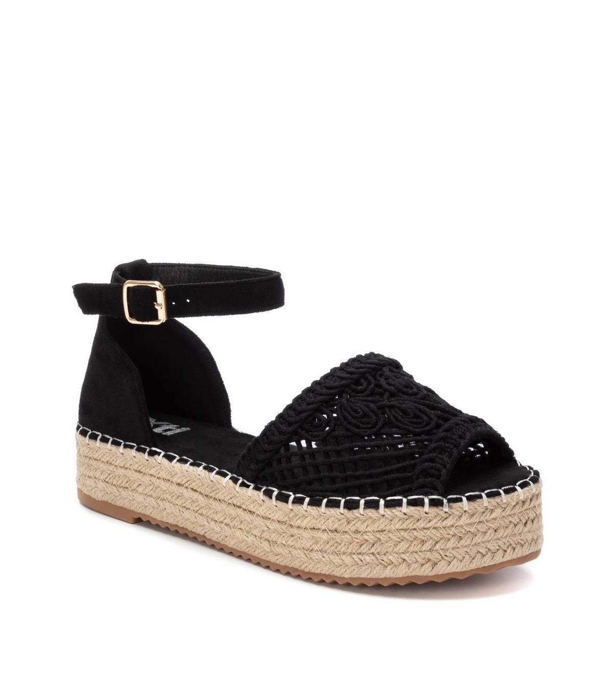 Sandalia de mujer con plataforma plana, de la marca Xti. Fabricada en material textil estilo crochet. Talón con pulsera para sujeción al tobillo. Cuña de yute con suela de goma antideslizante.