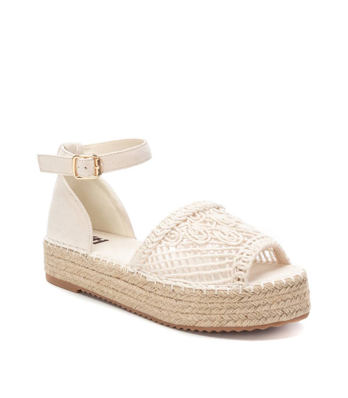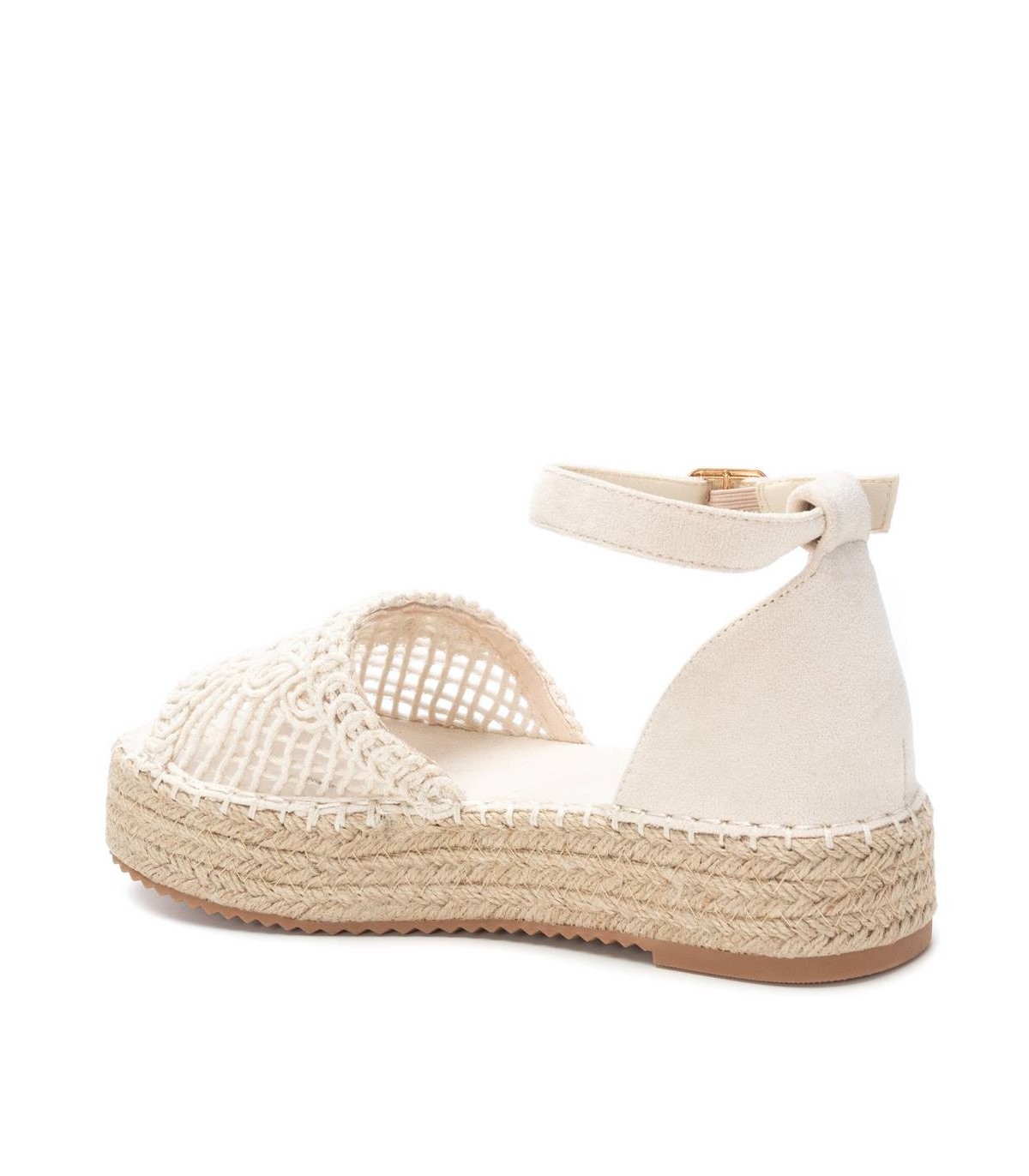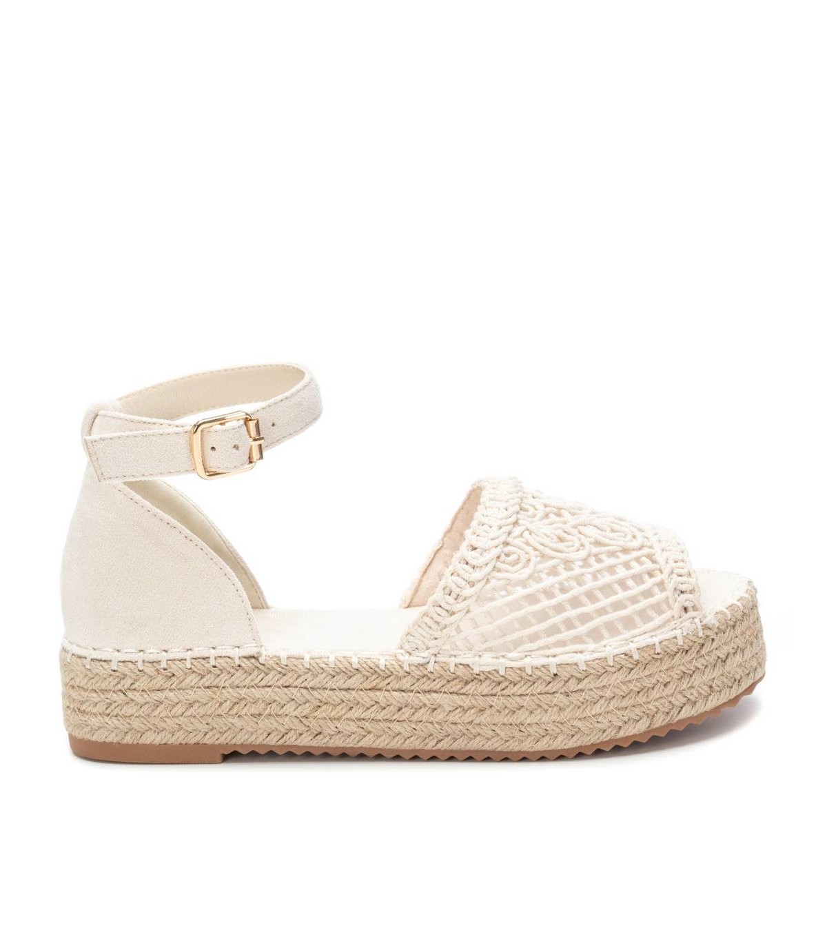 Sandalia de mujer con plataforma plana, de la marca Xti. Fabricada en material textil estilo crochet. Talón con pulsera para sujeción al tobillo. Cuña de yute con suela de goma antideslizante.
