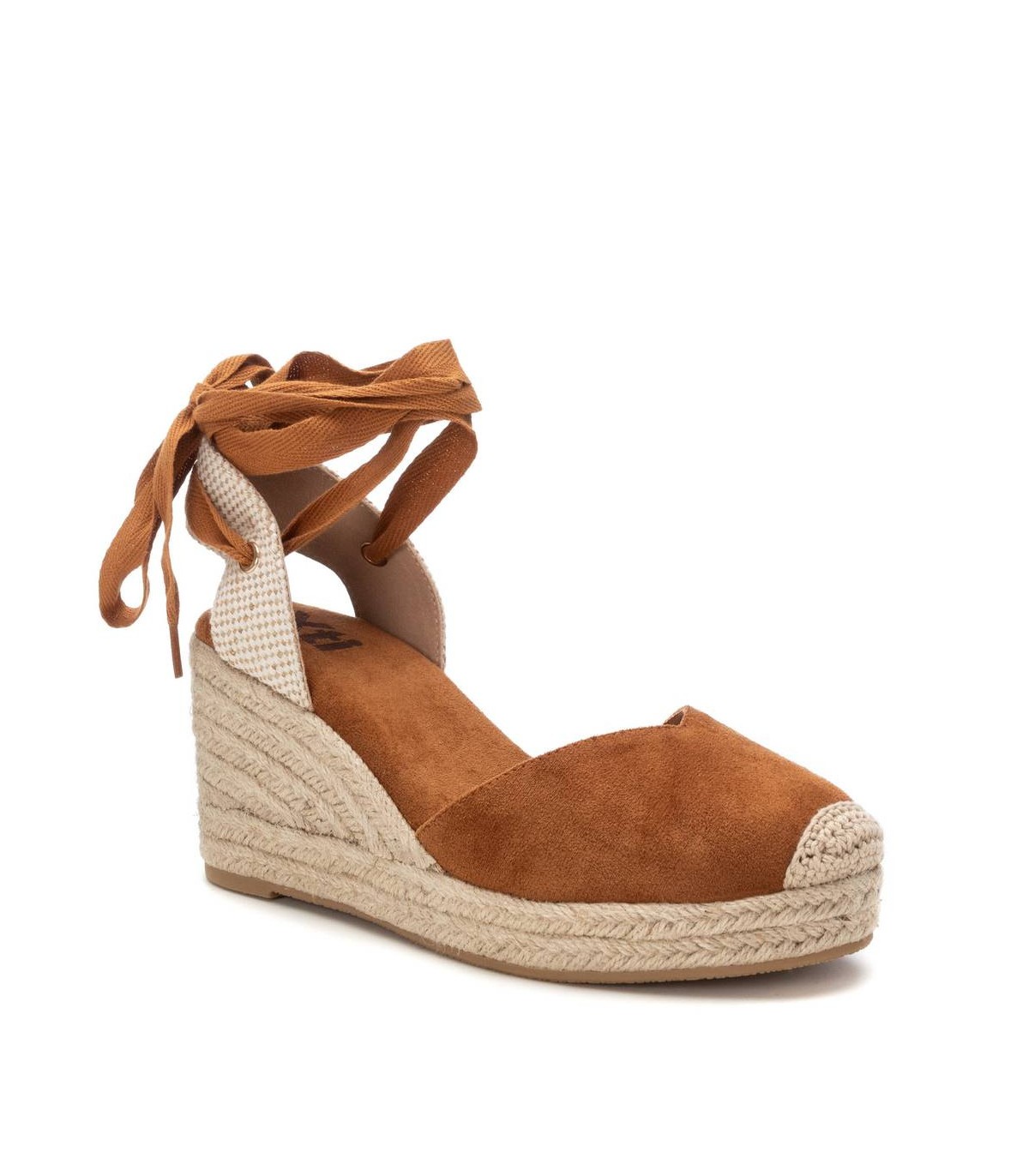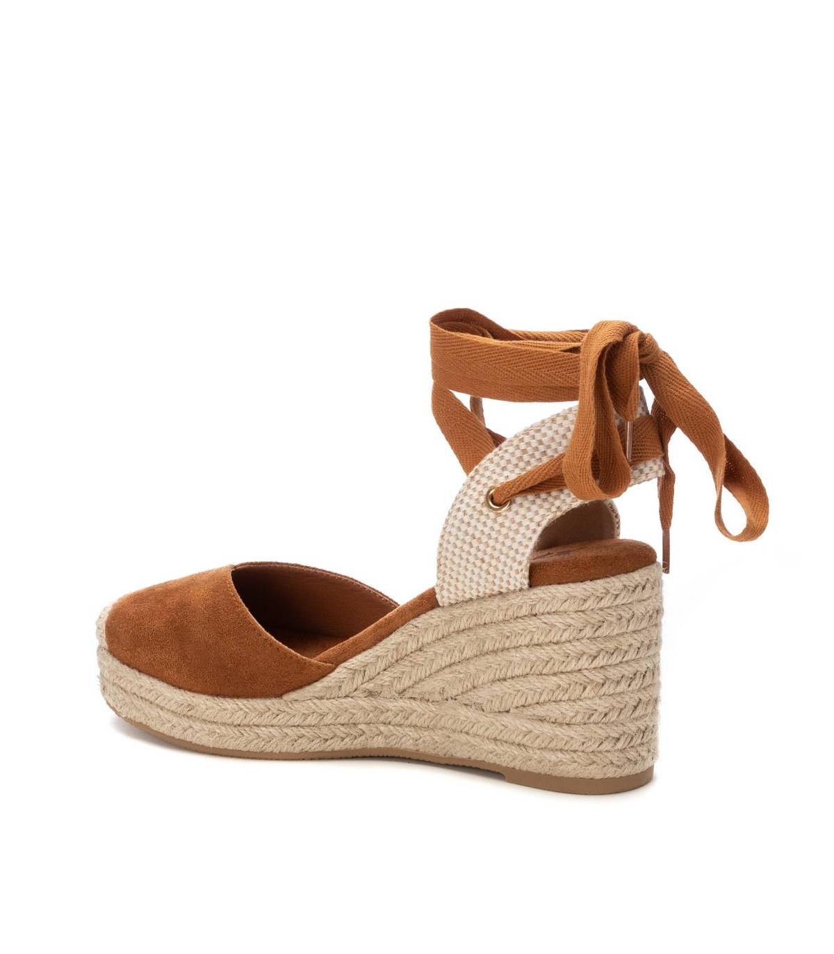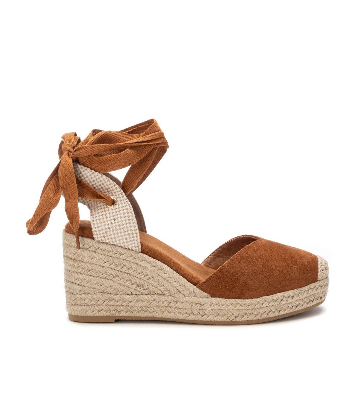 Zapato de mujer con cuña tipo valenciana, de la marca Xti. Fabricada en material textil. Tira atada al tobillo al tono. Cuña de yute con suela de goma antideslizante.