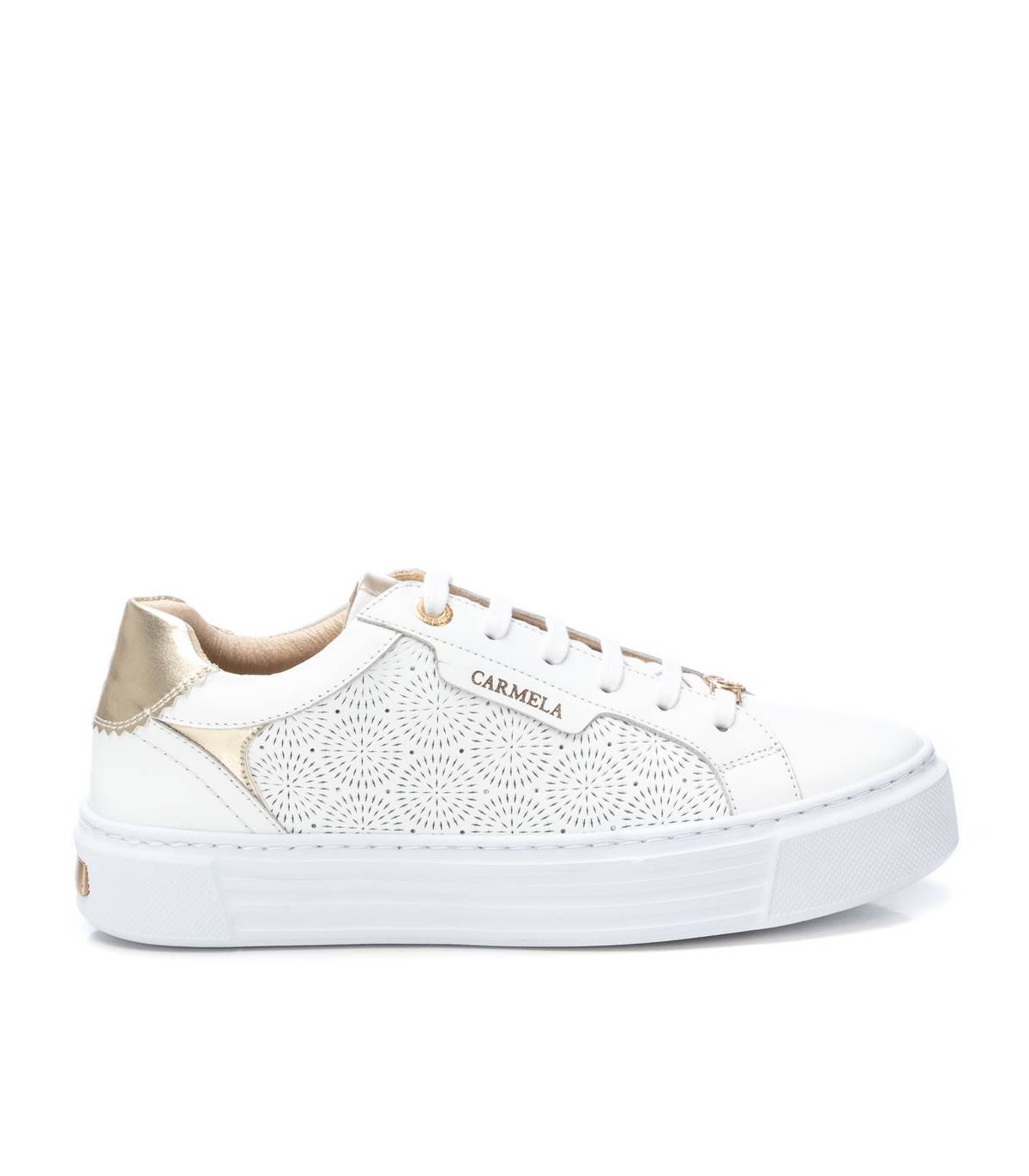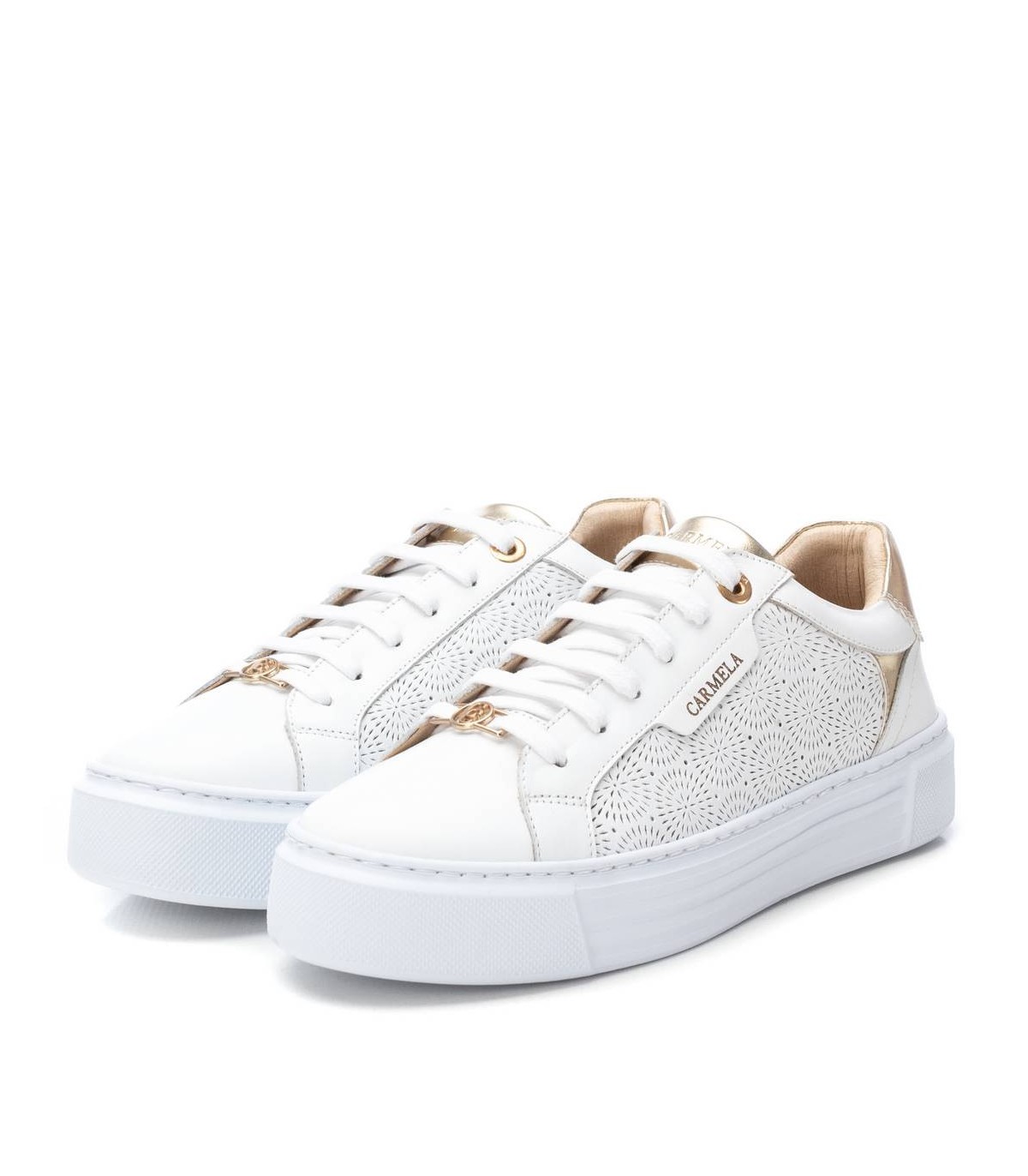 Zapatilla de mujer, marca Carmela. Fabricada en piel de alta calidad. Cierre mediante cordones ajustables para mayor comodidad. Diseño calado decorativo en los laterales. Comodidad y sencillez para esta temporada. Cómoda planta, suela antideslizante. Con plantilla extraíble.
