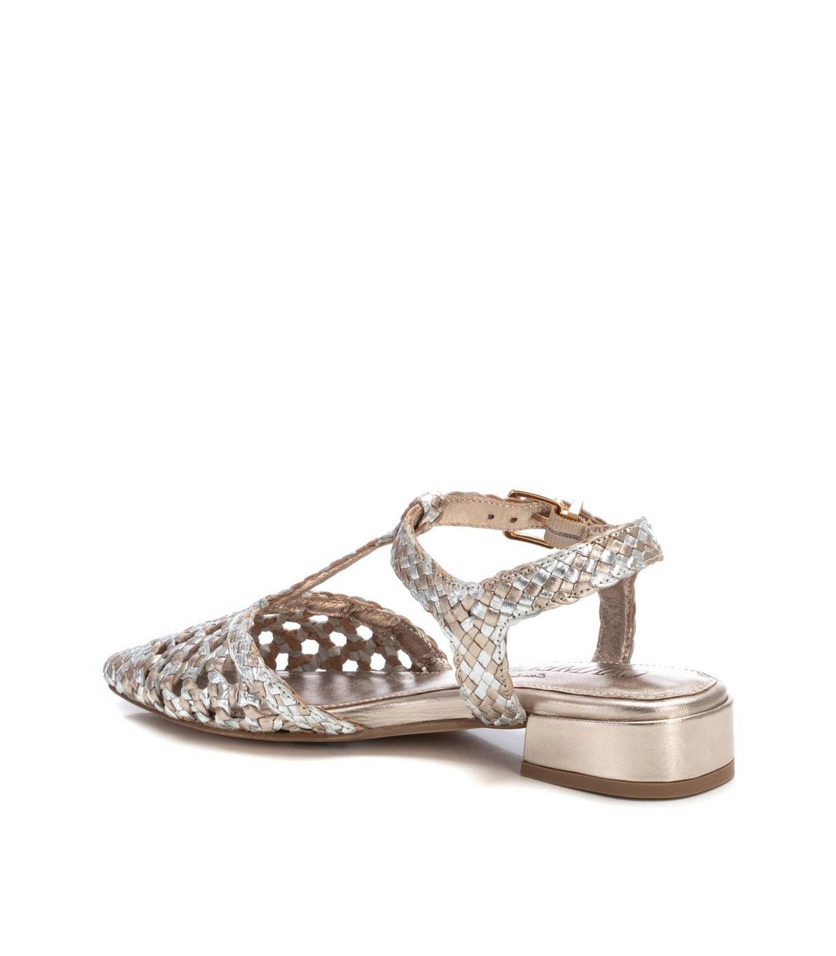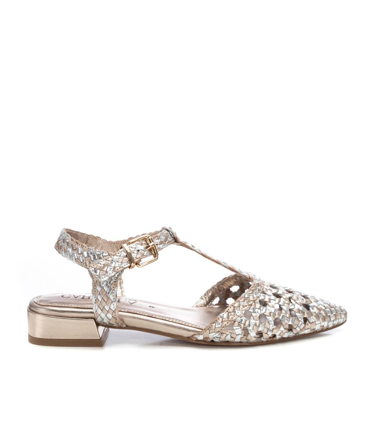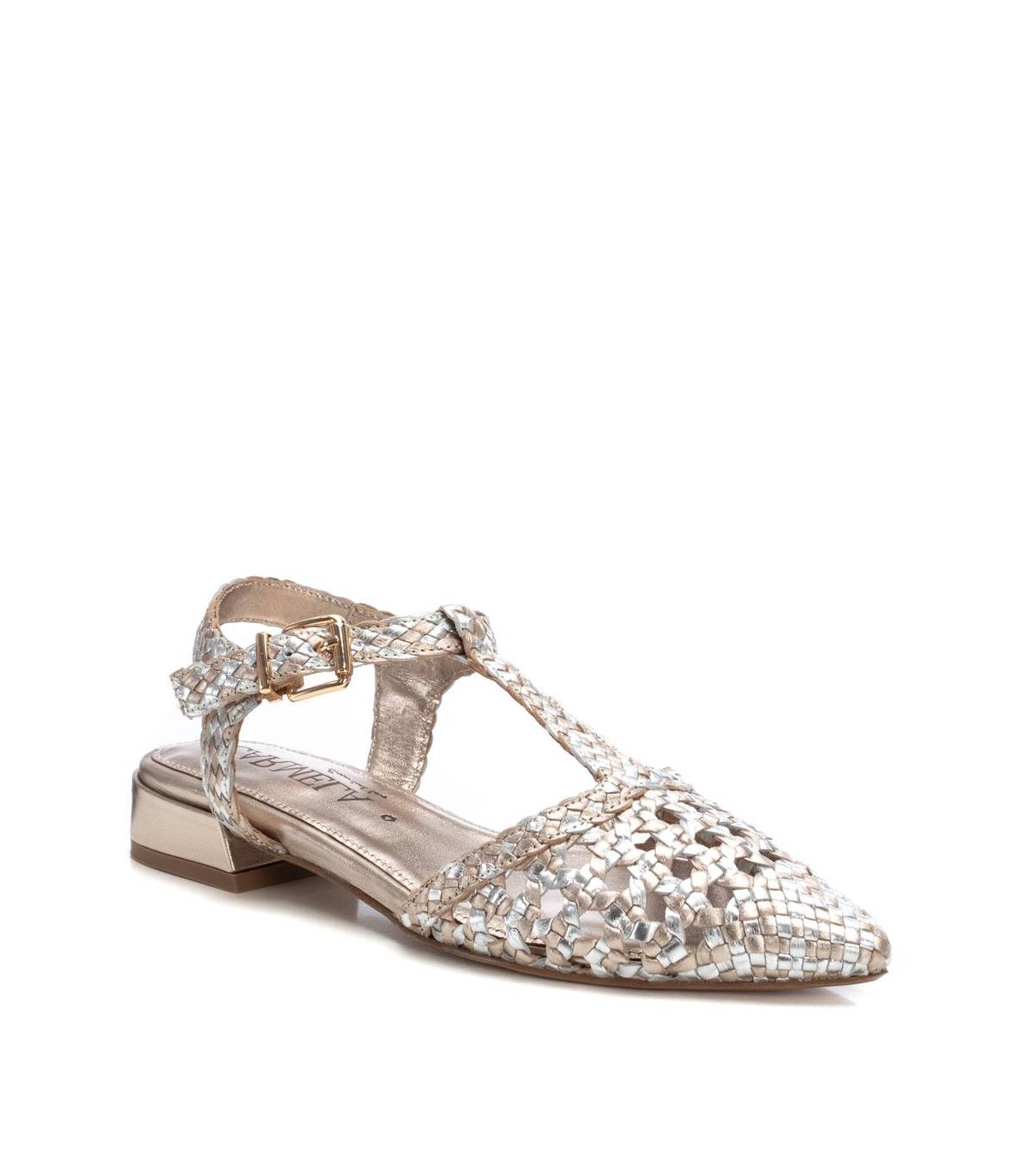 Bailarina de mujer, marca Carmela. Fabricada en piel de alta calidad, diseño trenzado con acabado metalizado. Cierre mediante correa al tobillo con hebilla. Suela de goma antideslizante.