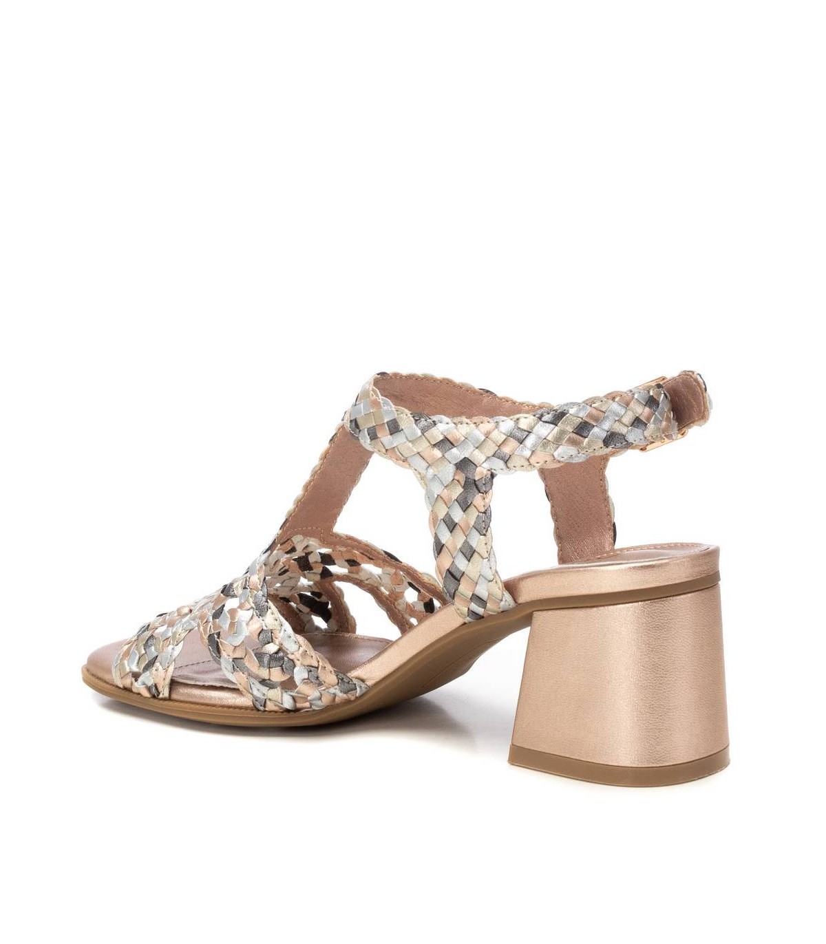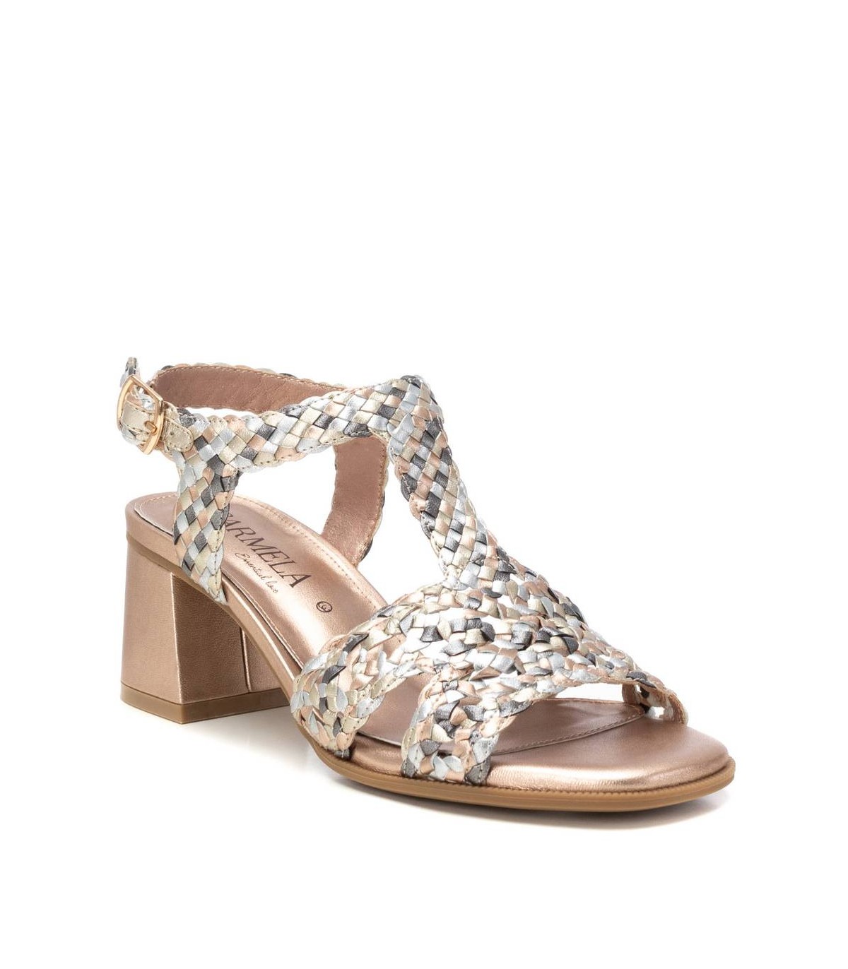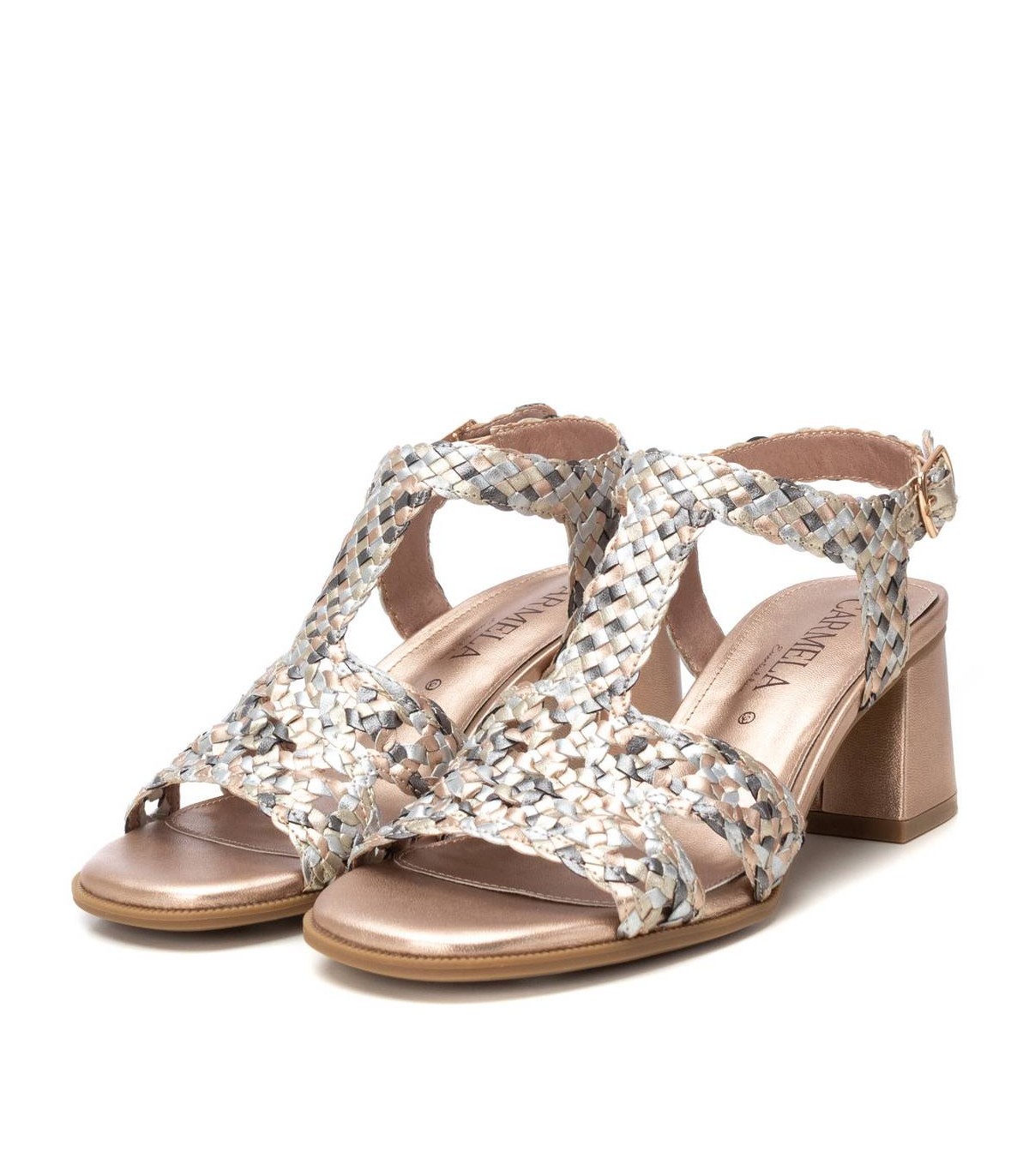 Sandalia de mujer, de la marca Carmela. Fabricada en piel de alta calidad. Acabado metálico. Diseño de palas y correa al tobillo con hebilla ajustables. Tacón ancho de 6 cm y cómoda planta acolchada. Suela de goma antideslizante.