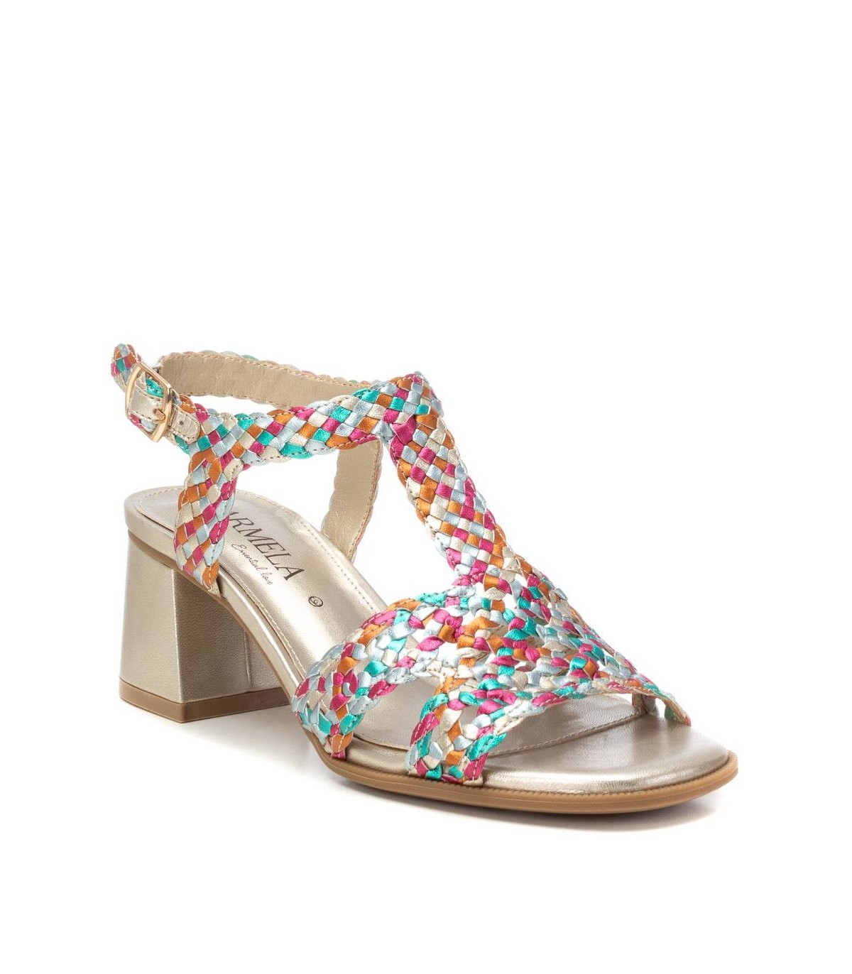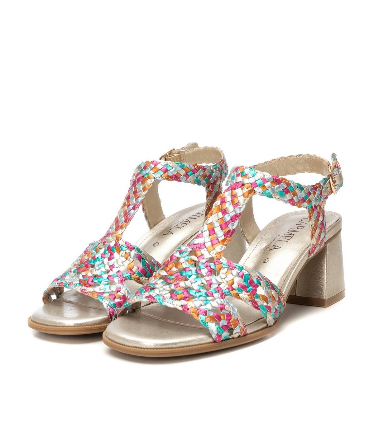 Sandalia de mujer, de la marca Carmela. Fabricada en piel de alta calidad. Acabado metálico. Diseño de palas y correa al tobillo con hebilla ajustables. Tacón ancho de 6 cm y cómoda planta acolchada. Suela de goma antideslizante.