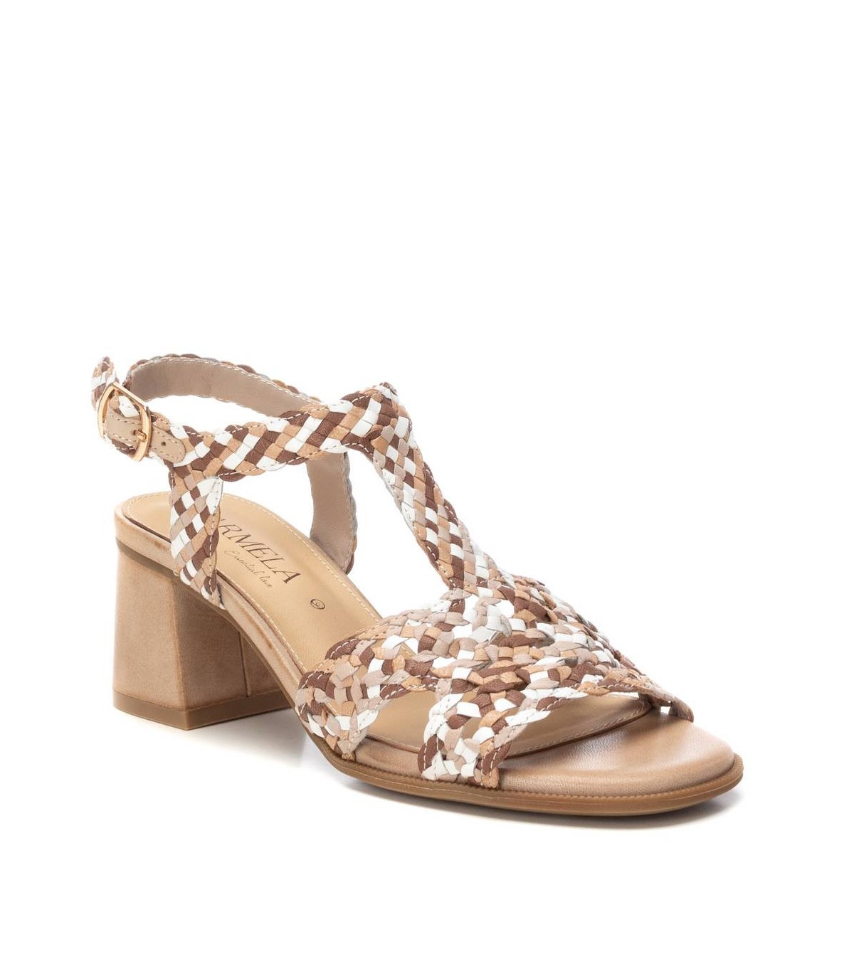 Sandalia de mujer, de la marca Carmela. Fabricada en piel de alta calidad. Acabado metálico. Diseño de palas y correa al tobillo con hebilla ajustables. Tacón ancho de 6 cm y cómoda planta acolchada. Suela de goma antideslizante.