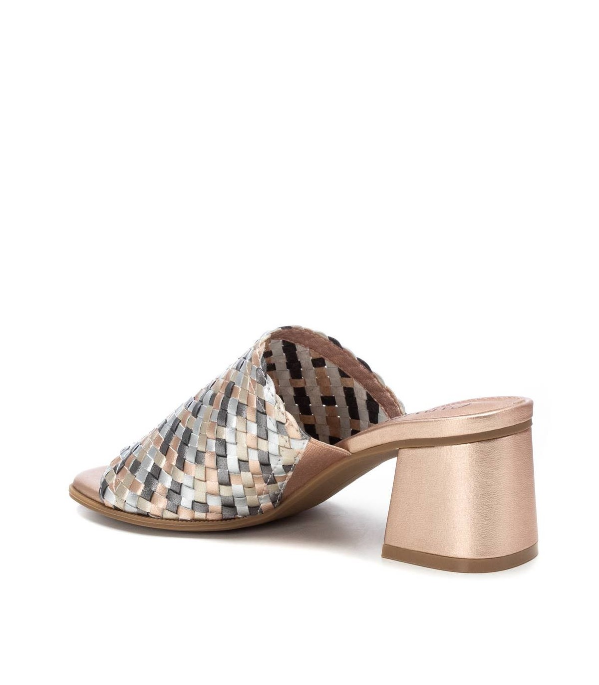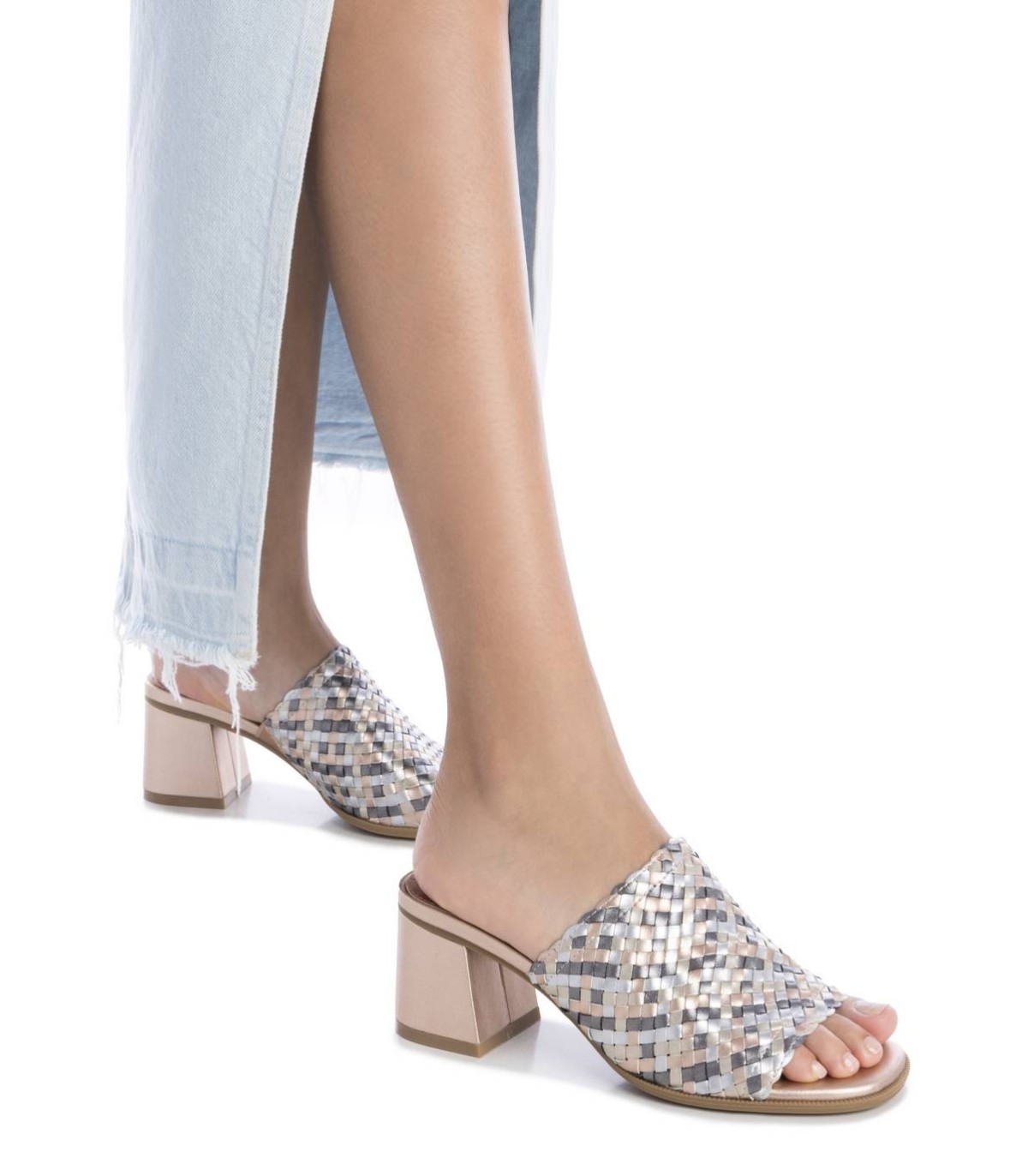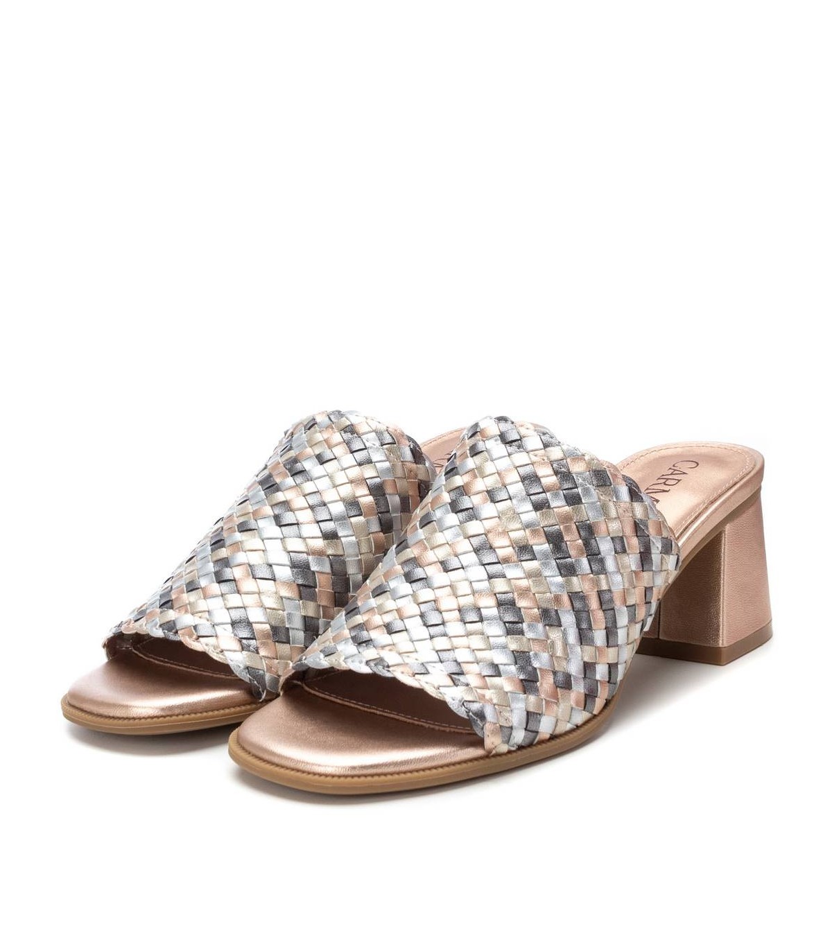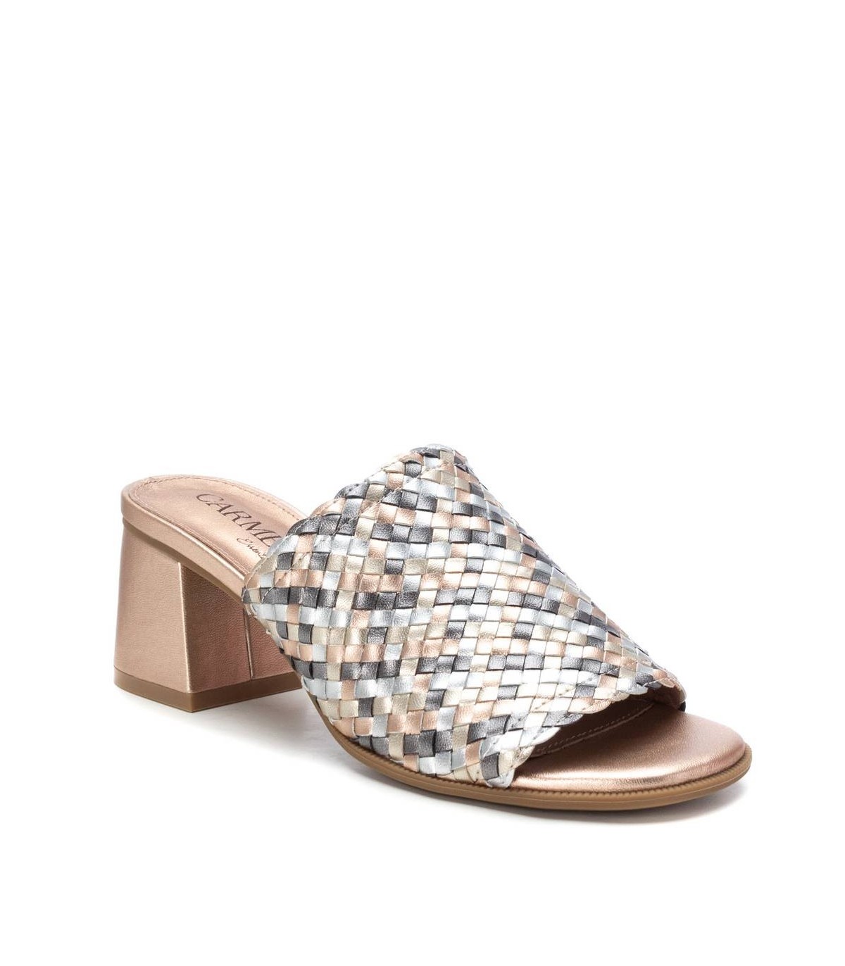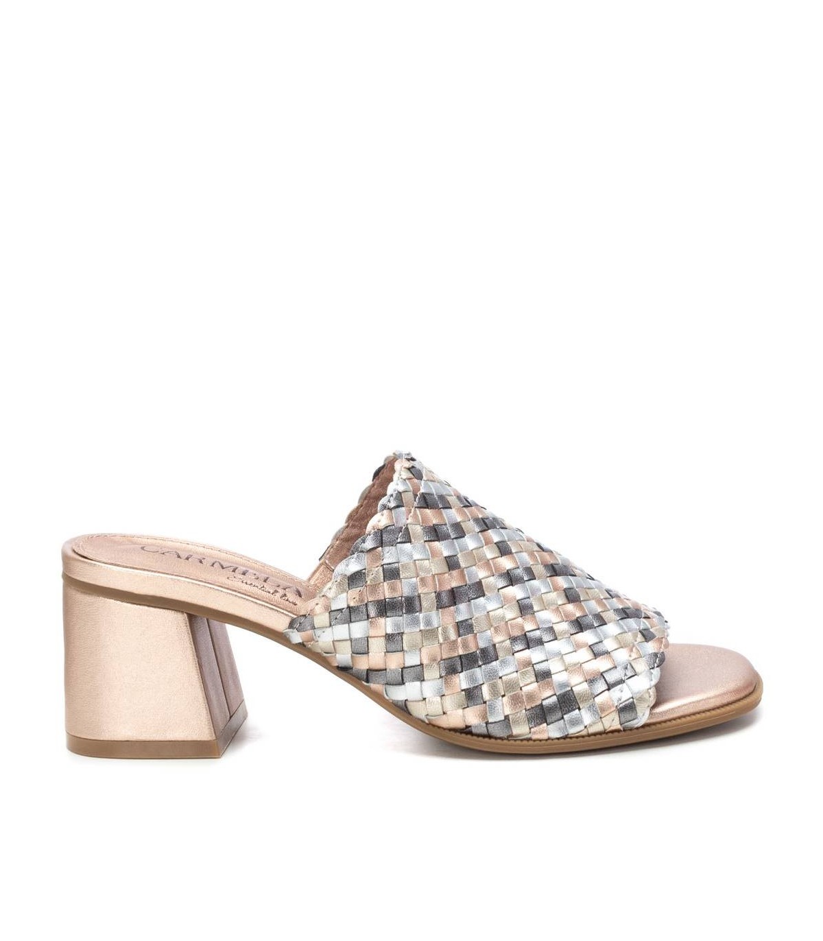 Sandalia de mujer, marca Carmela. Fabricada en piel de alta calidad, decorada con un trenzado en acabado metálico. Modelo de pala ancha con cómodo tacón. Suela de goma antideslizante.