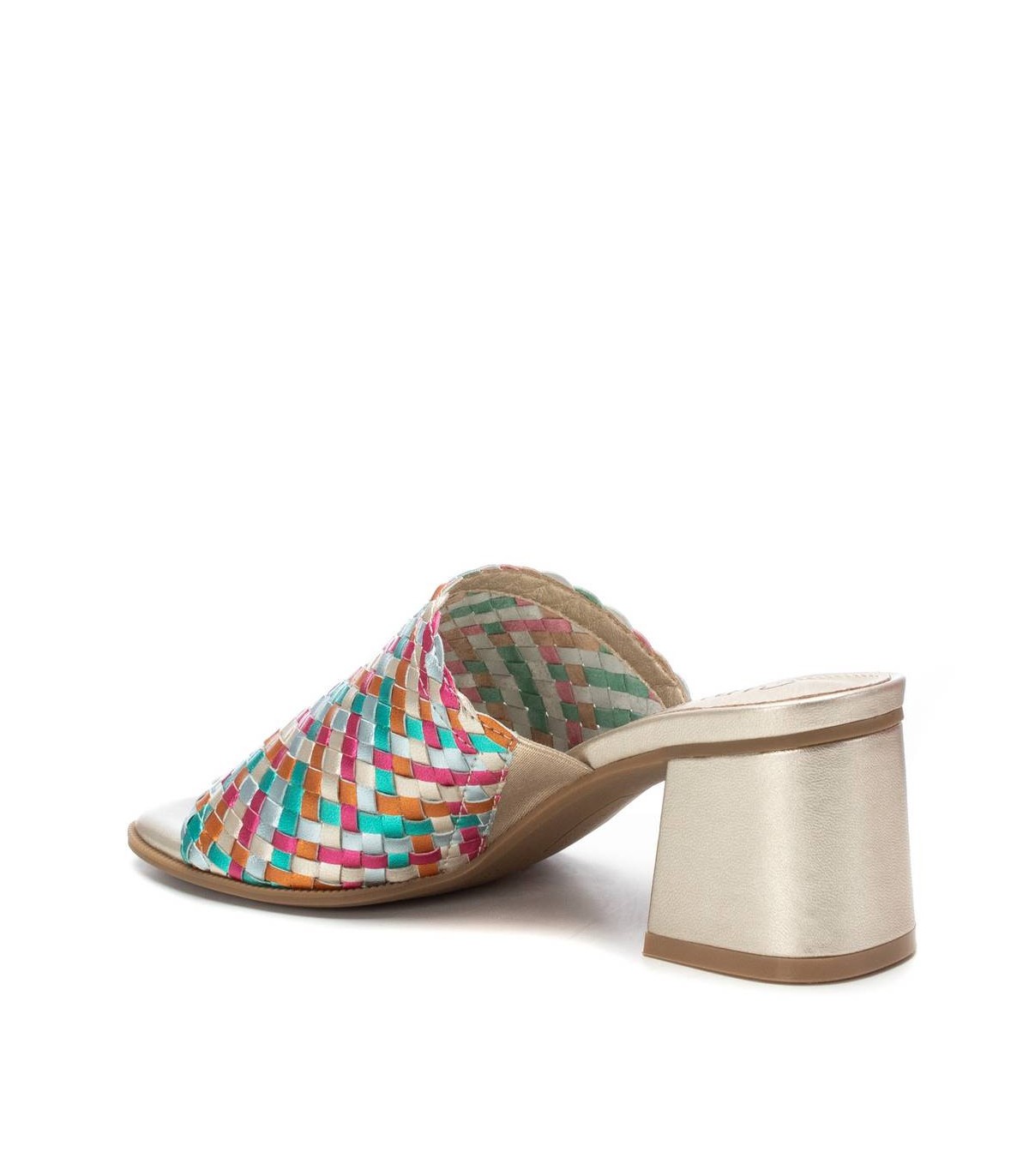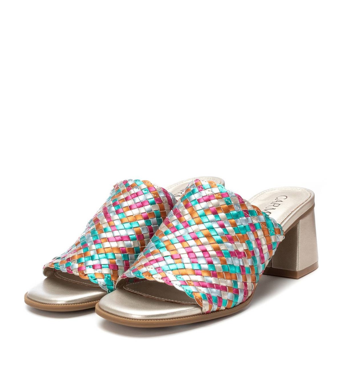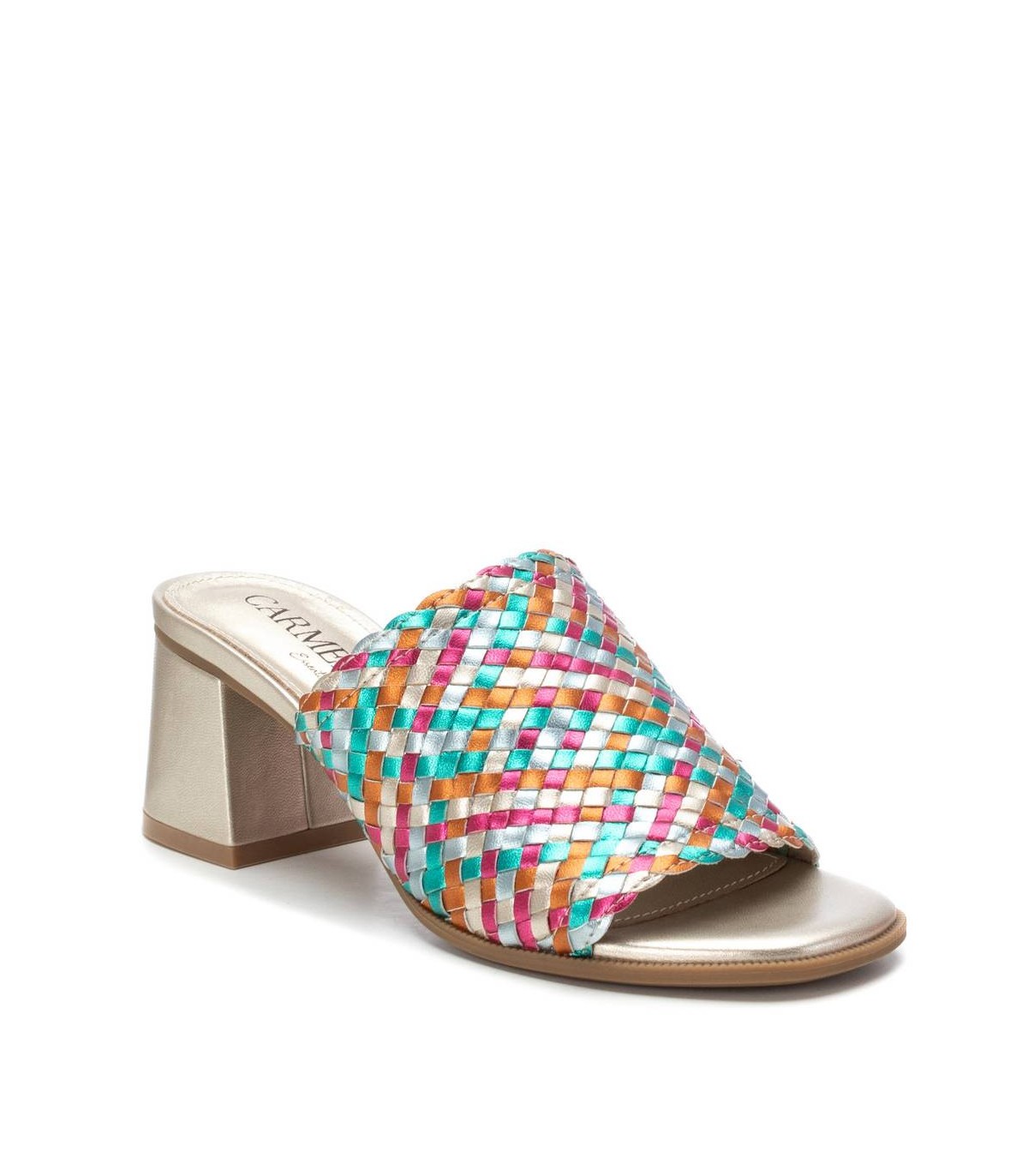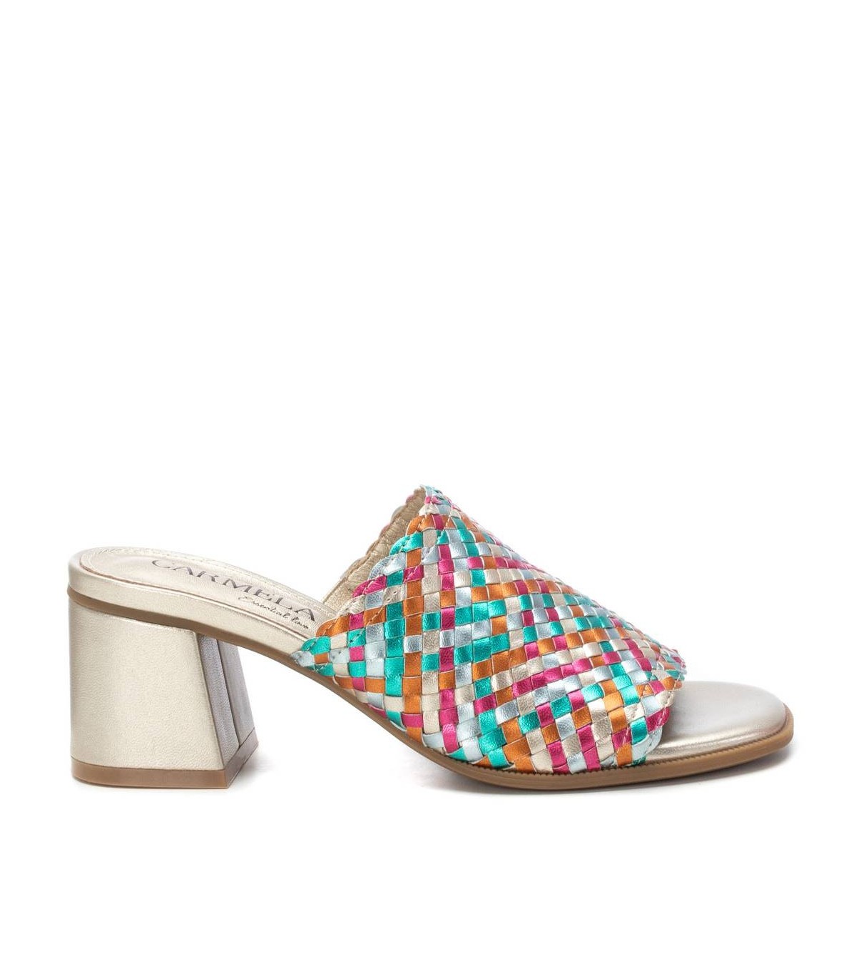 Sandalia de mujer, marca Carmela. Fabricada en piel de alta calidad, decorada con un trenzado en acabado metálico. Modelo de pala ancha con cómodo tacón. Suela de goma antideslizante.