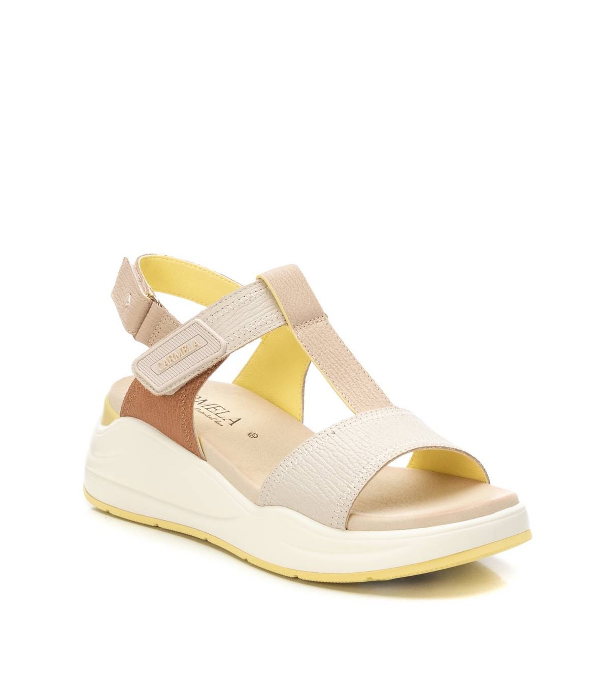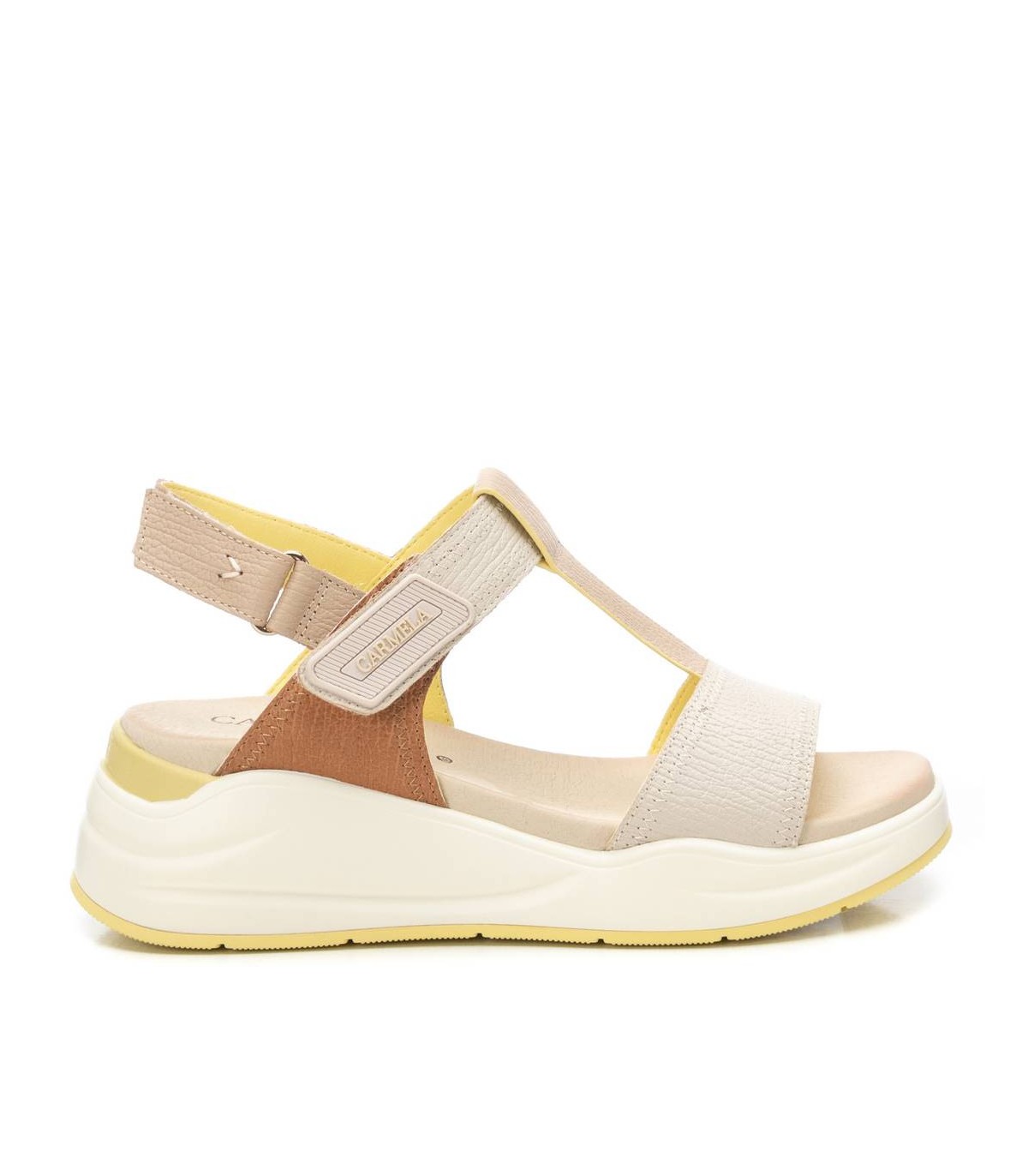 Sandalia de mujer, marca Carmela. Fabricada en piel de alta calidad. Modelo estiloso y cómodo. Cierre mediante tira adherente para mayor sujeción. Cómoda planta y suela antideslizante.