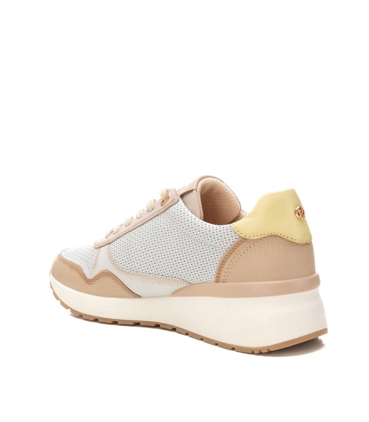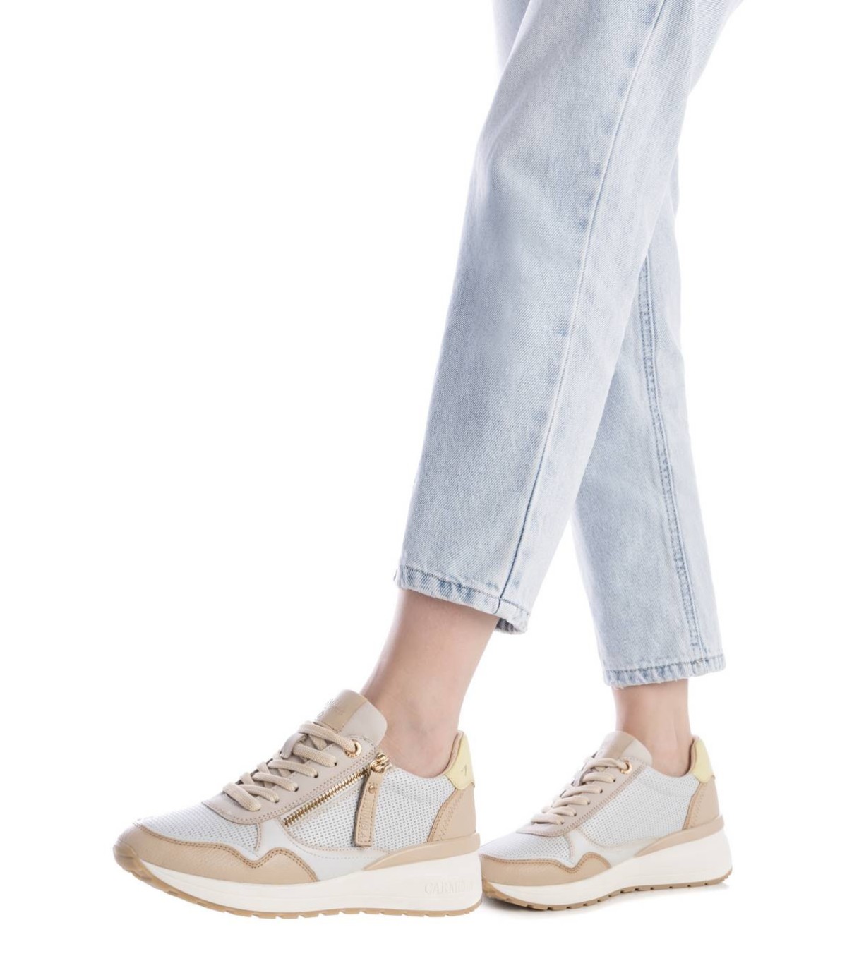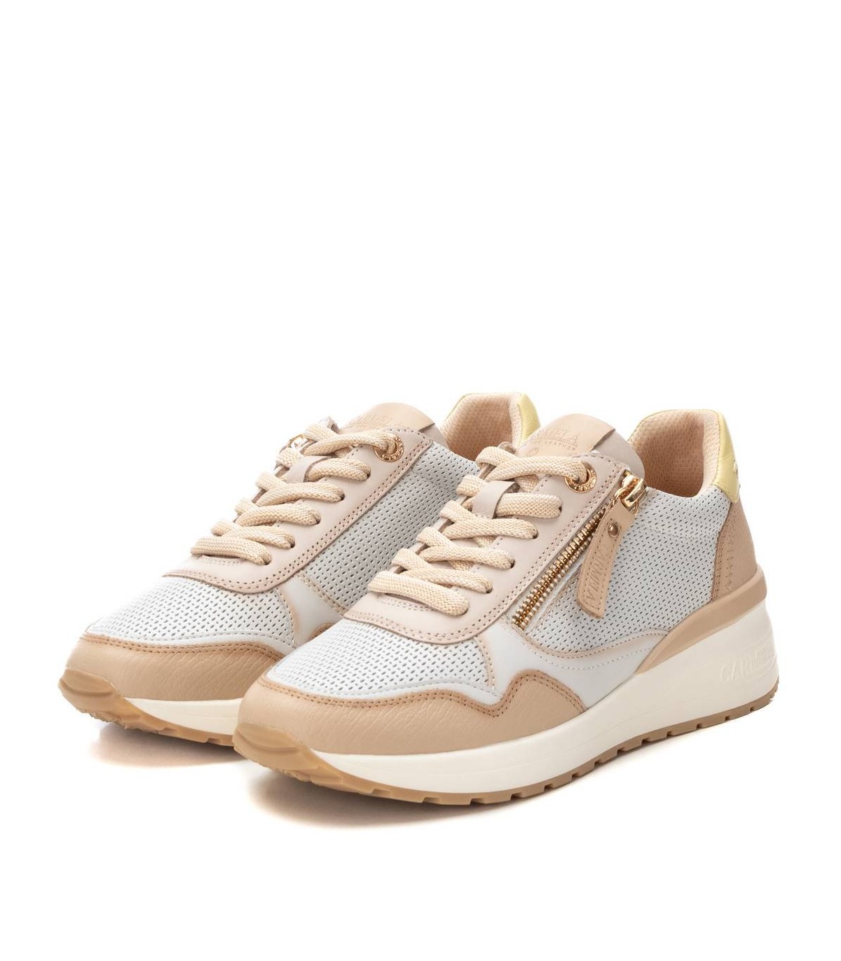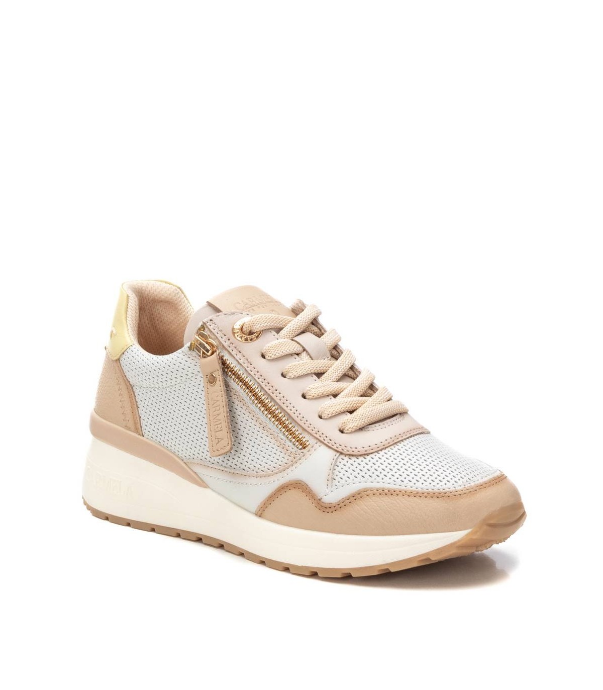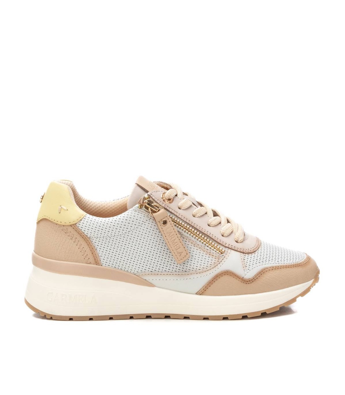 Zapatilla de mujer, marca Carmela. Fabricada en piel de alta calidad con detalles metalizados. Con plantilla extraíble. Cierre mediante cremallera lateral y cordones ajustables para mayor sujeción y ajuste. Cómoda cuña de 5 cm con suela dentada de goma antideslizante.