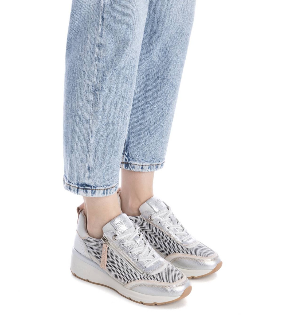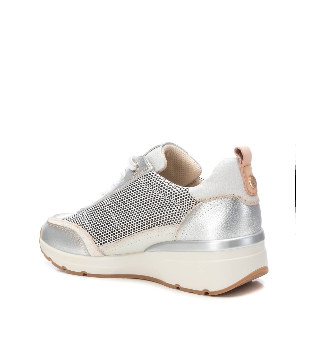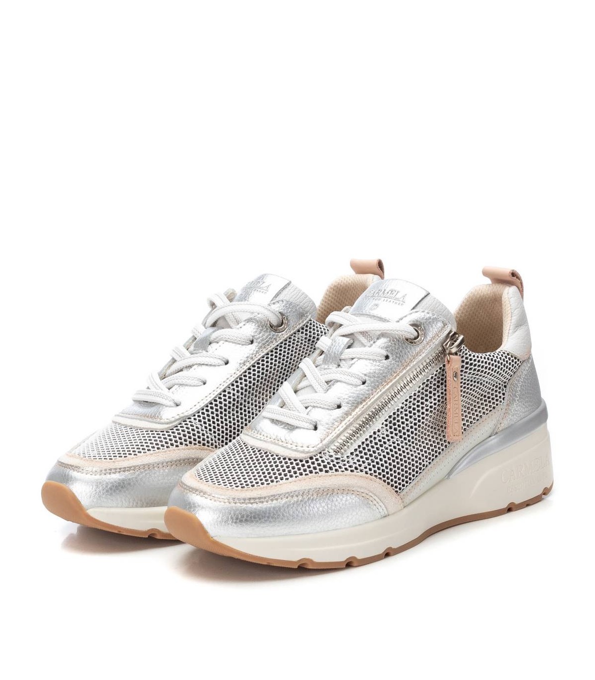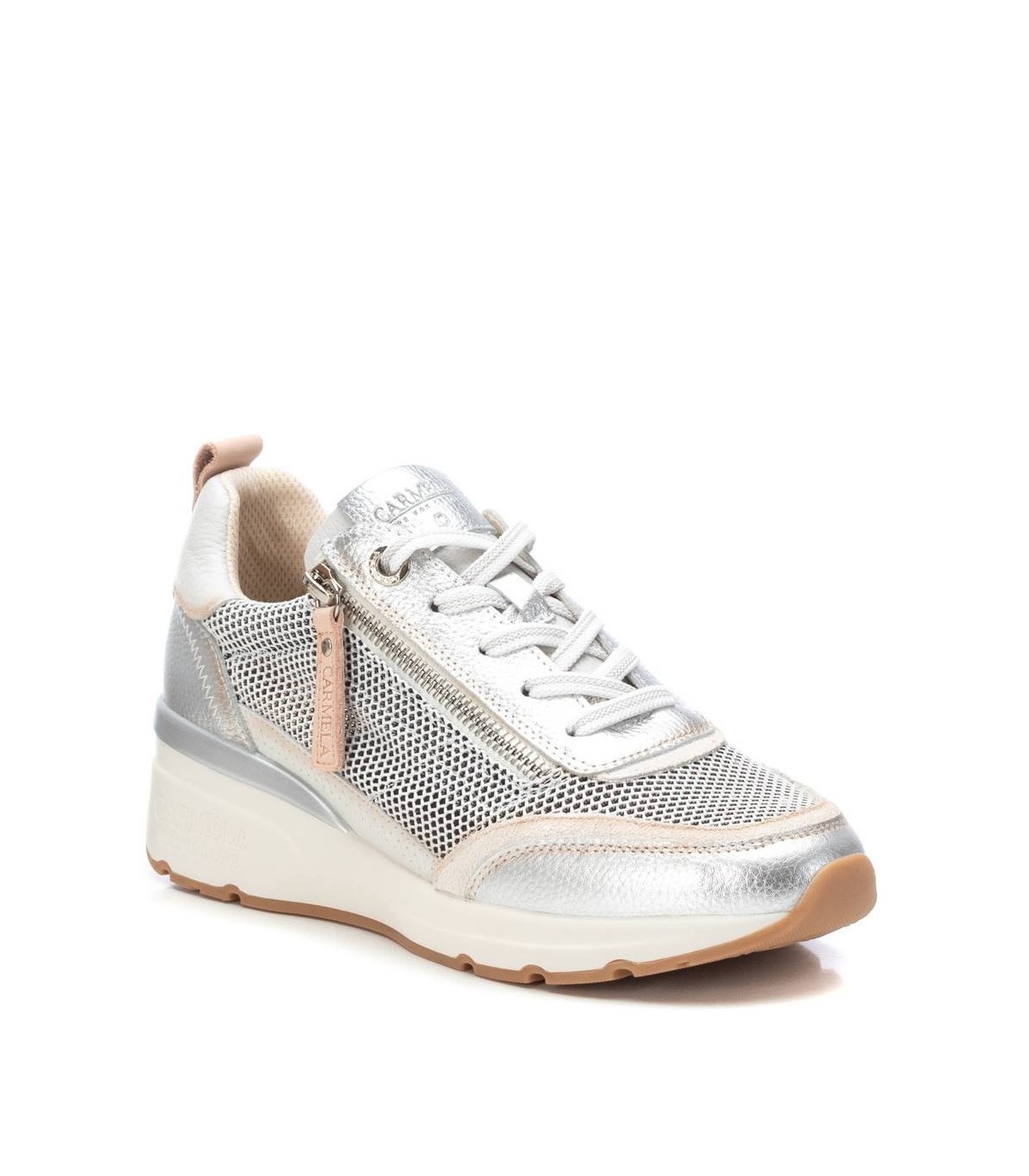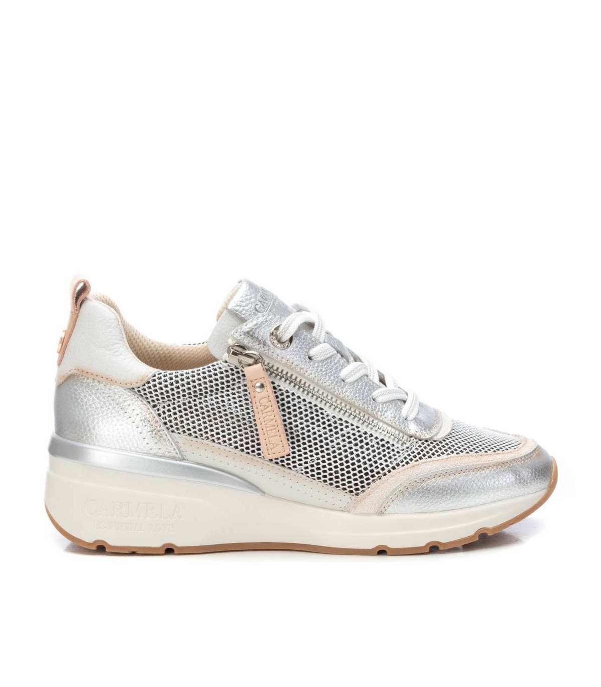 Zapatilla de mujer, marca Carmela. Fabricada en piel de alta calidad. Con plantilla extraíble. Diseño en rejilla, acompañada de toques metalizados. Sencilla pero elegante. Suela de goma antideslizante.