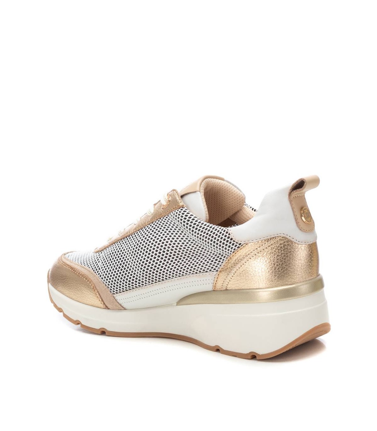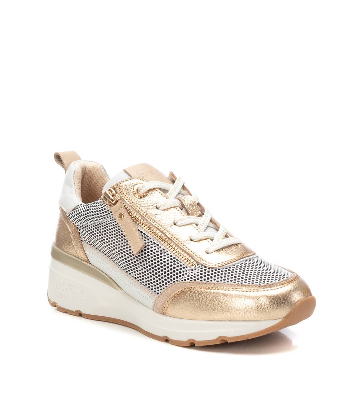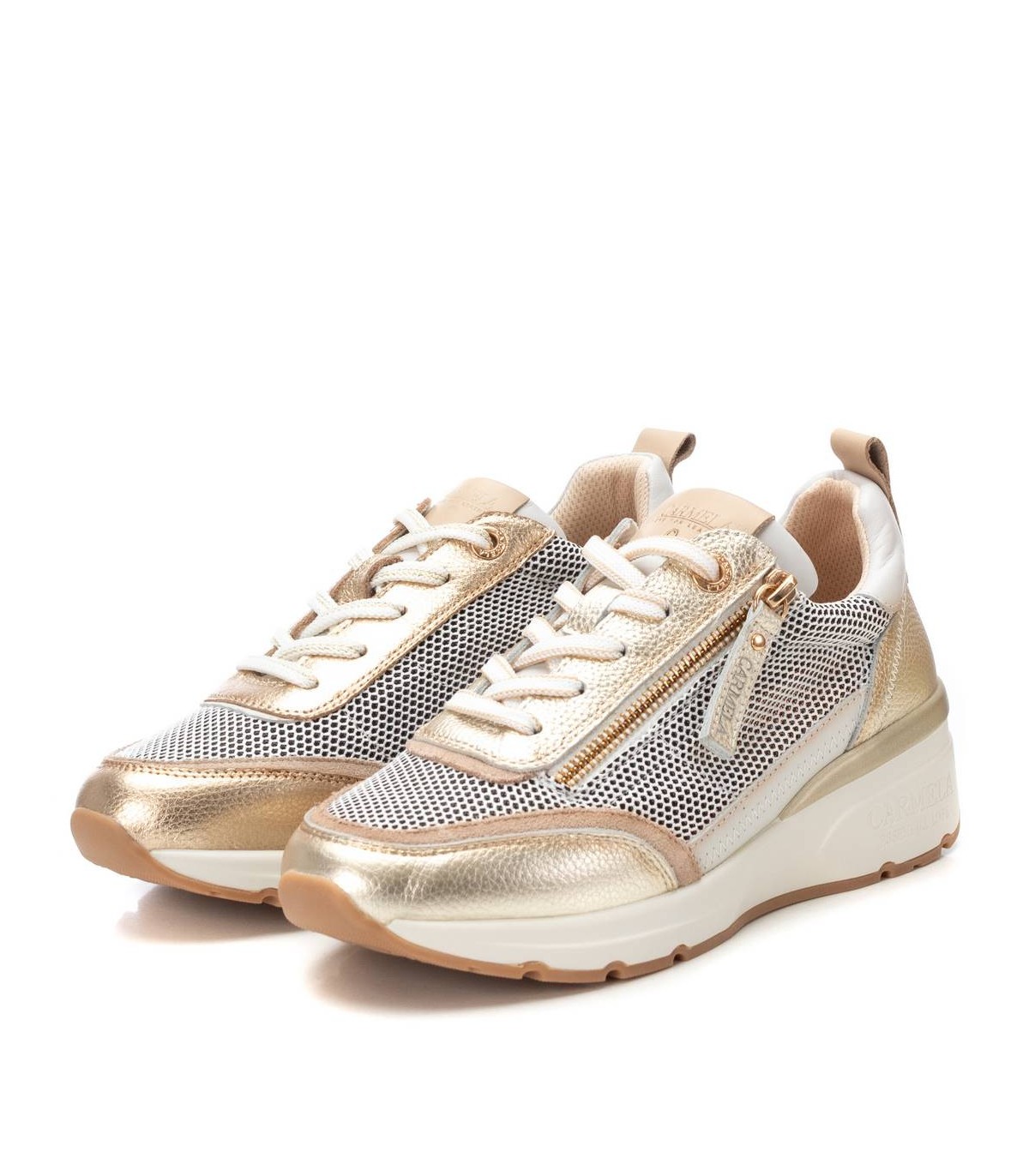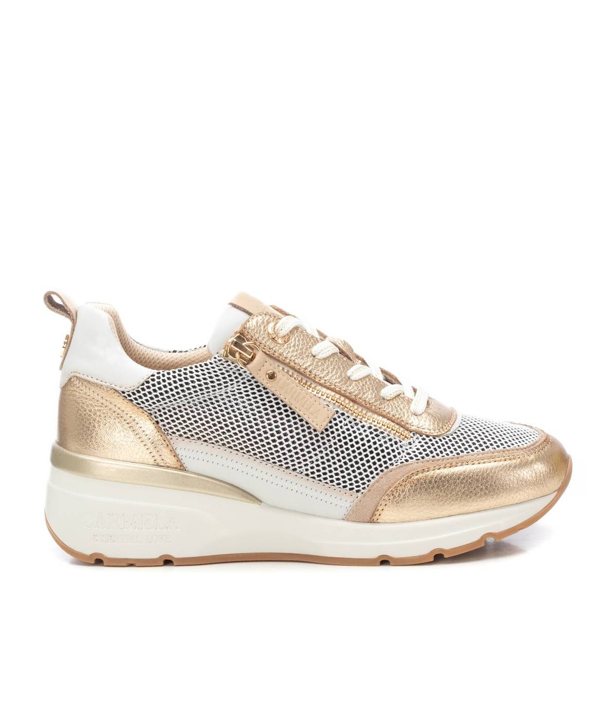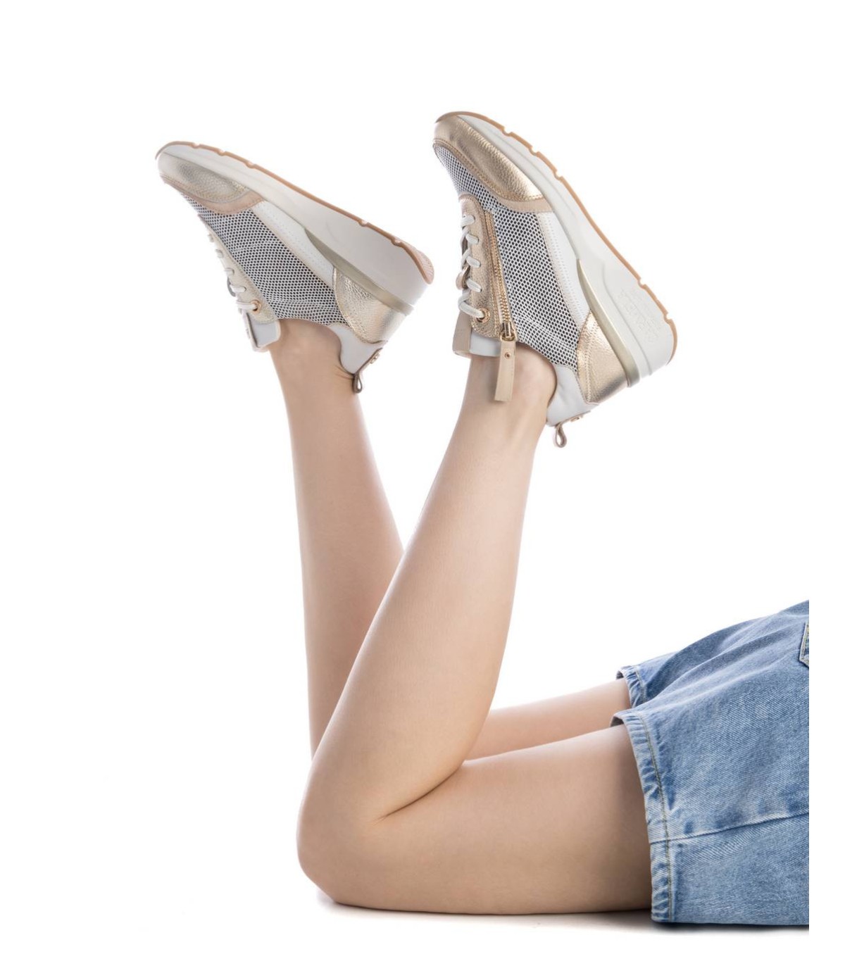 Zapatilla de mujer, marca Carmela. Fabricada en piel de alta calidad. Con plantilla extraíble. Diseño en rejilla, acompañada de toques metalizados. Sencilla pero elegante. Suela de goma antideslizante.